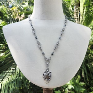The elegant Bronze findings, including ornate connectors and detailed spacers, add a touch of vintage charm. The pièce de résistance is the intricately crafted Bronze dragonfly pendant, hanging gracefully from a circular Bronze connector, adding a whimsical touch to this stunning necklace.