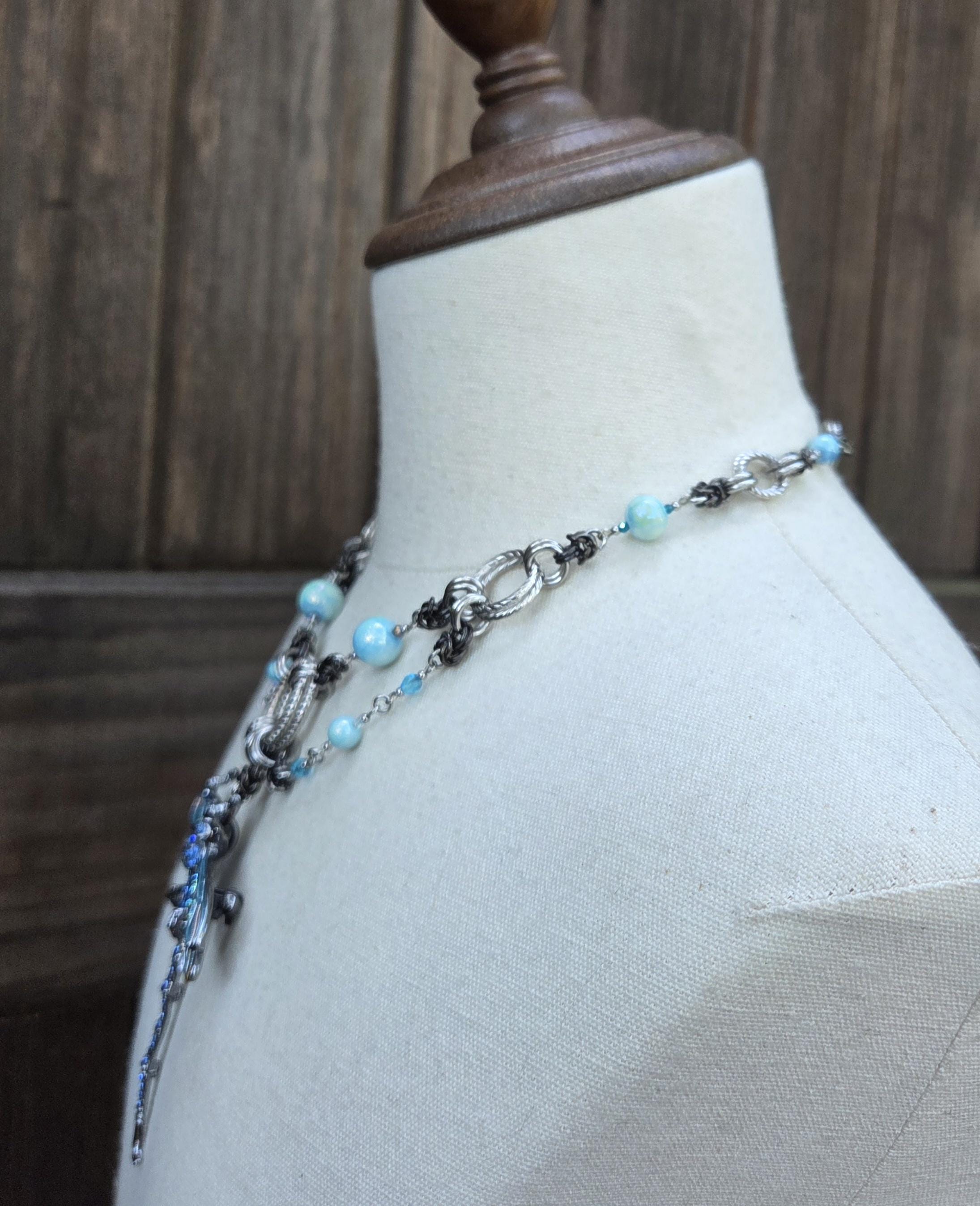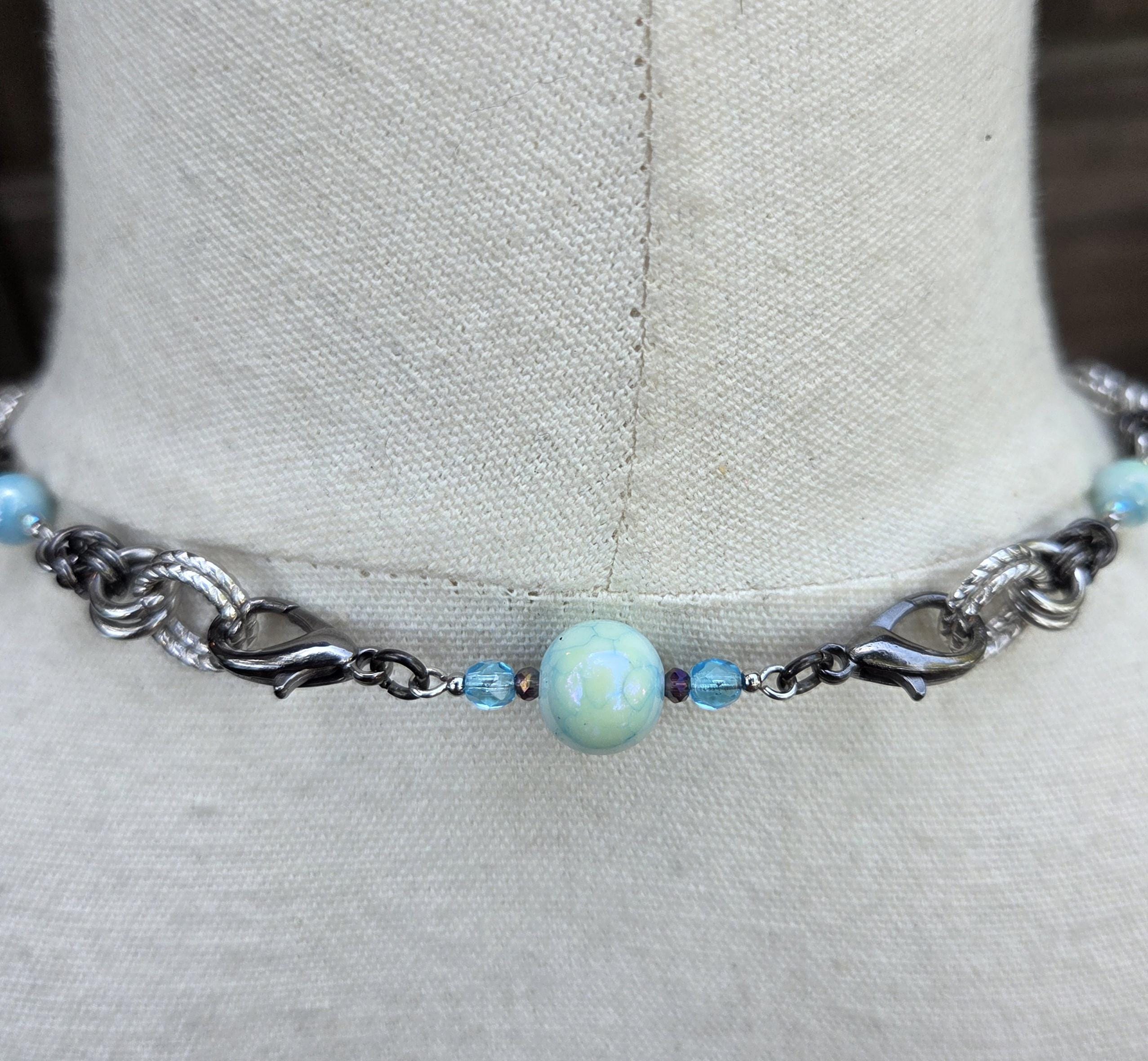 Stainless steel + gunmetal findings; aqua glass bead accents