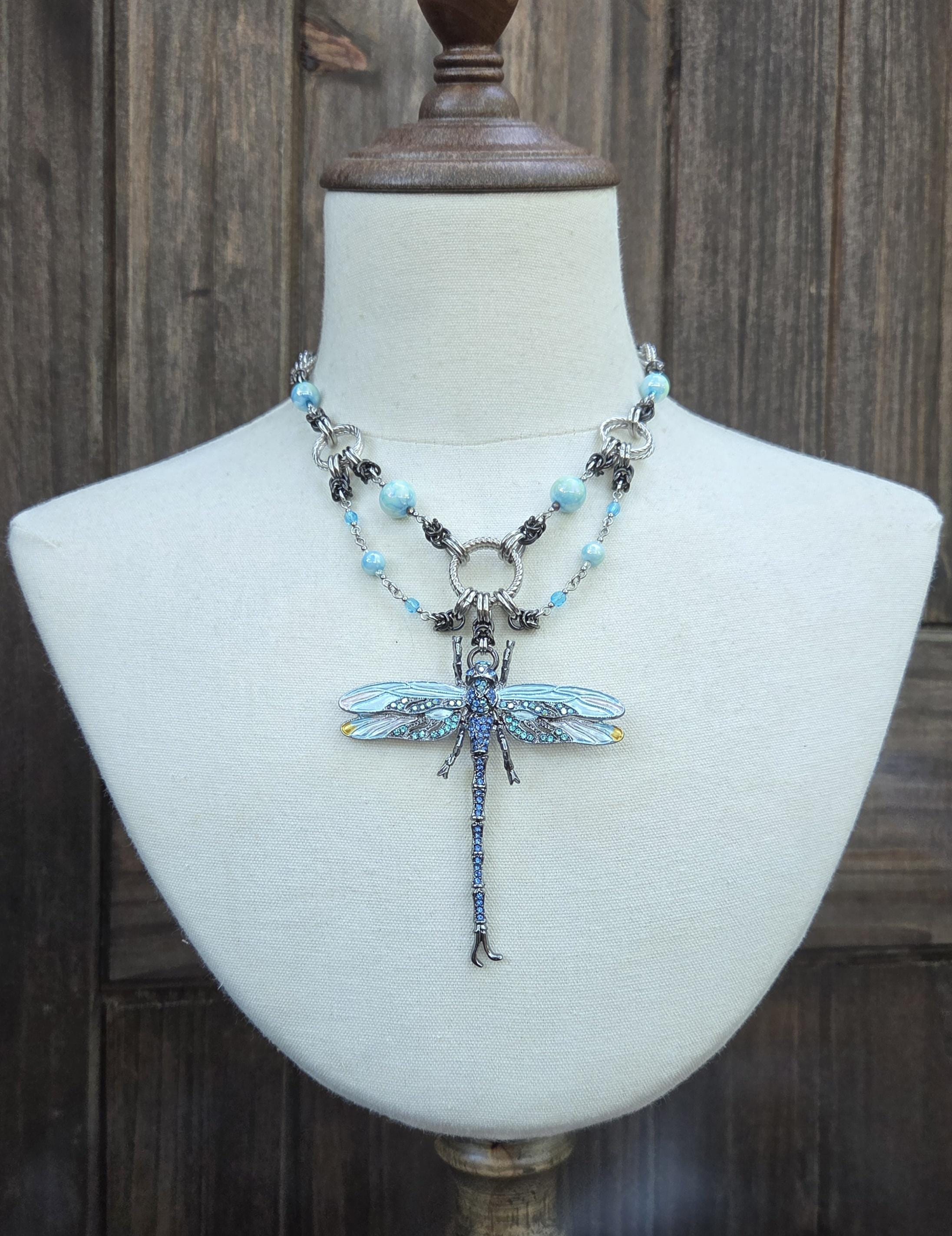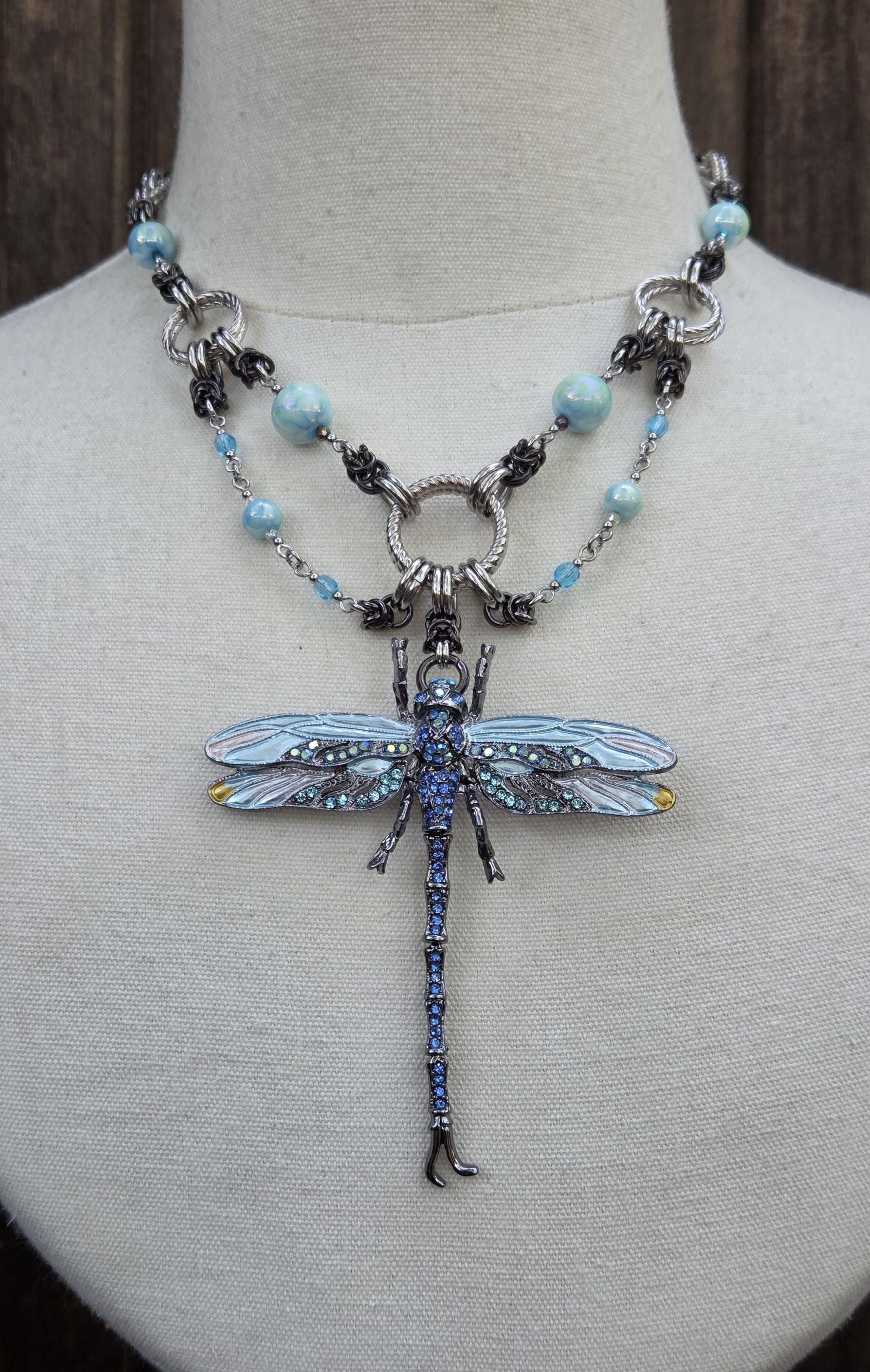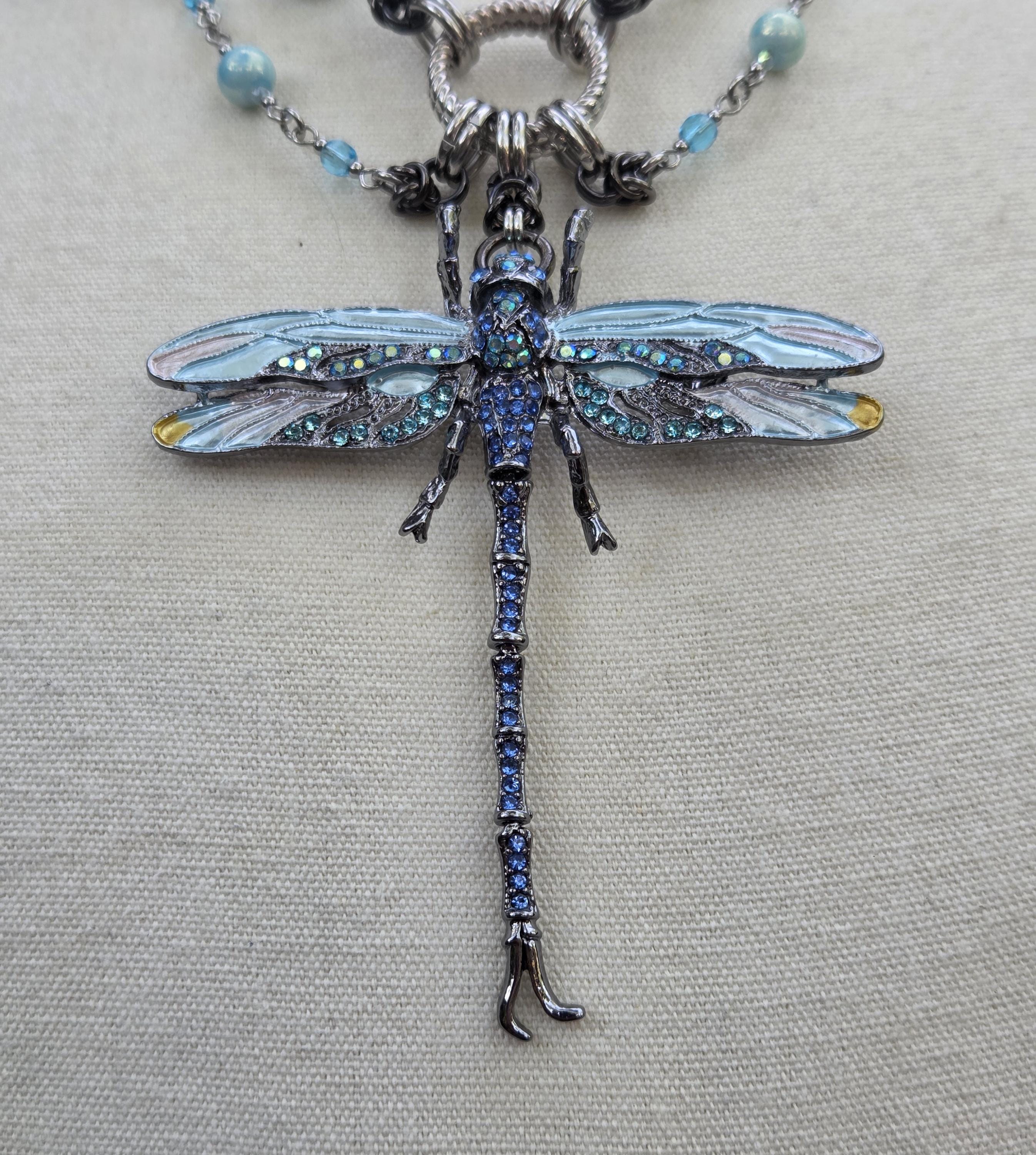 Focal: dragonfly pendant with blue pavé crystals and enamel-style wings (silver-tone/antique gunmetal look)