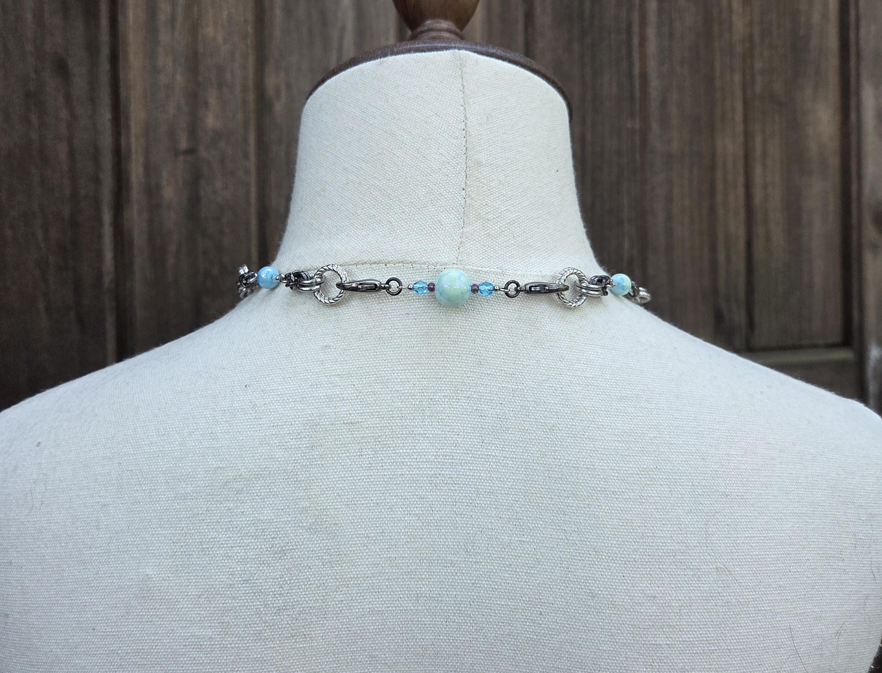 Meet your new power totem. This layered choker features a shimmering dragonfly pendant—symbol of transformation and lightness—suspended from hand-built stainless steel & gunmetal links with dreamy aqua glass beads. It wears like a statement, sits like a comfortable everyday favorite, and catches light from every angle.