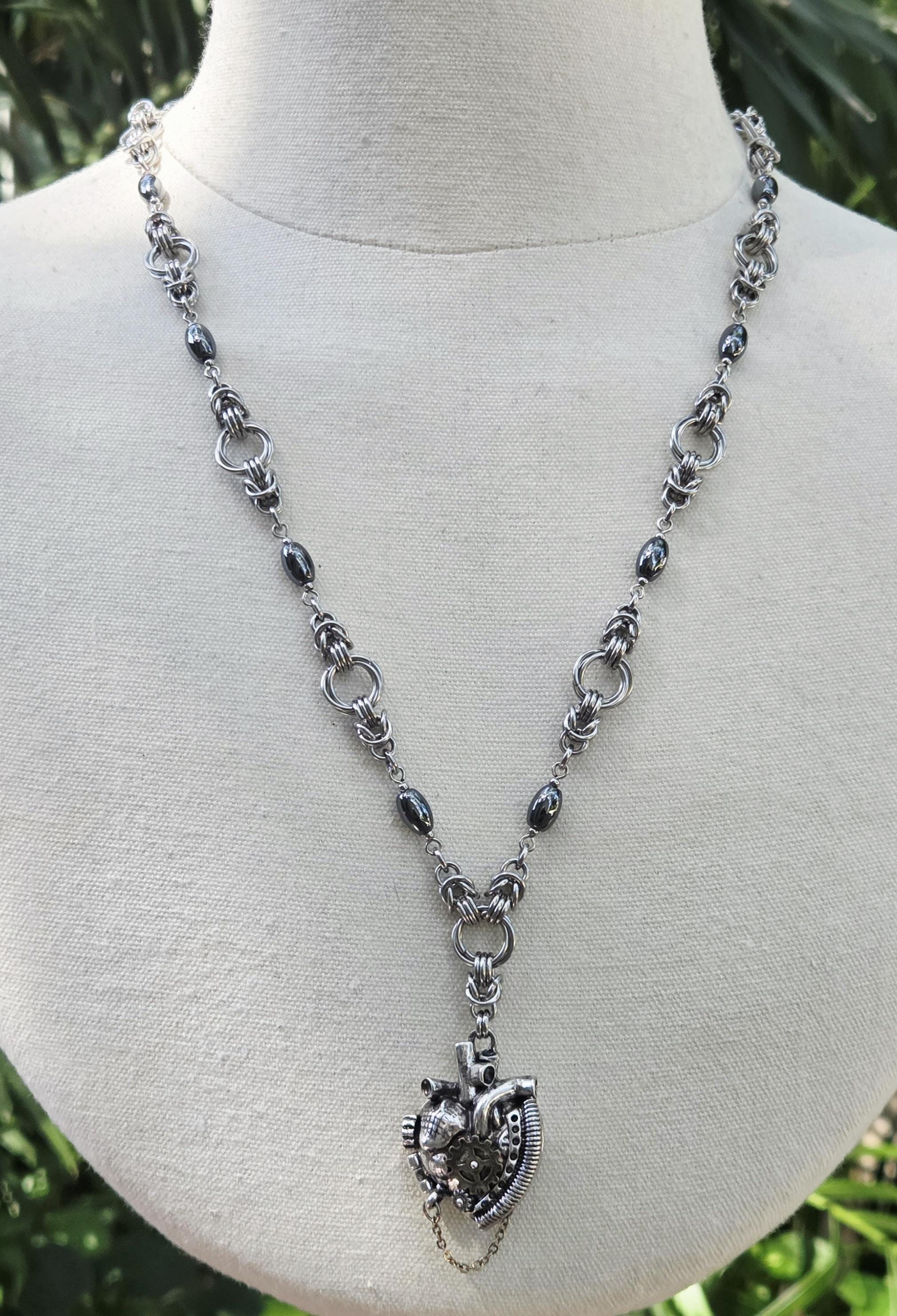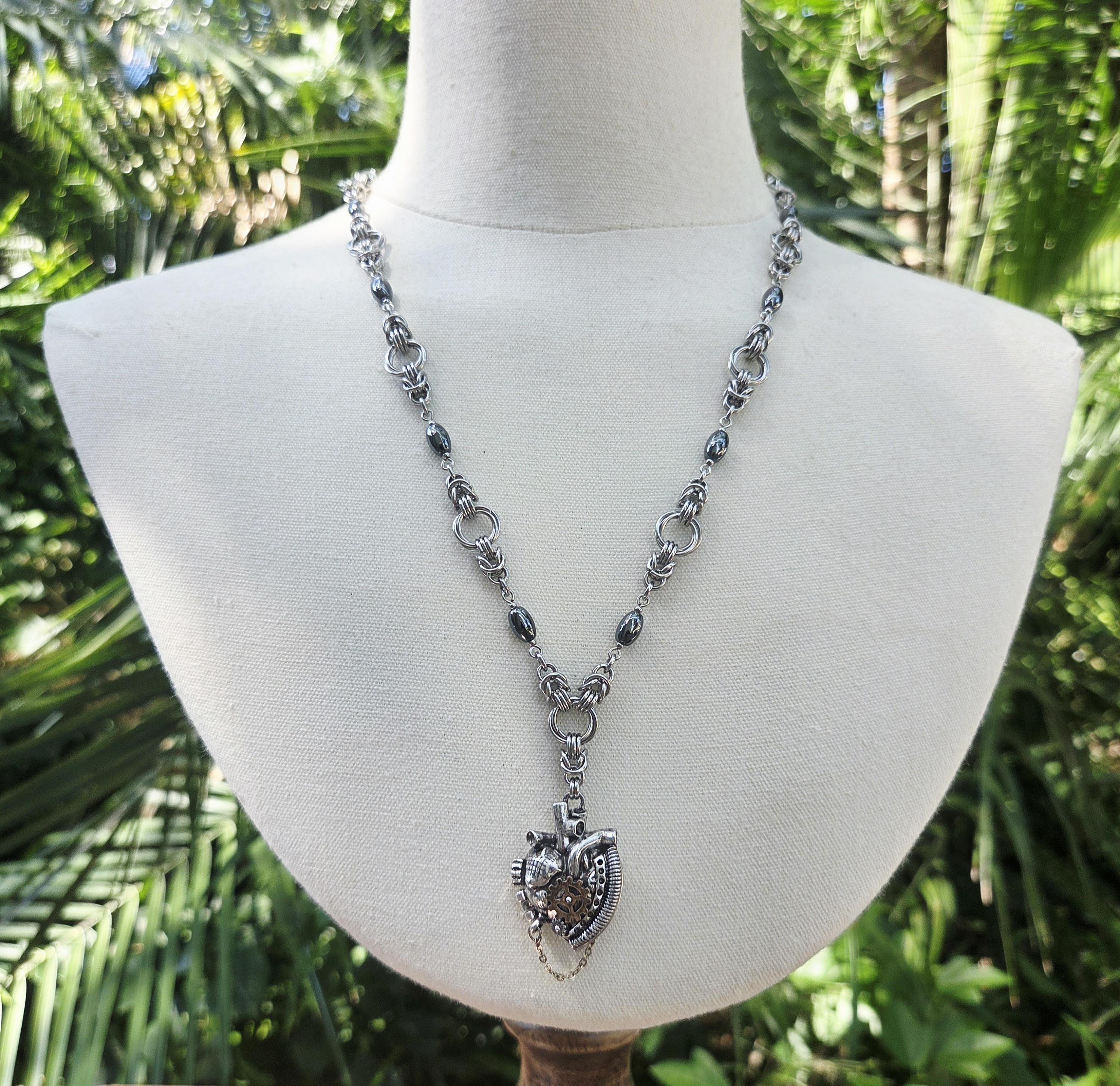 Step into the industrial magic of dark elegance with this handcrafted steampunk necklace. Featuring a bold anatomical heart pendant accented by intricate gears and chain detail, this piece is built on a sturdy Byzantine weave chain, crafted entirely with stainless steel findings for durability and shine.