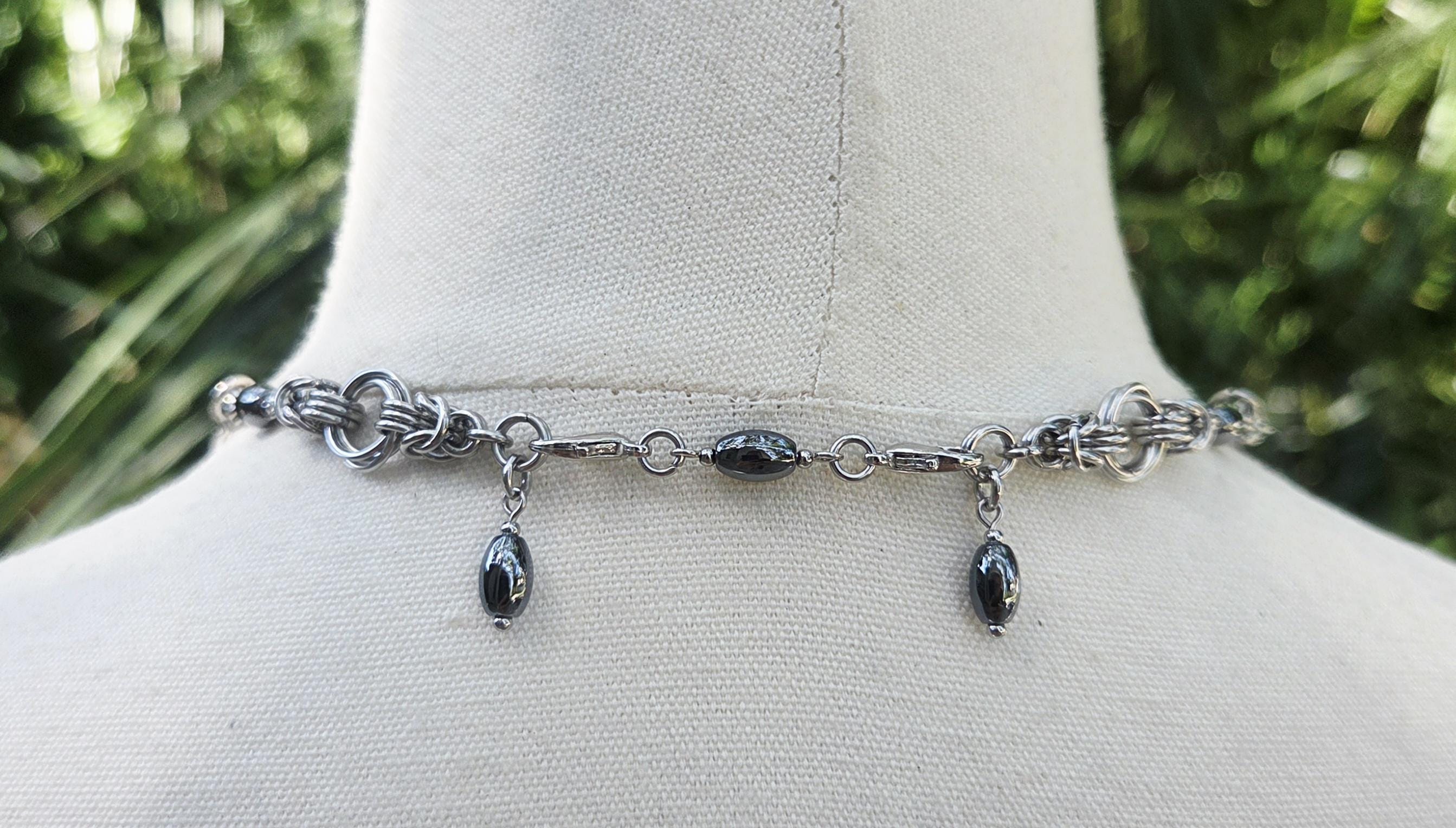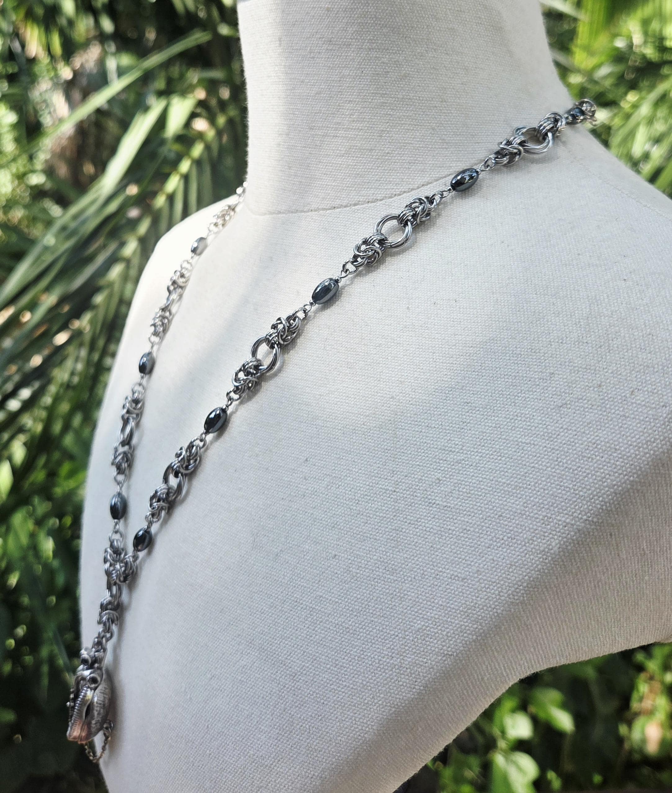 Marquise-cut hematite beads add a sleek, smoky contrast throughout the chain and dangle near the clasp for extra dimension. Finished with a secure double lobster claw clasp, this statement necklace measures 22 inches and is not adjustable.