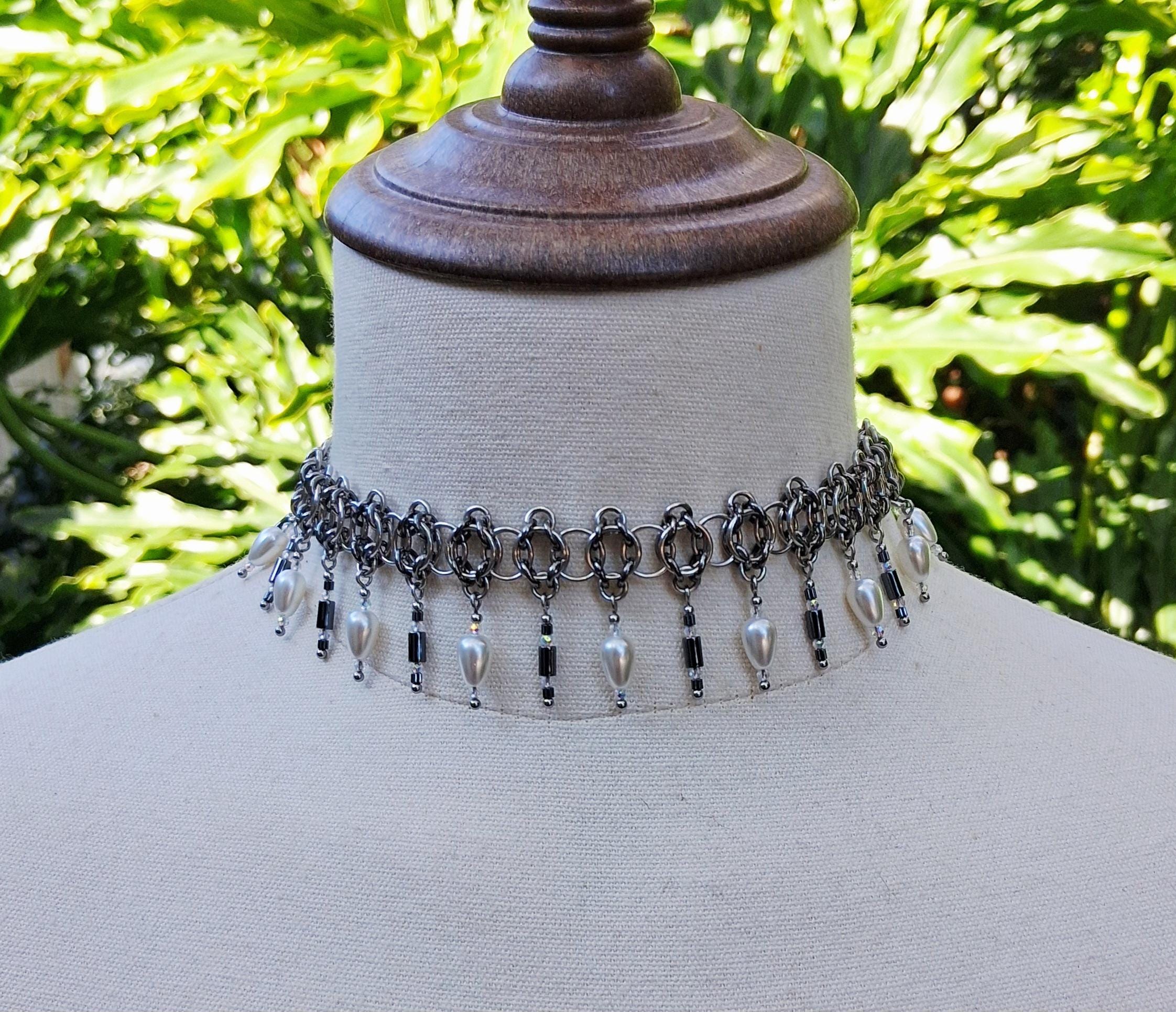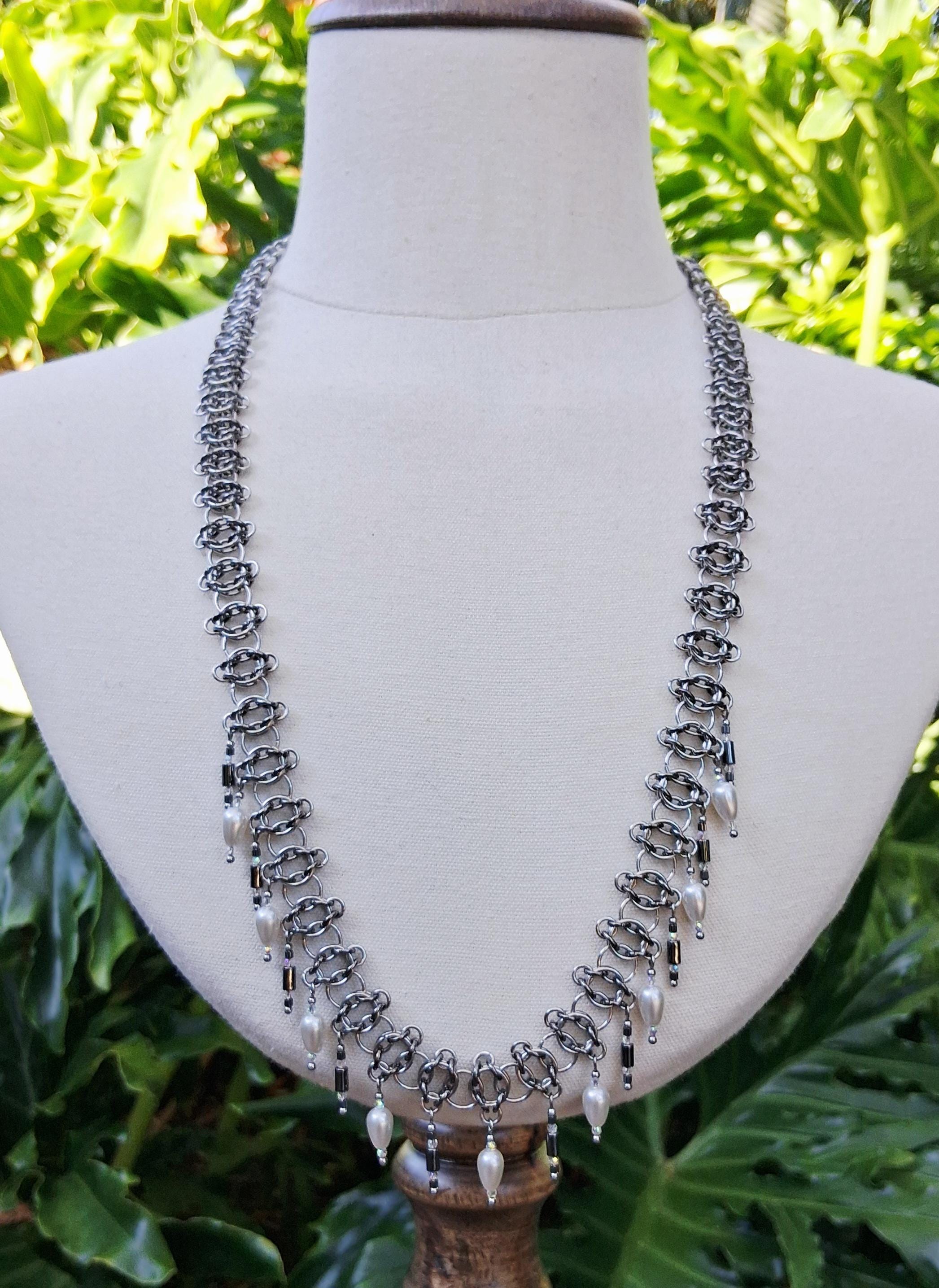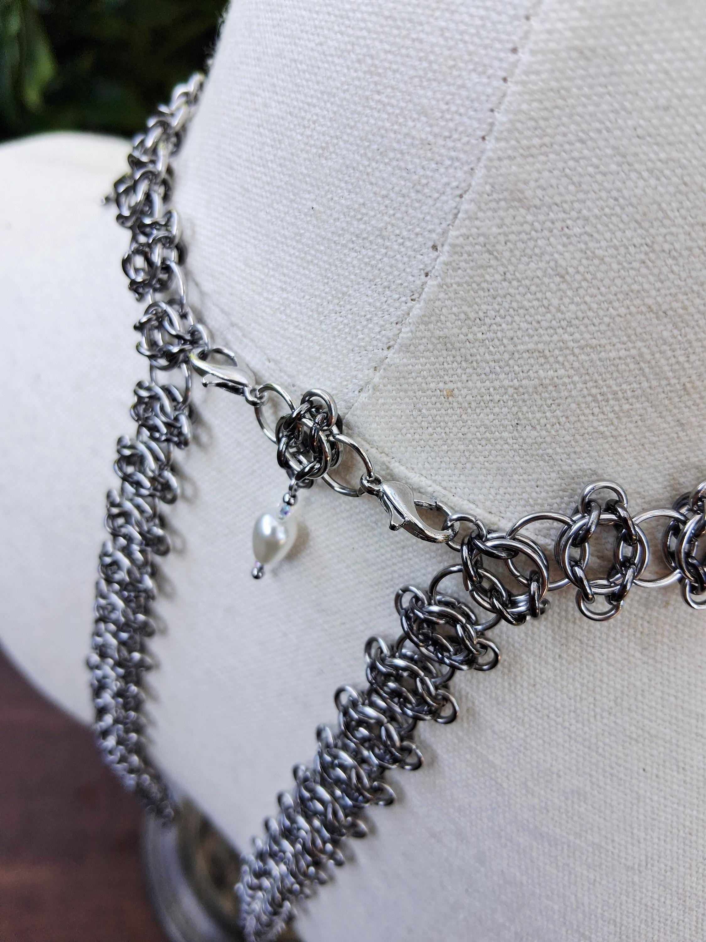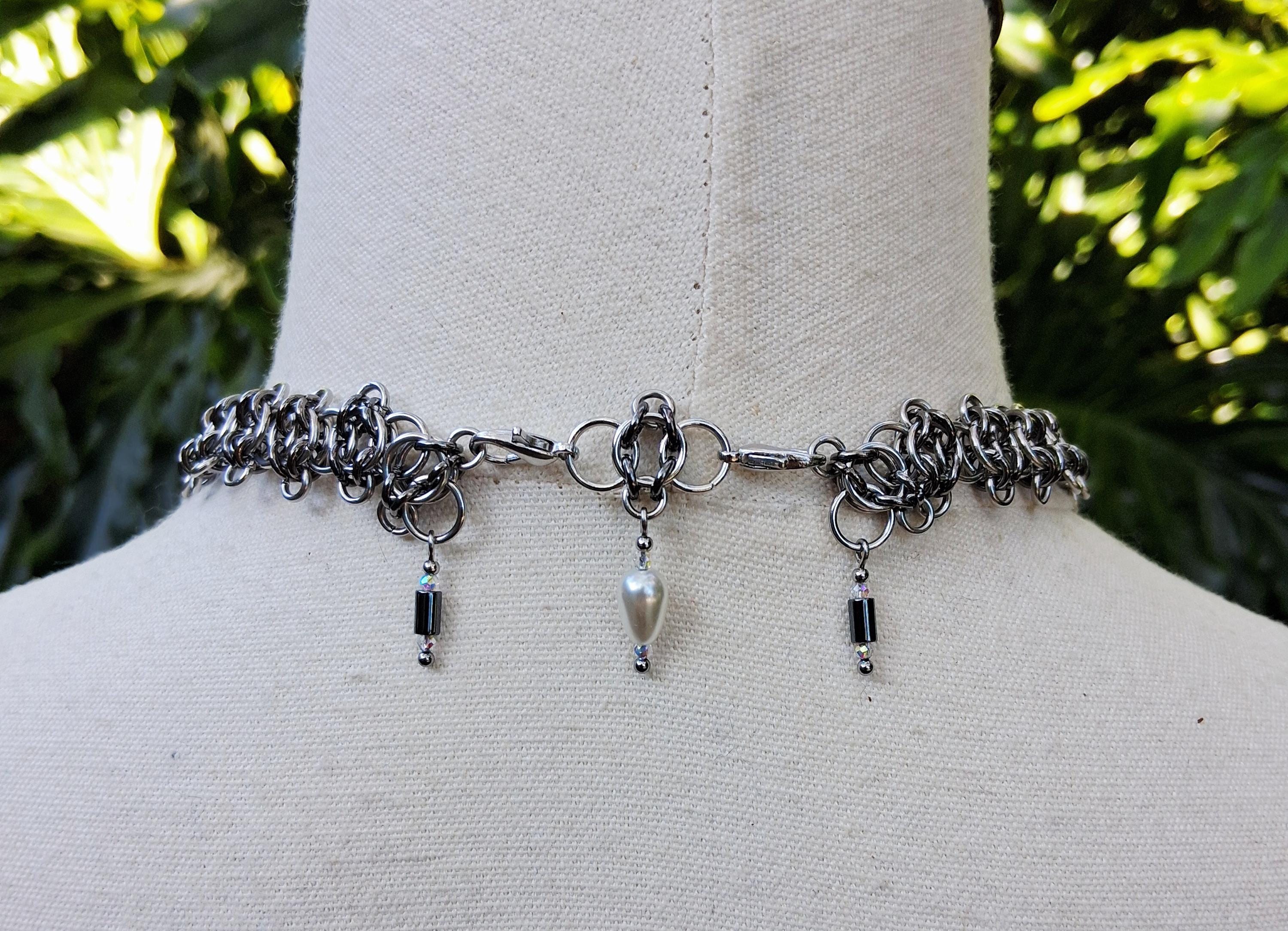 Hand-woven from durable stainless steel and gunmetal findings, this chainmaille necklace blends industrial strength with dark elegance. Each link is meticulously crafted, accented with hematite, faux pearls, and glass beads that shimmer with quiet sophistication.