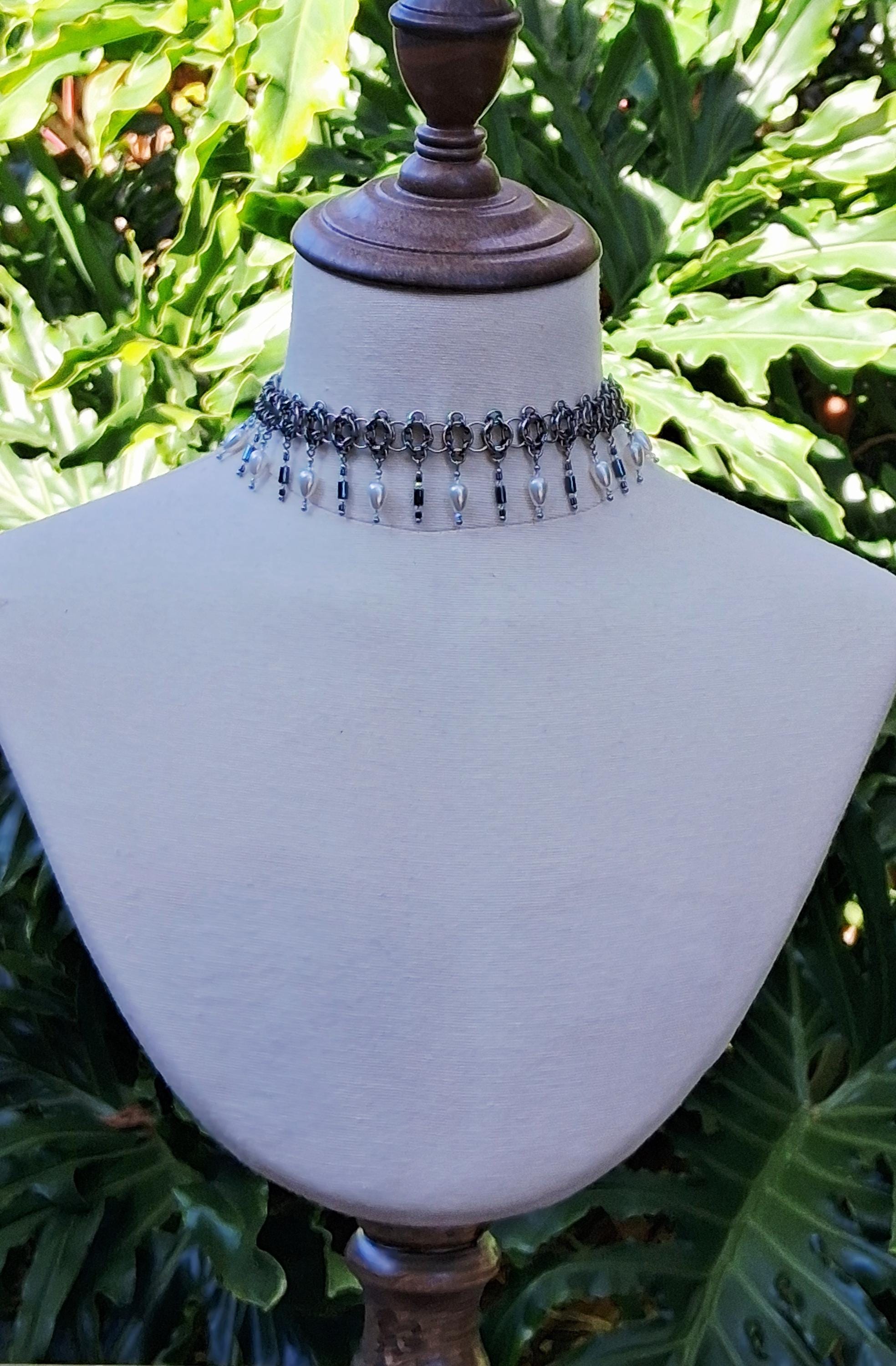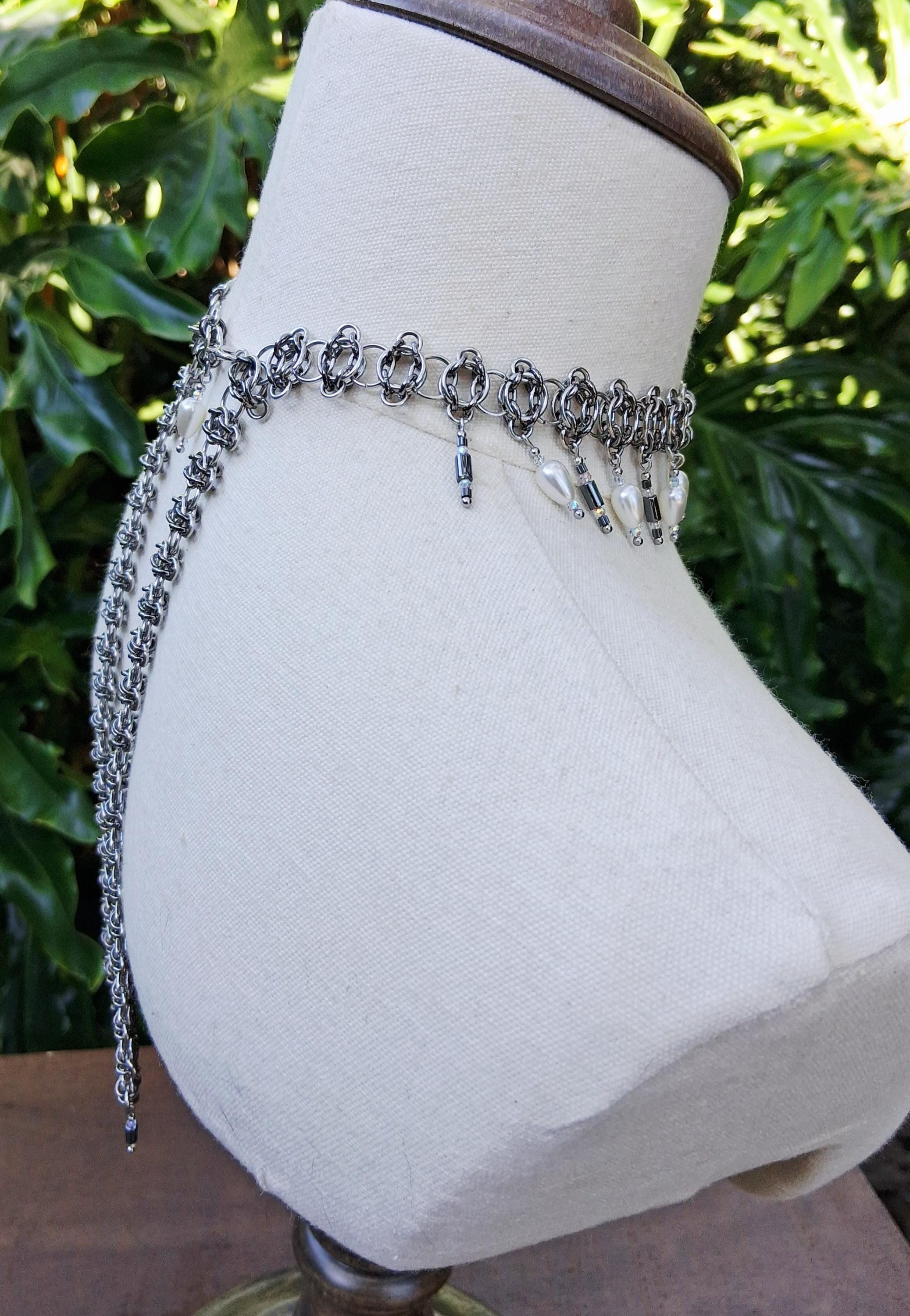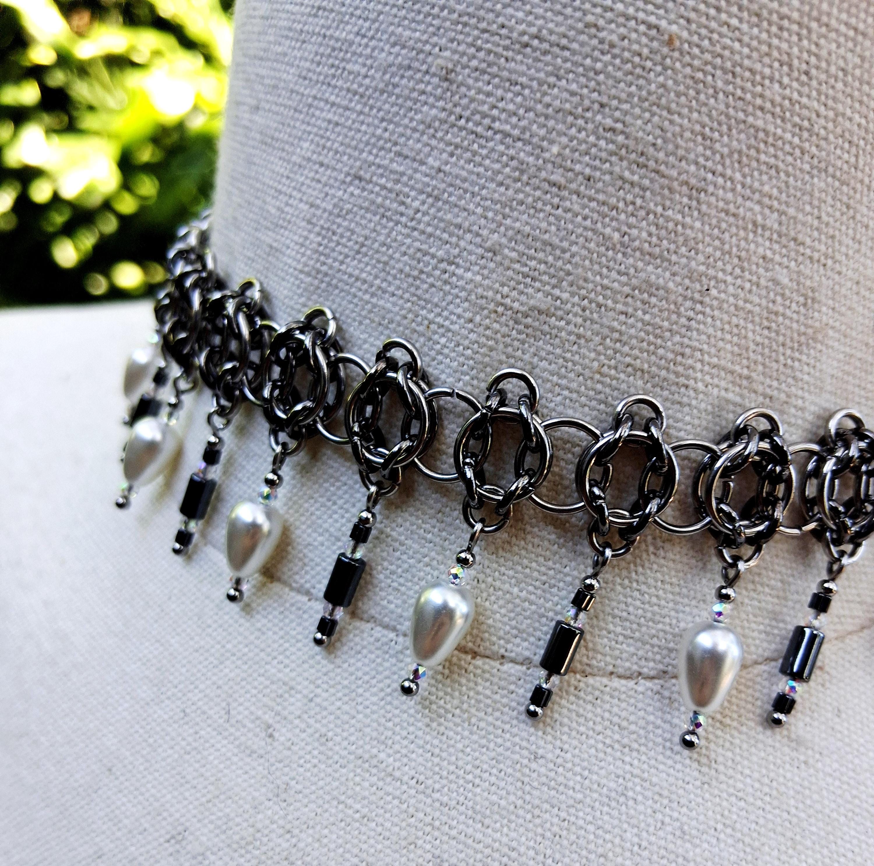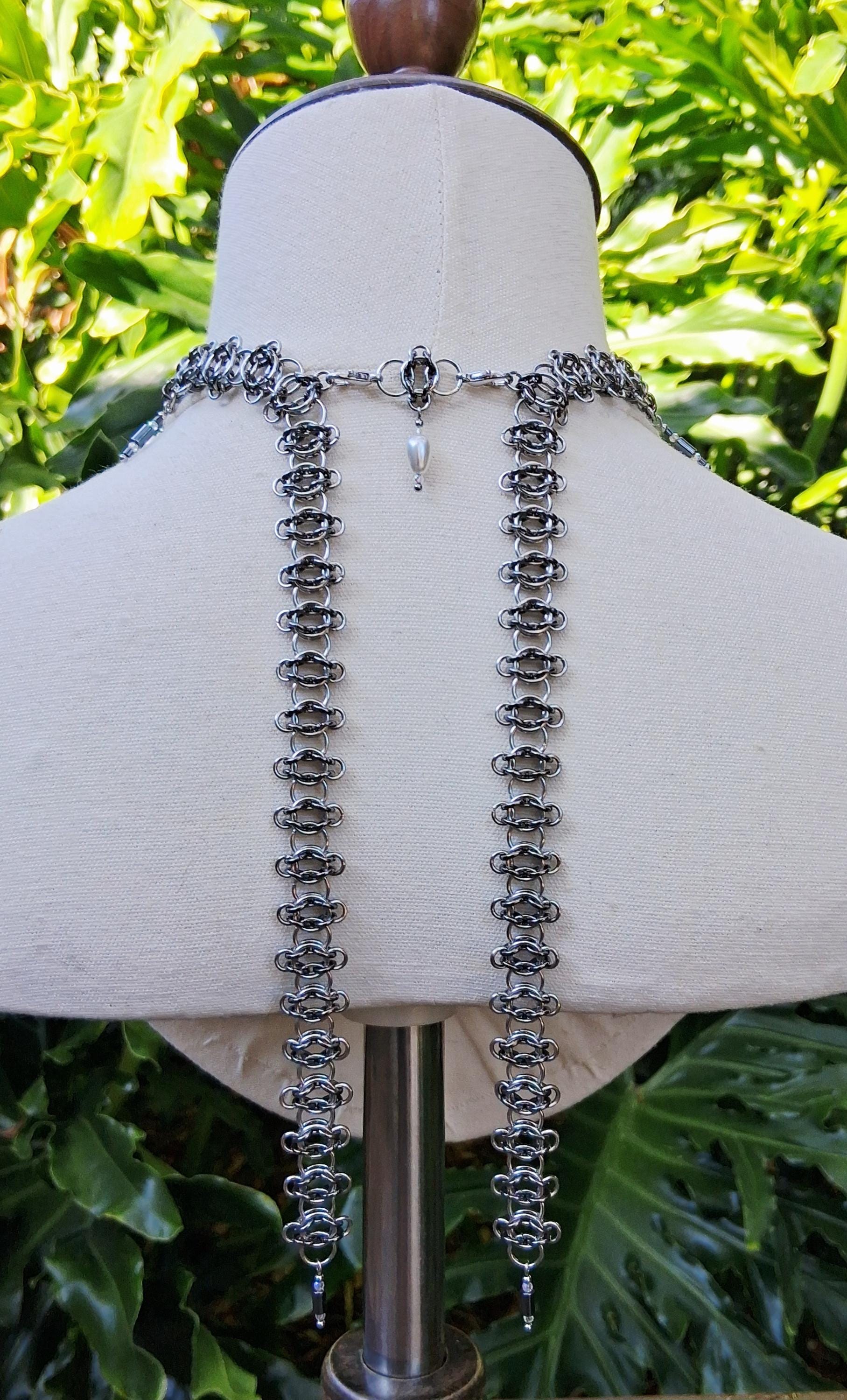 Hand-woven from durable stainless steel and gunmetal findings, this chainmaille necklace blends industrial strength with dark elegance. Each link is meticulously crafted, accented with hematite, faux pearls, and glass beads that shimmer with quiet sophistication.