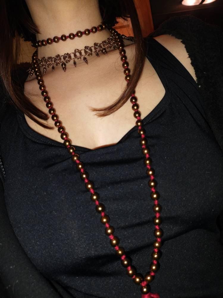 The design includes my signature double lobster-claw clasp, allowing for adjustable length and symmetrical draping across the collarbone or neckline. It can be worn as a close choker or looser collar piece—equally stunning with gothic, boho, or steampunk attire.