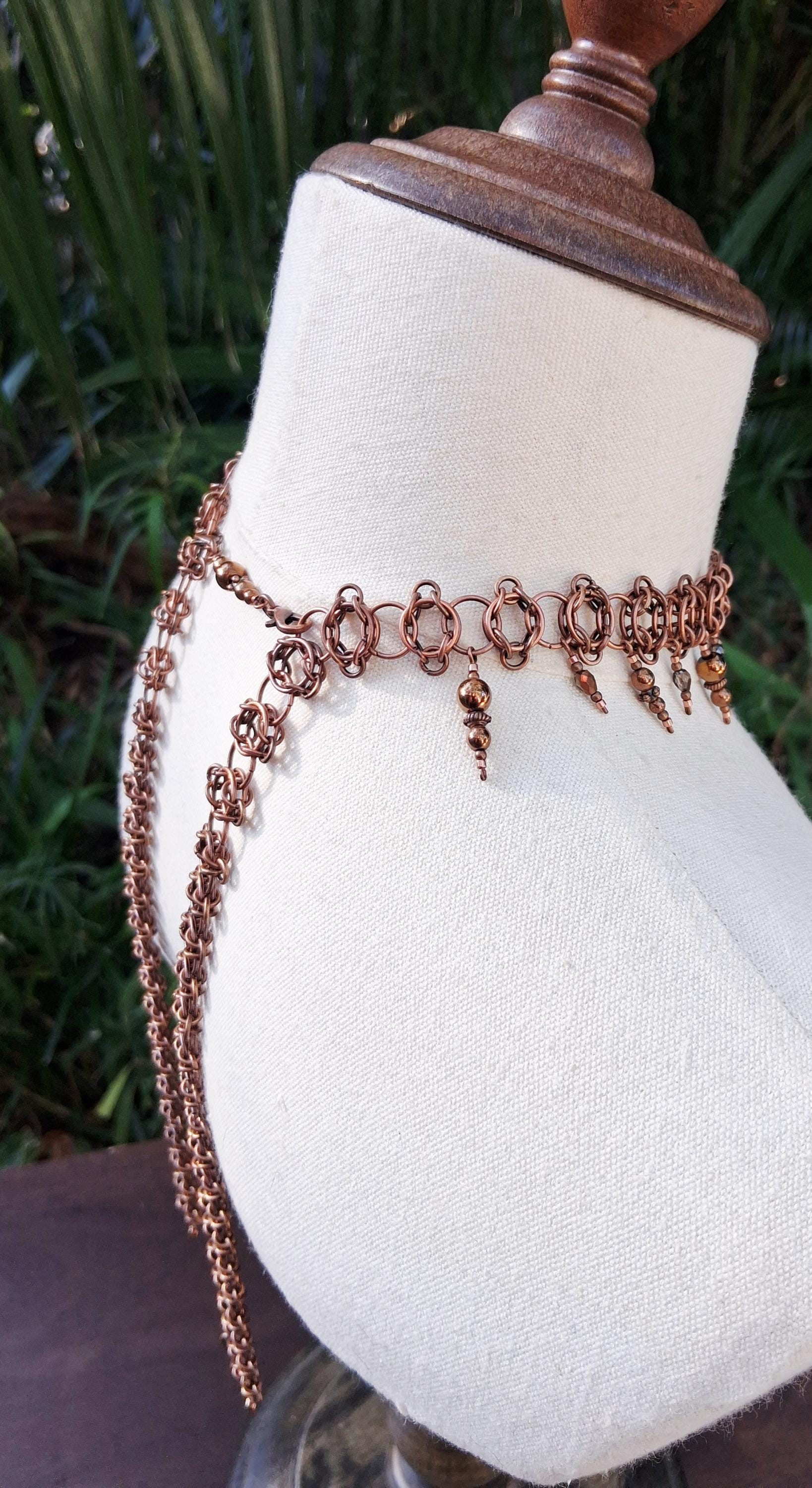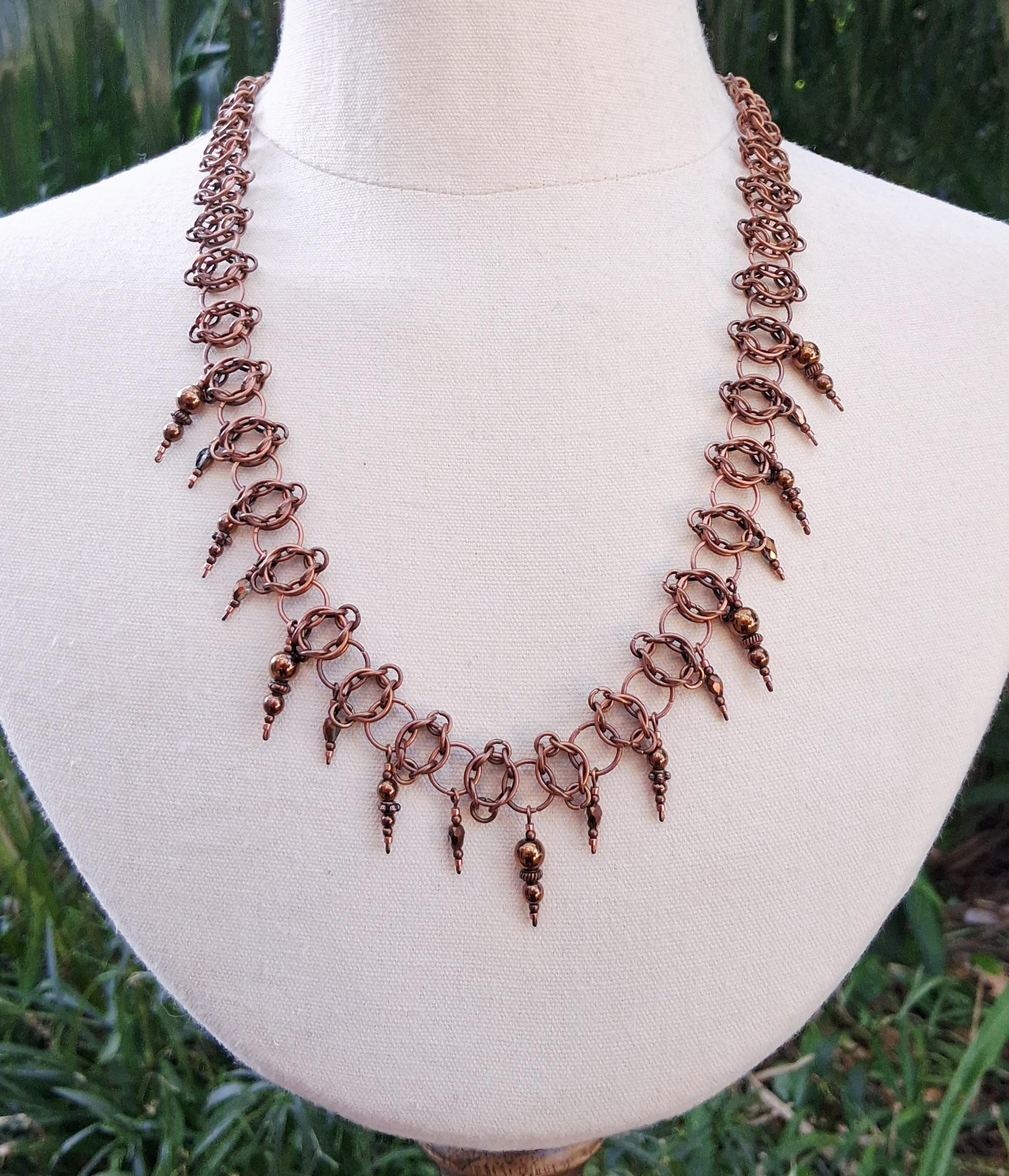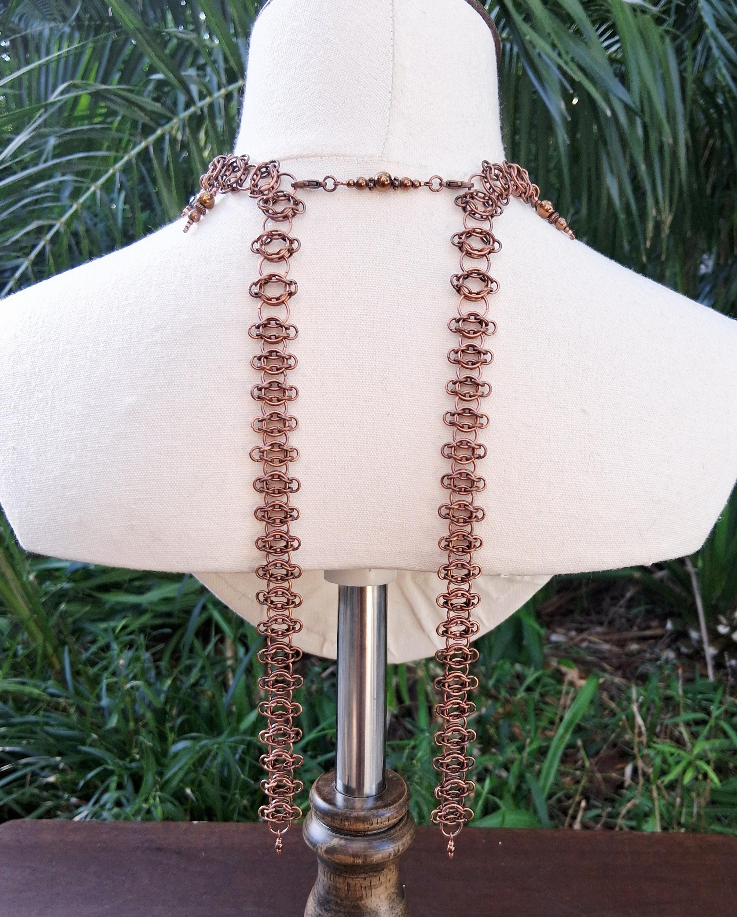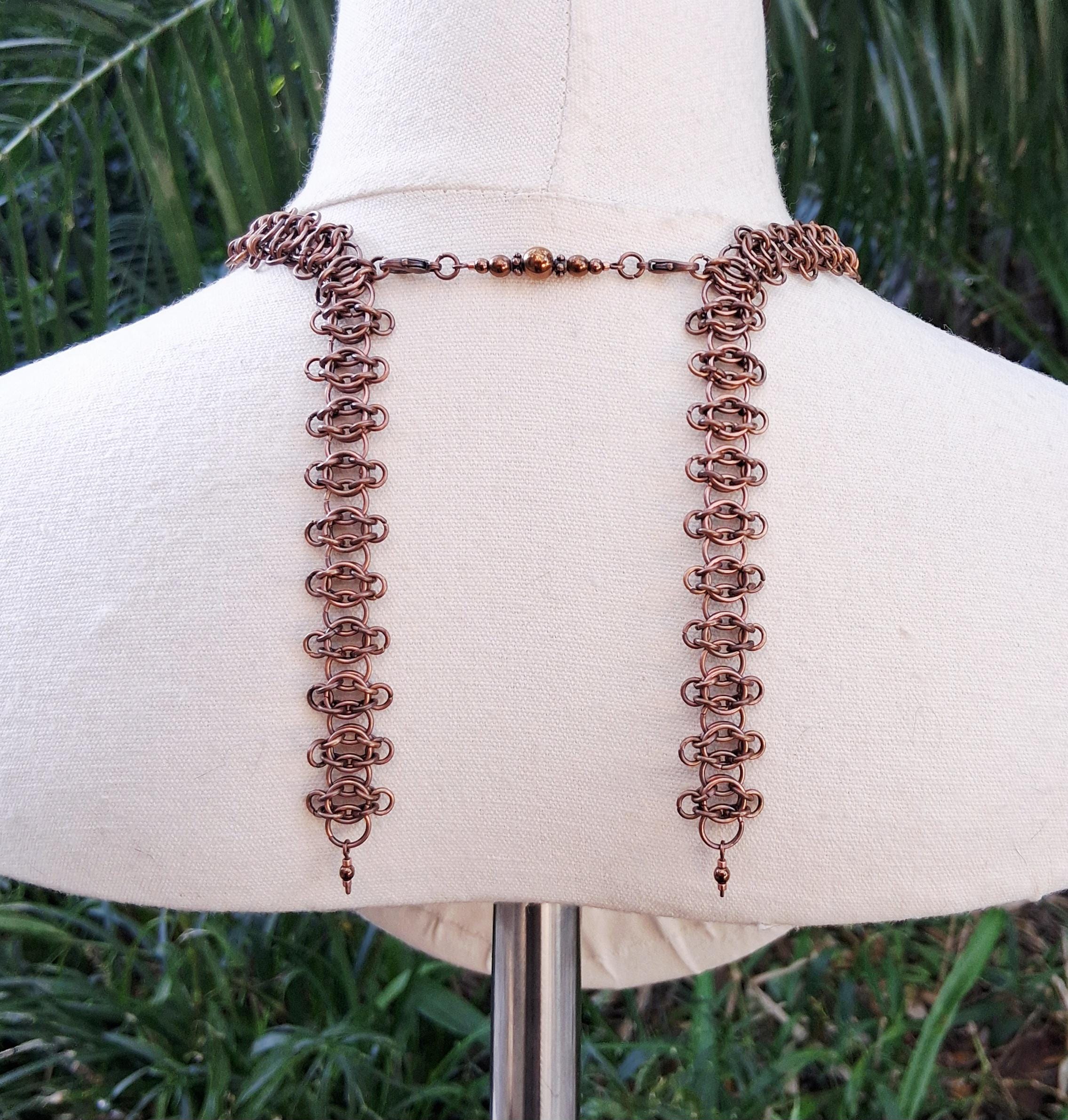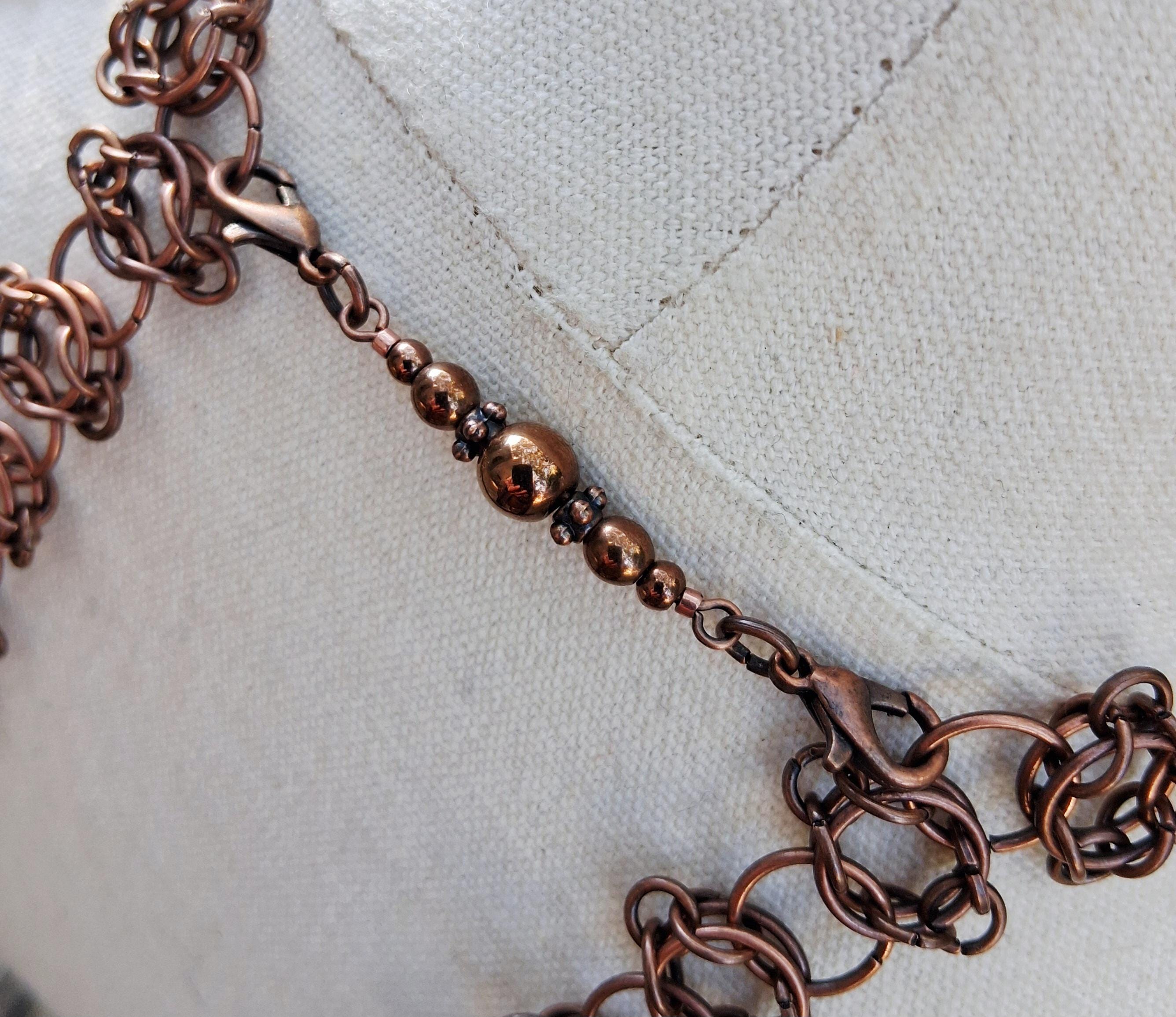 Hand-crafted in antique copper tones, this statement necklace combines intricate chainmaille weaves with the grounding energy of hematite. Each link is meticulously shaped and joined, featuring copper-colored hematite and glass beads that catch the light with subtle metallic warmth.