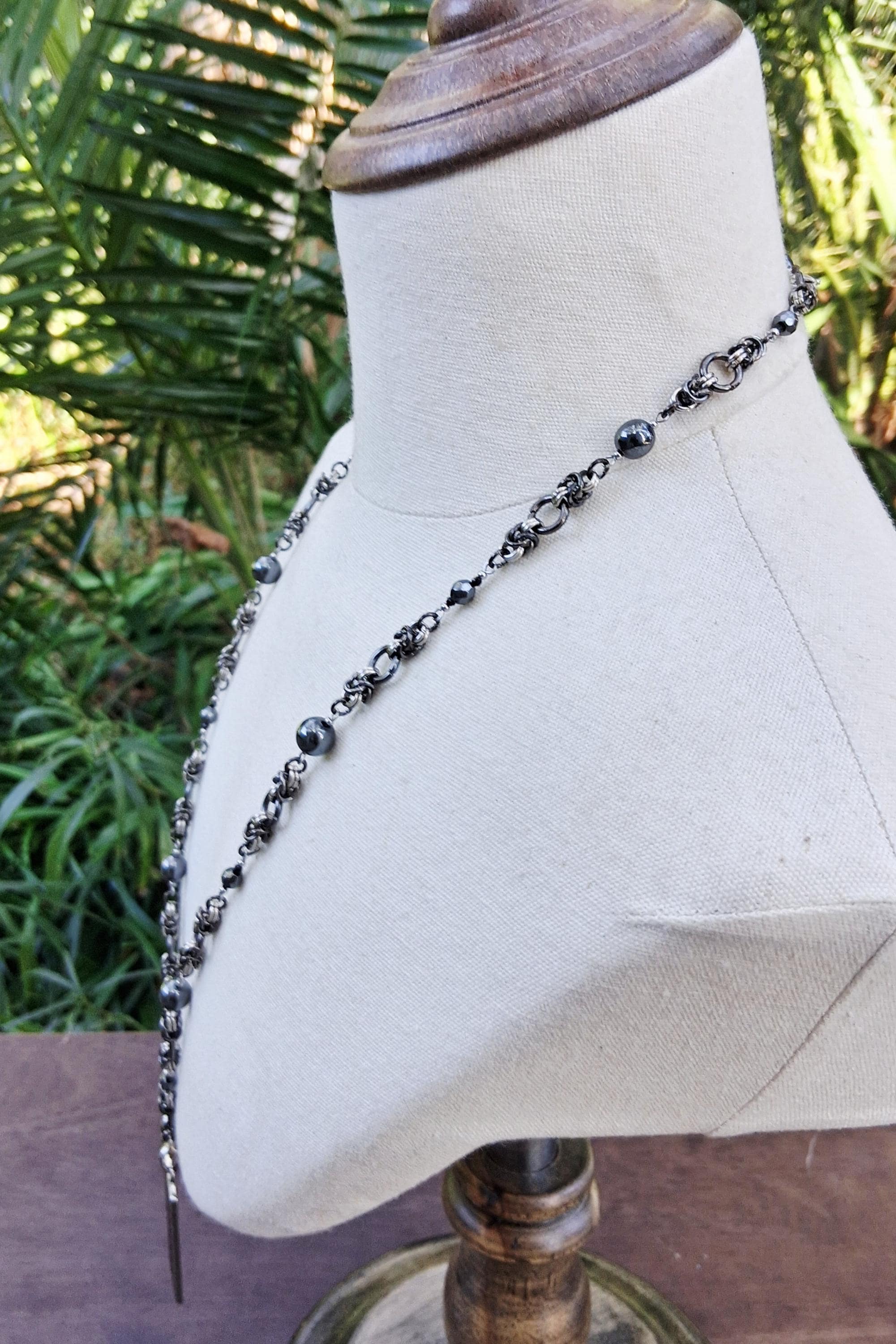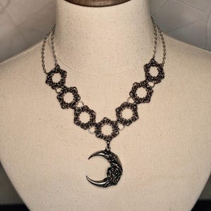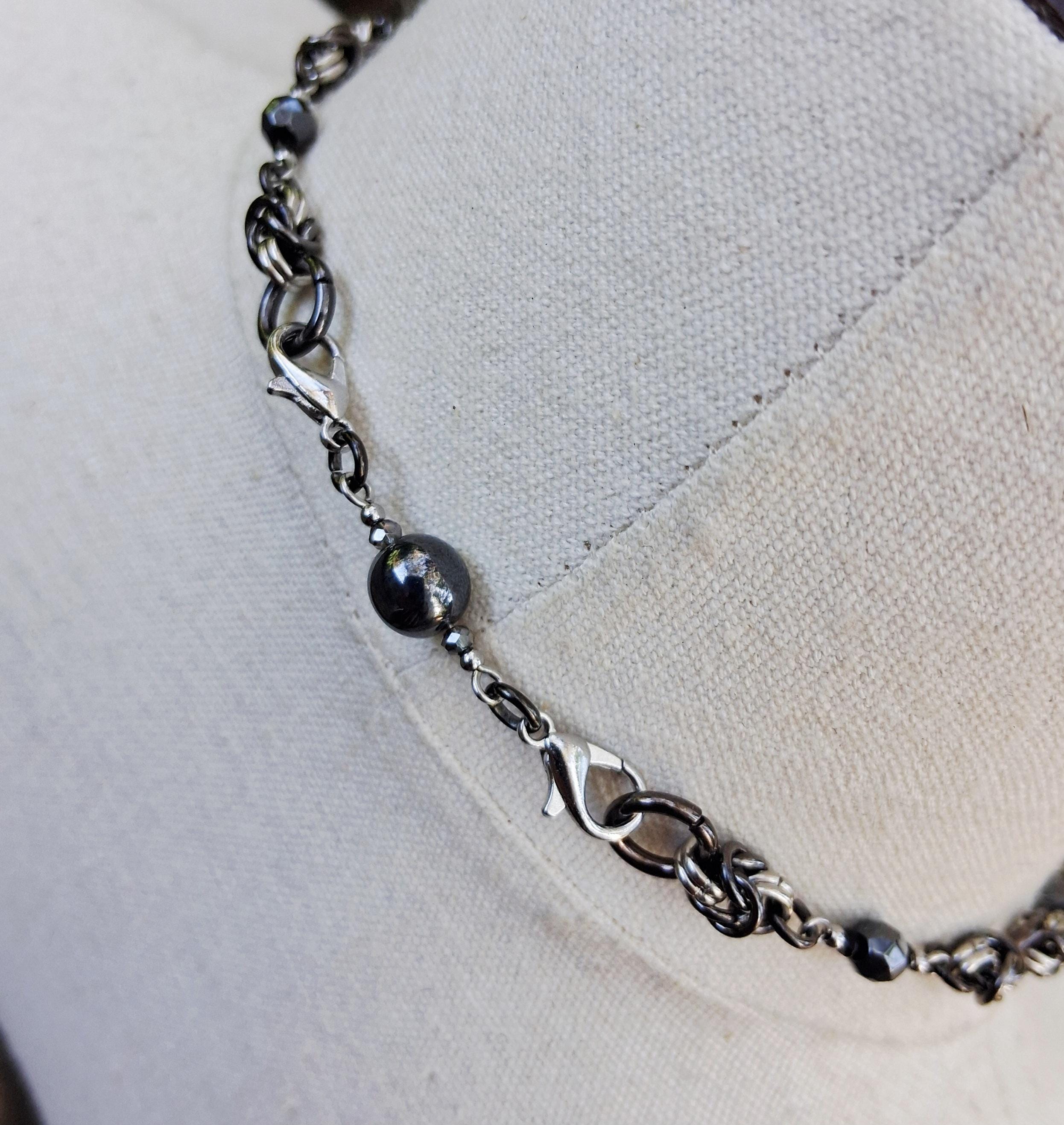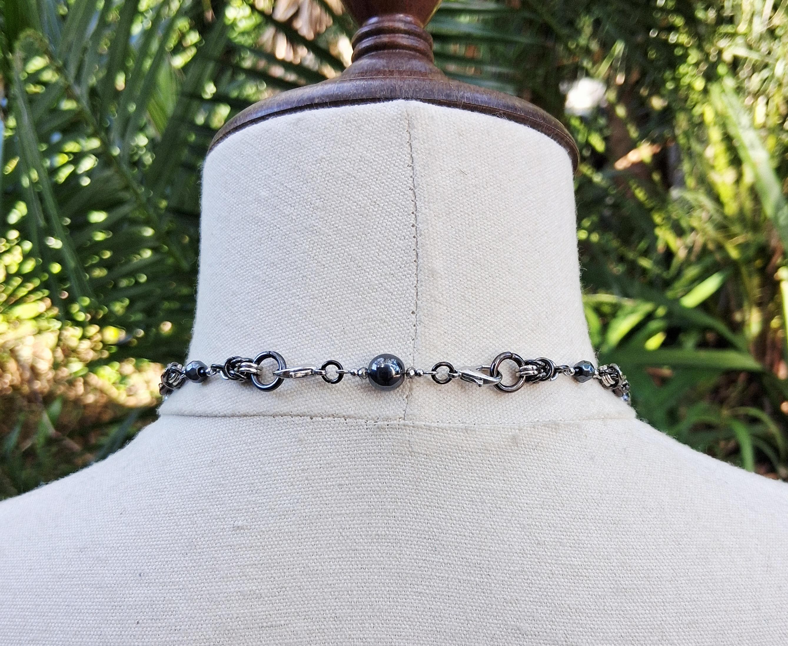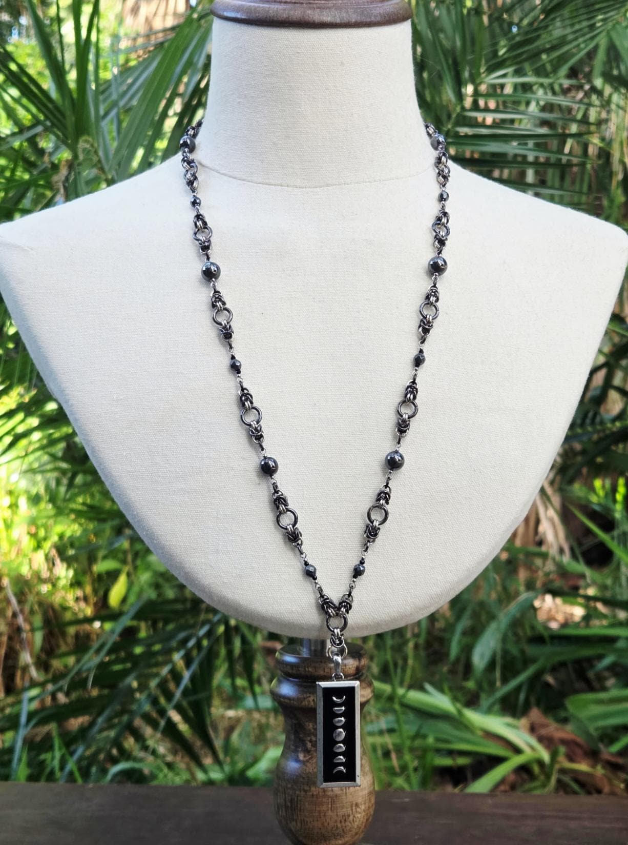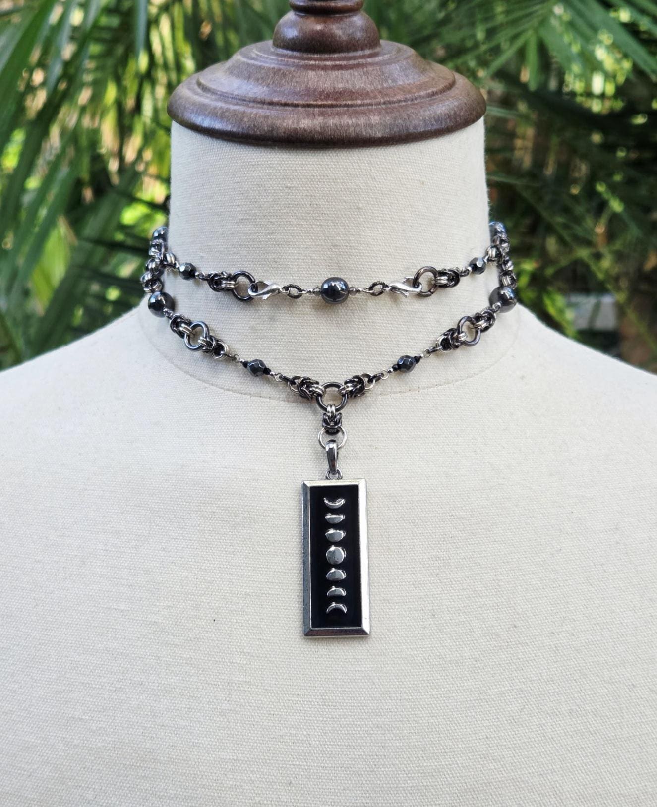 This striking piece blends celestial symbolism with steampunk edge. Handcrafted with stainless steel and gunmetal findings, the necklace features hematite and faceted glass beads intricately linked through a chainmaille-inspired design. A rectangular moon phase pendant anchors the piece, symbolizing transformation, intuition, and the rhythm of nature.
