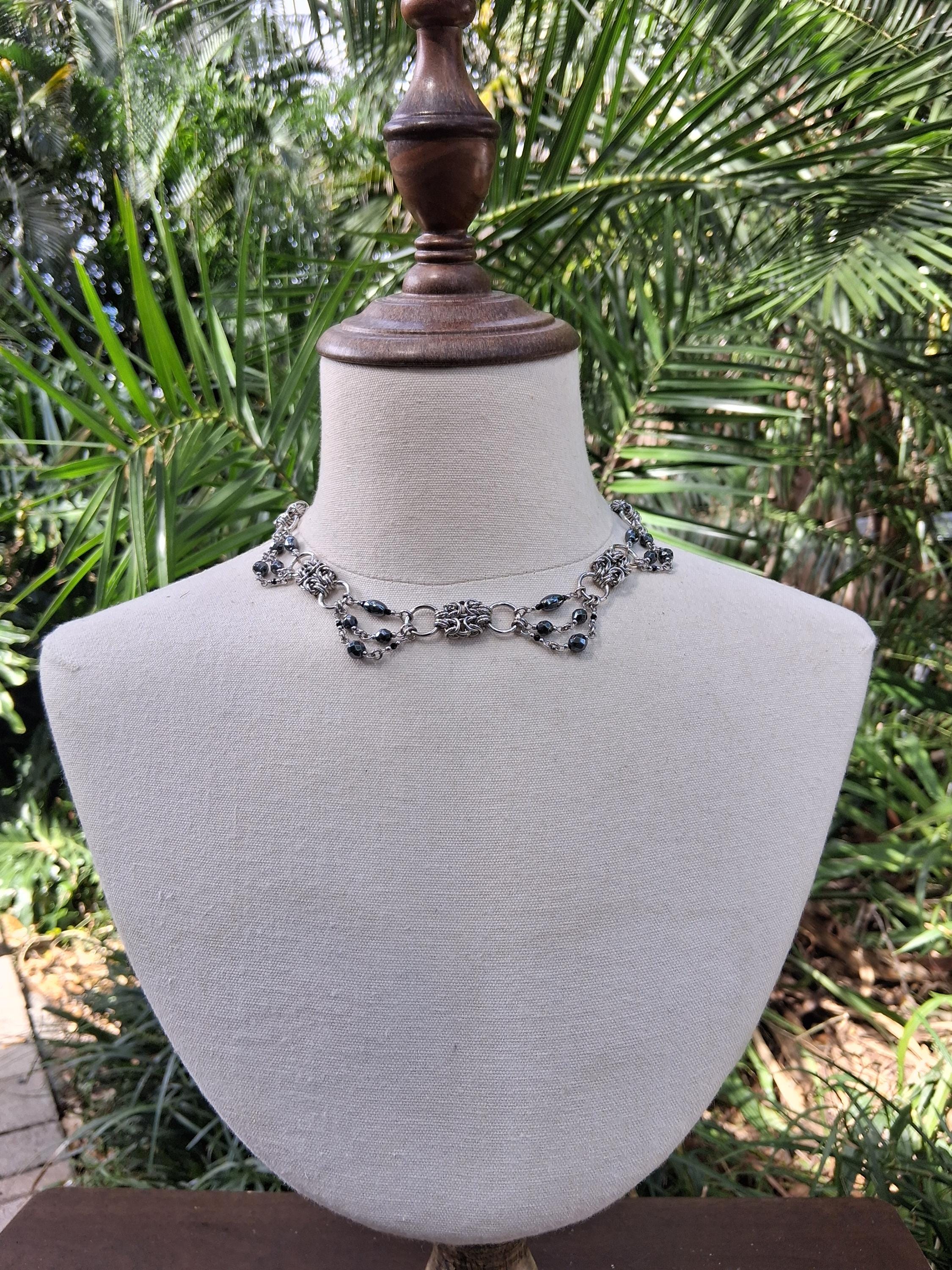 Each interlocking ring forms a protective pattern that rests gracefully at the base of the neck, while the faceted hematite beads capture light like midnight mirrors. Designed to empower, adorn, and enchant.