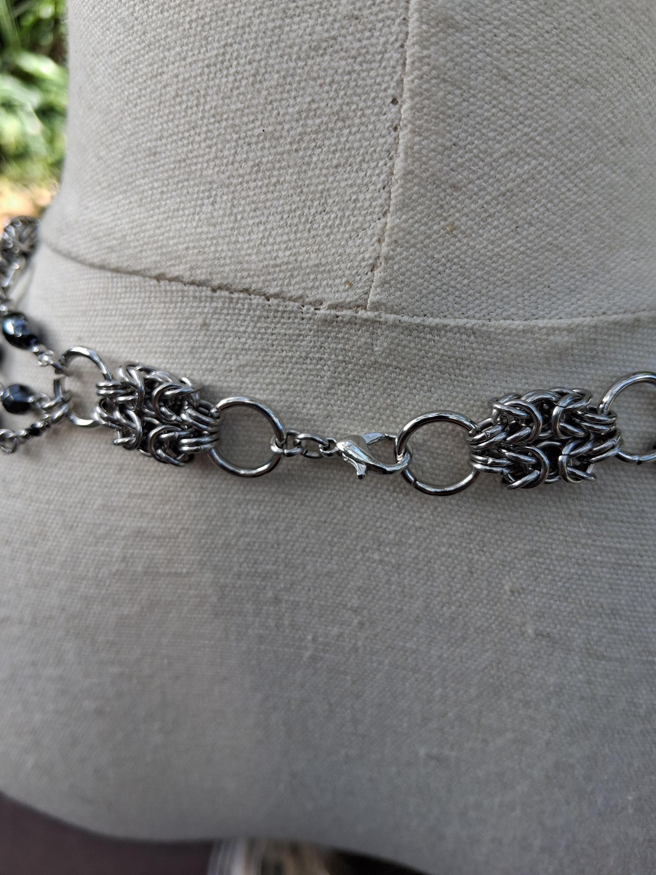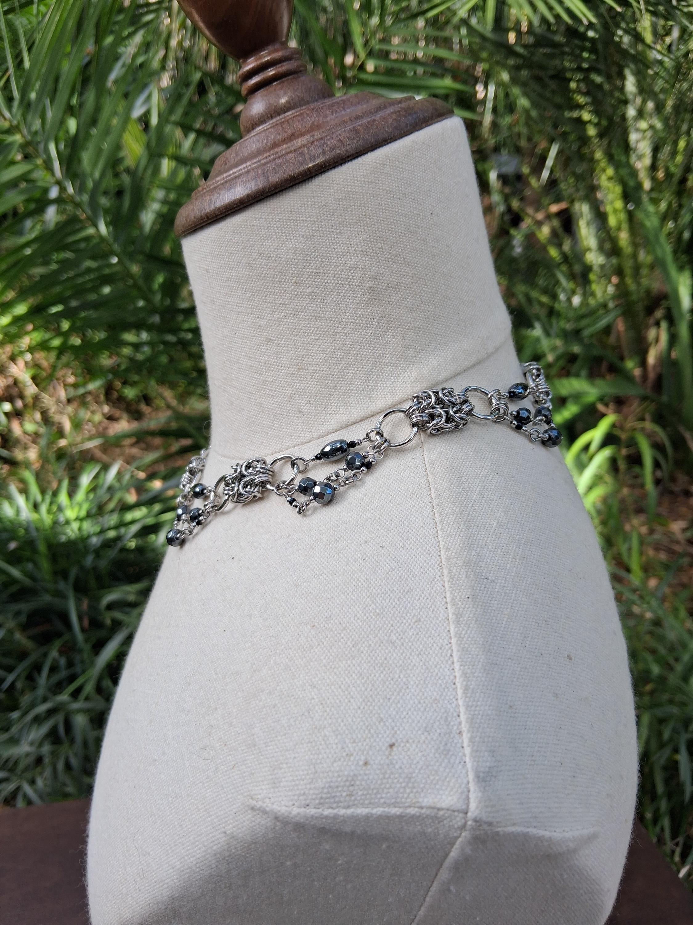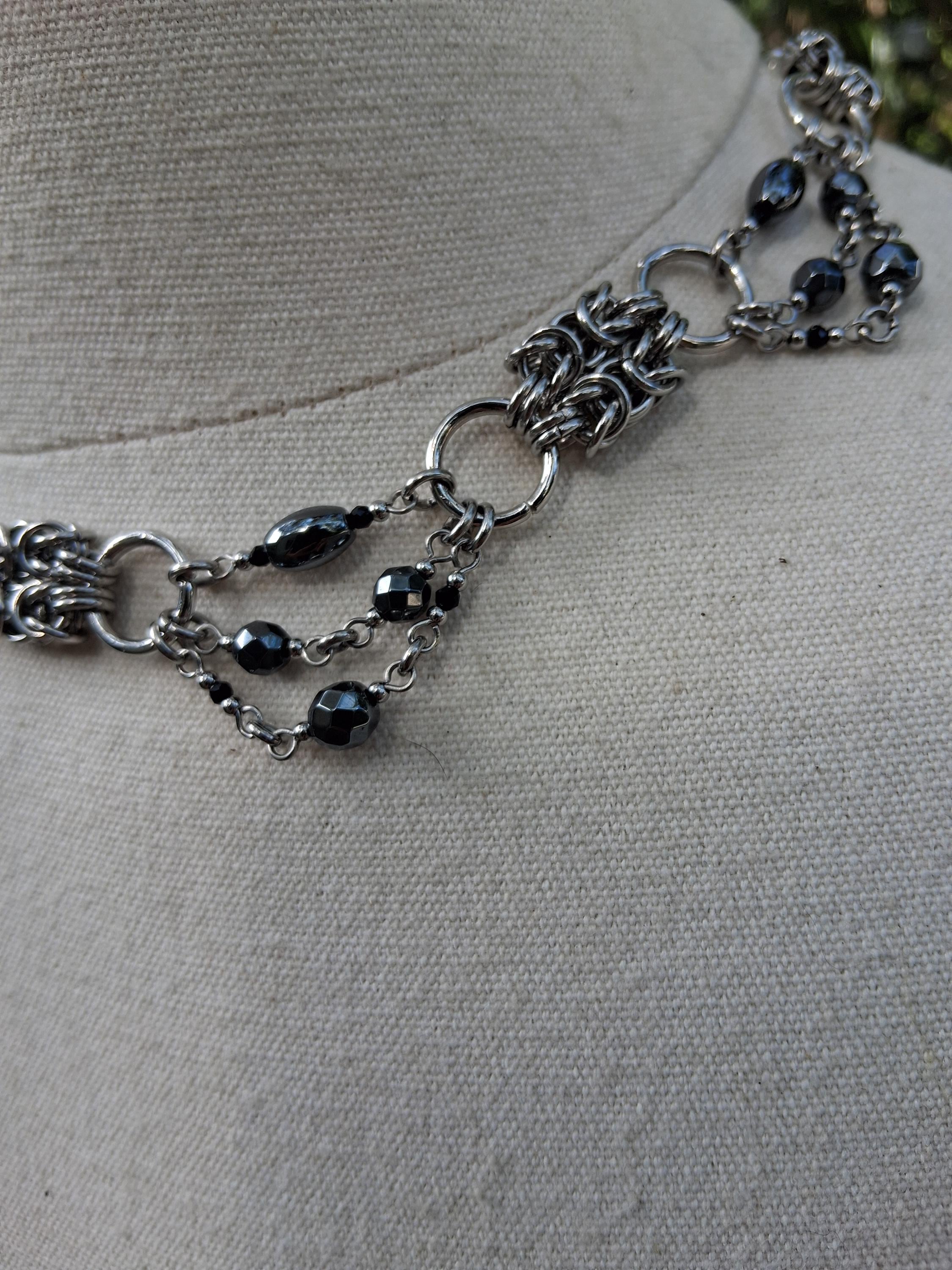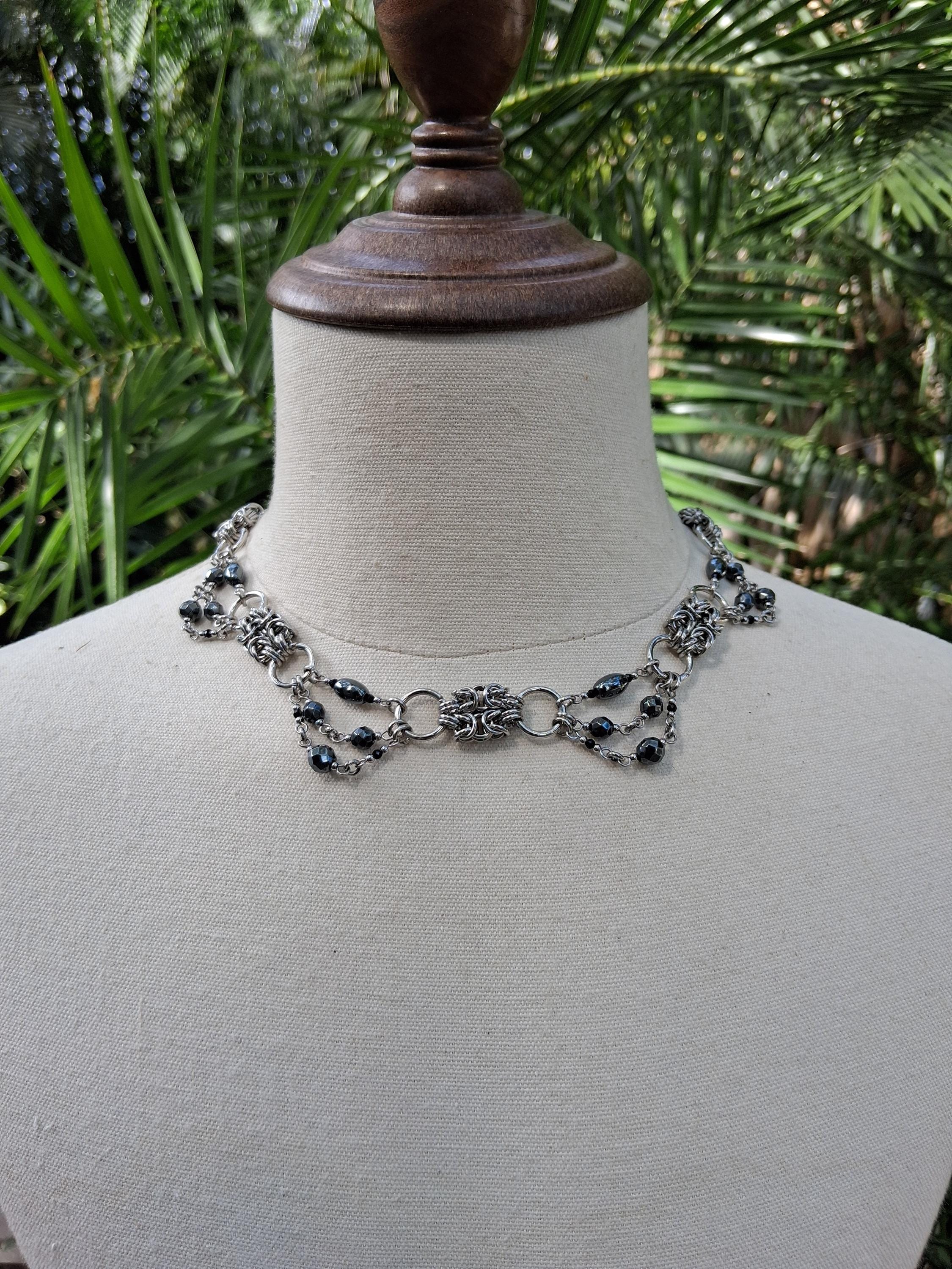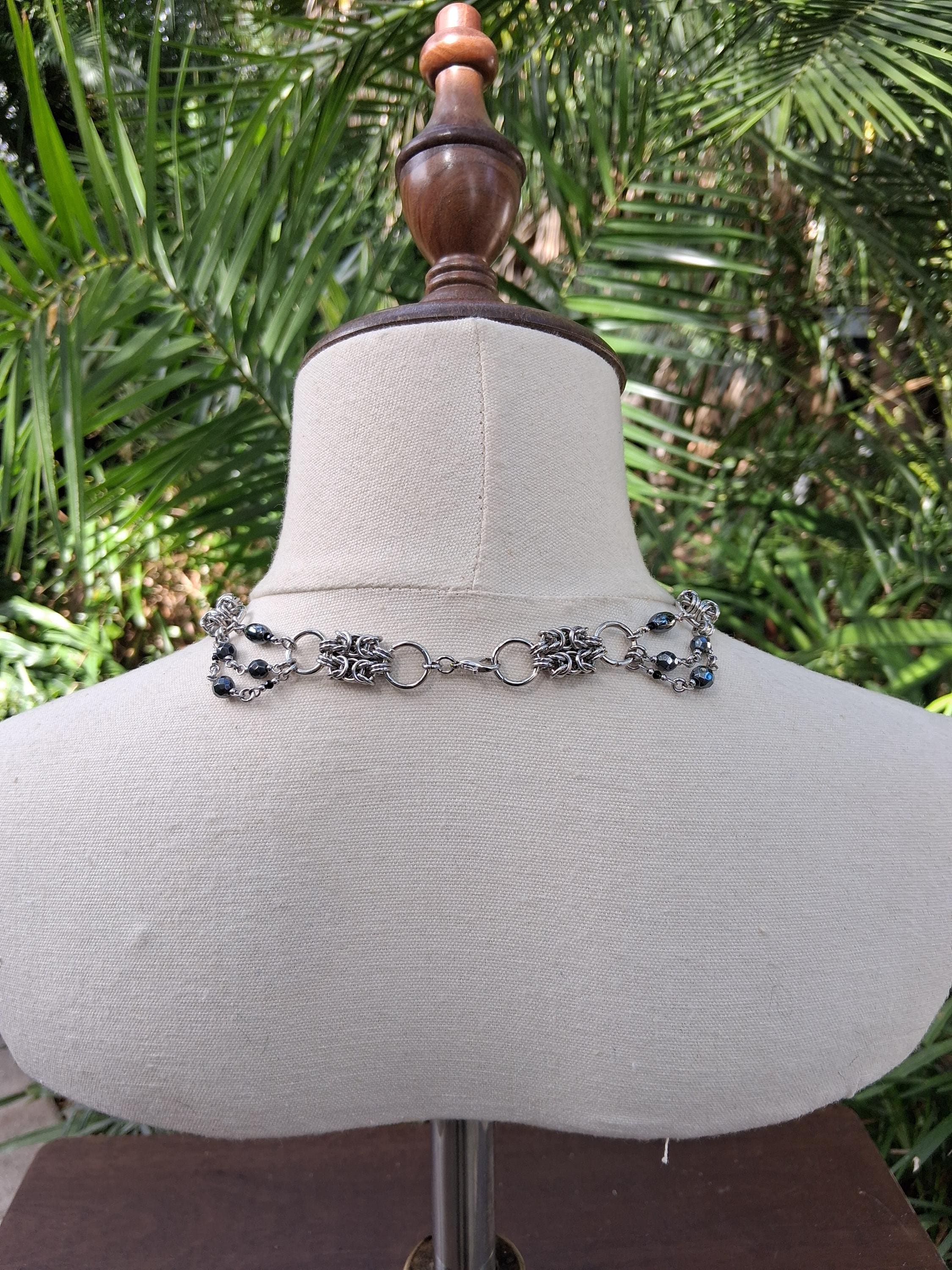 A bold statement of gothic elegance and quiet strength. Handcrafted with precision, this Byzantine chainmaille choker blends the resilience of stainless steel with the grounding shimmer of hematite.