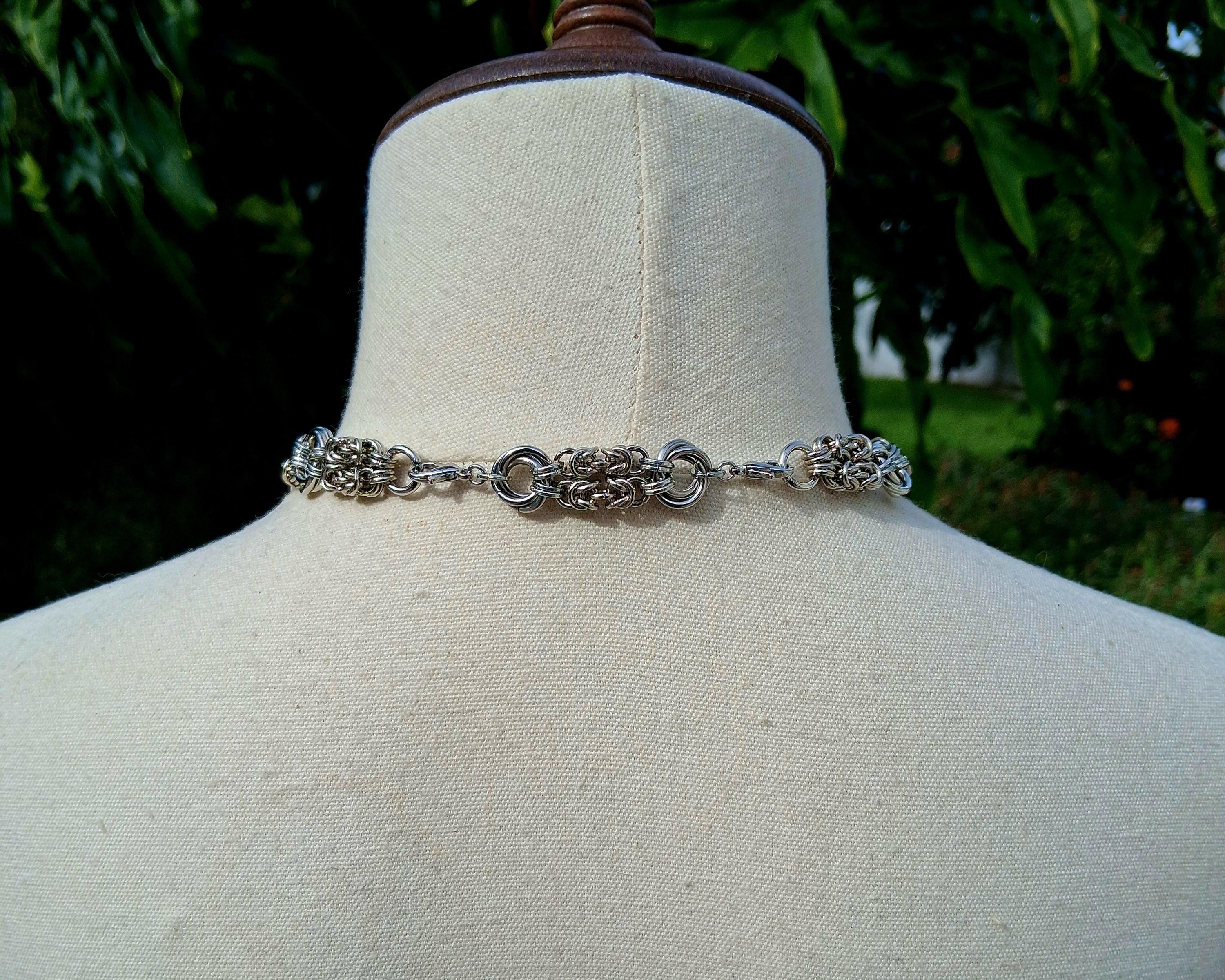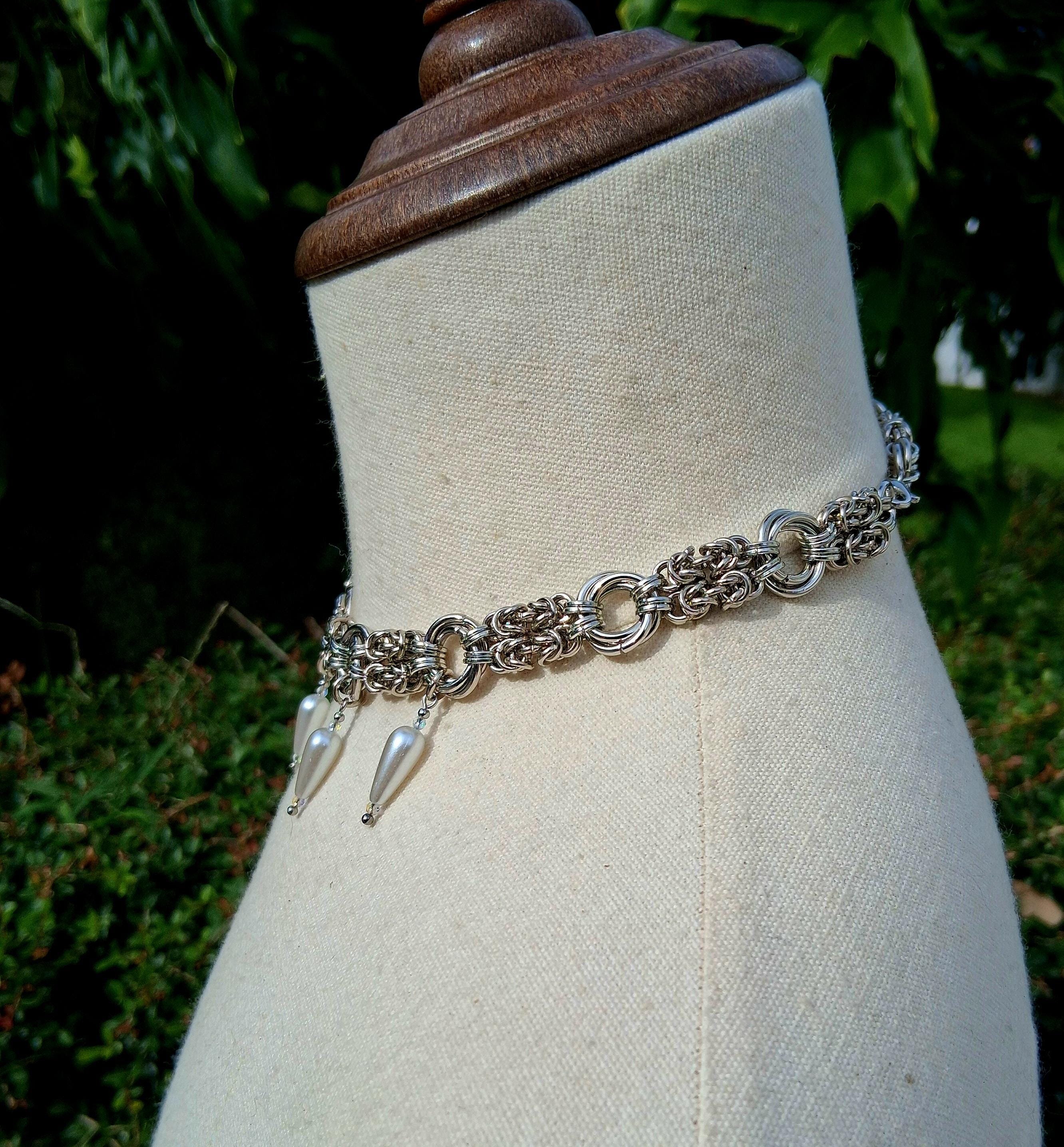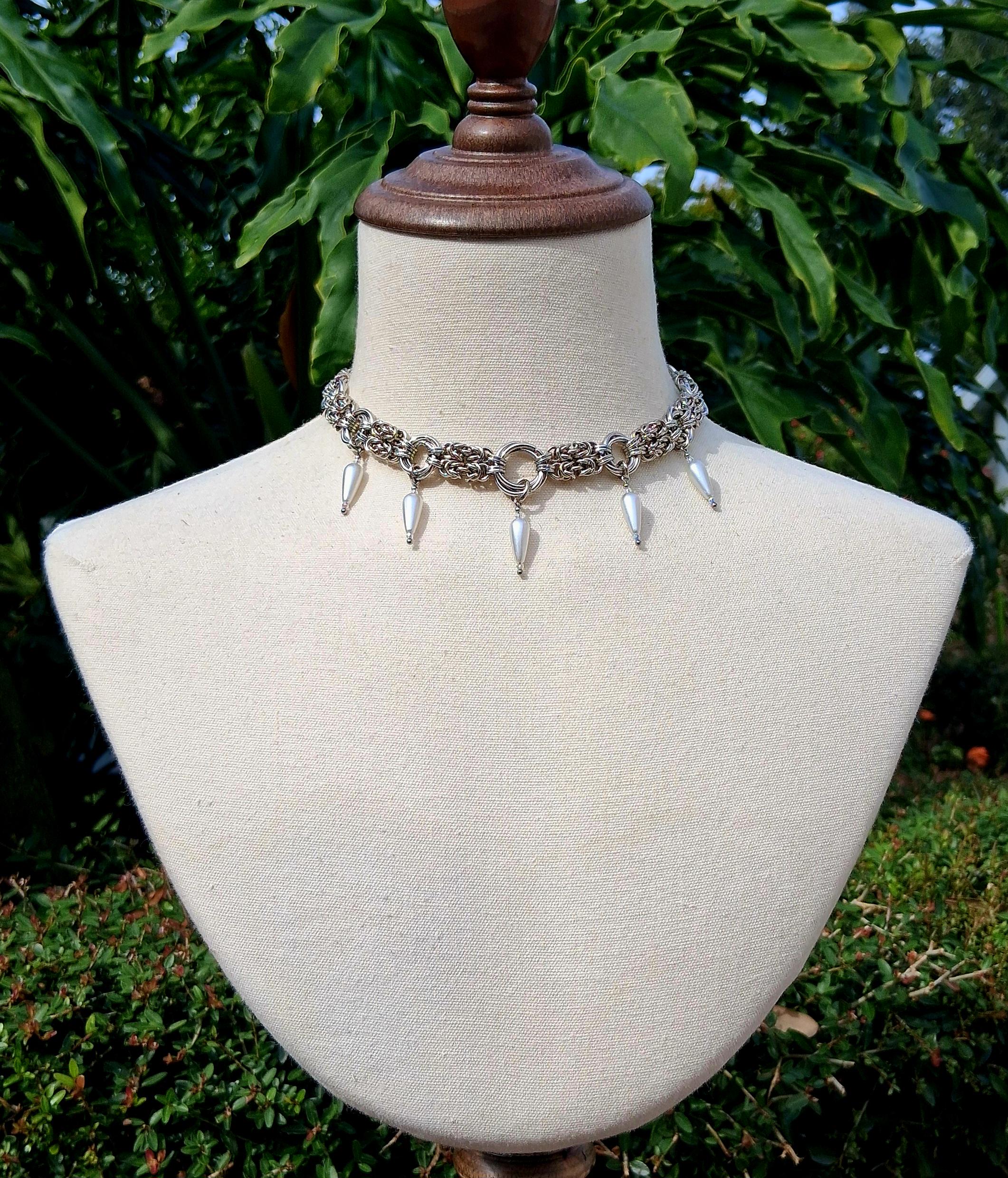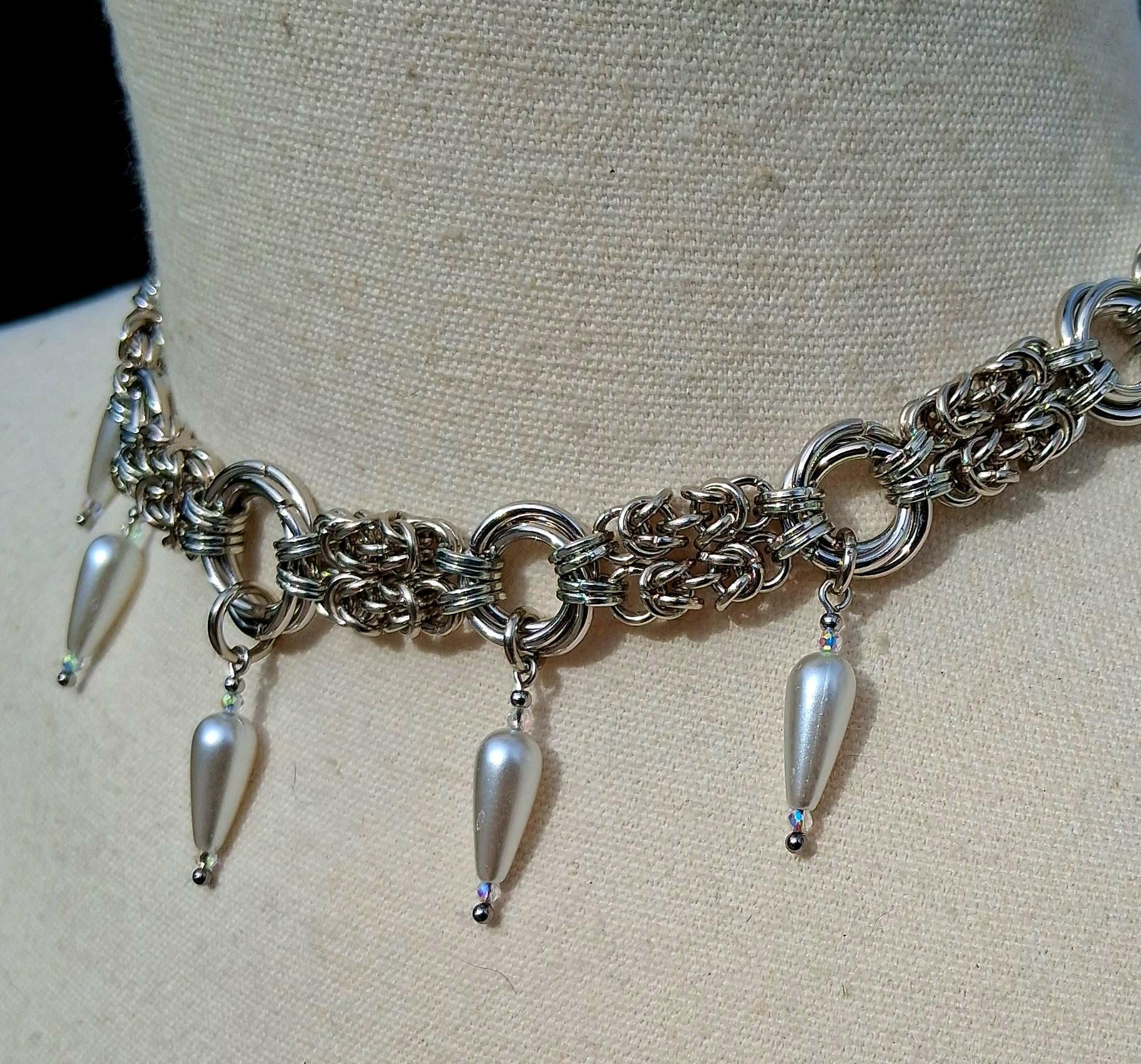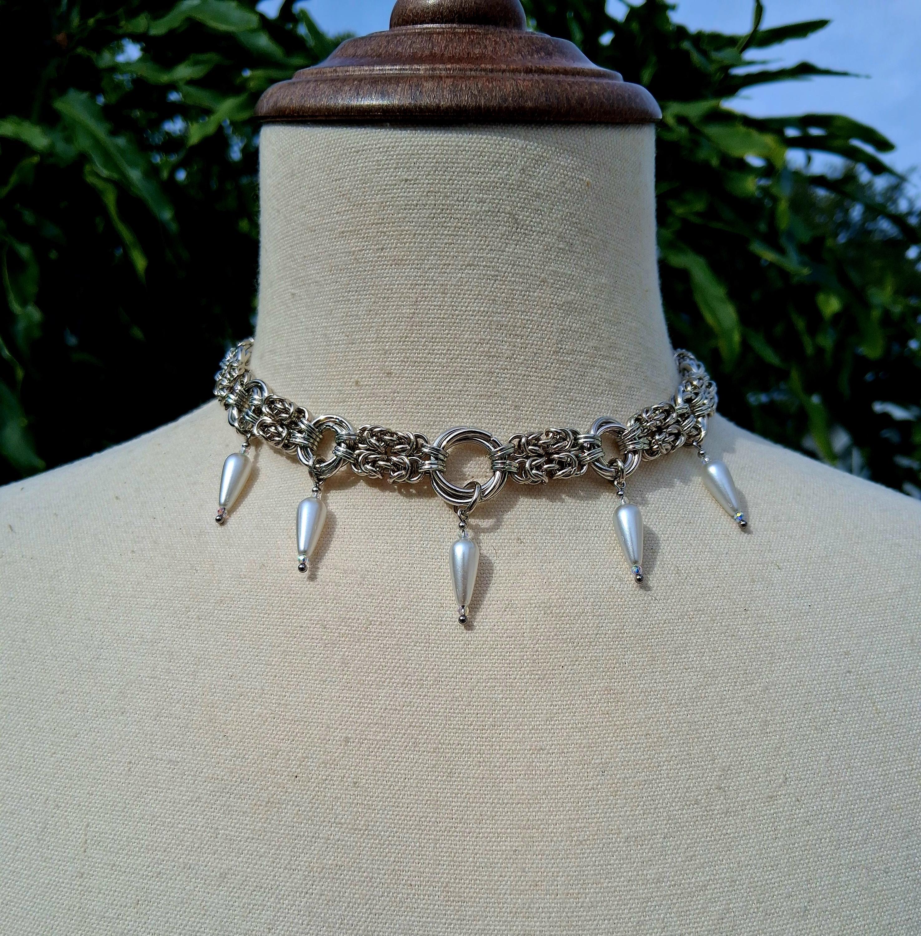 This romantic gothic choker captures timeless elegance with a touch of bold edge. Handwoven in a classic Byzantine chainmaille weave, each link is meticulously crafted from durable stainless steel for a lustrous shine that never tarnishes. The design is accented with soft white faux pearl teardrops and delicate glass bead details, adding a graceful contrast to the intricate metalwork.