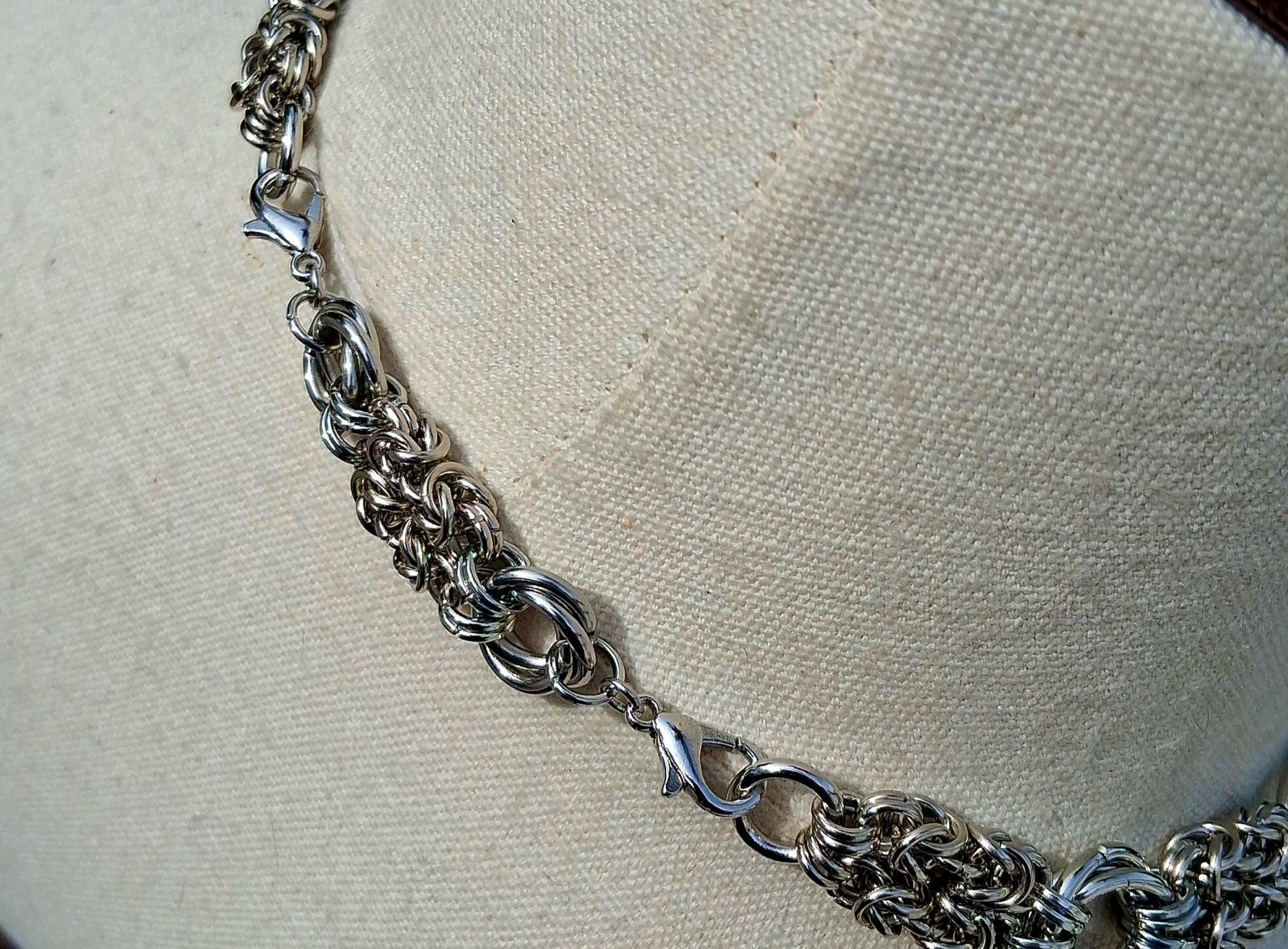 Details: • Stainless steel findings – strong, hypoallergenic, and tarnish-resistant • Faux pearl and glass bead accents • Byzantine chainmaille weave • Double lobster claw clasp for balance and symmetry • Approx. 15 inches in length (not adjustable)