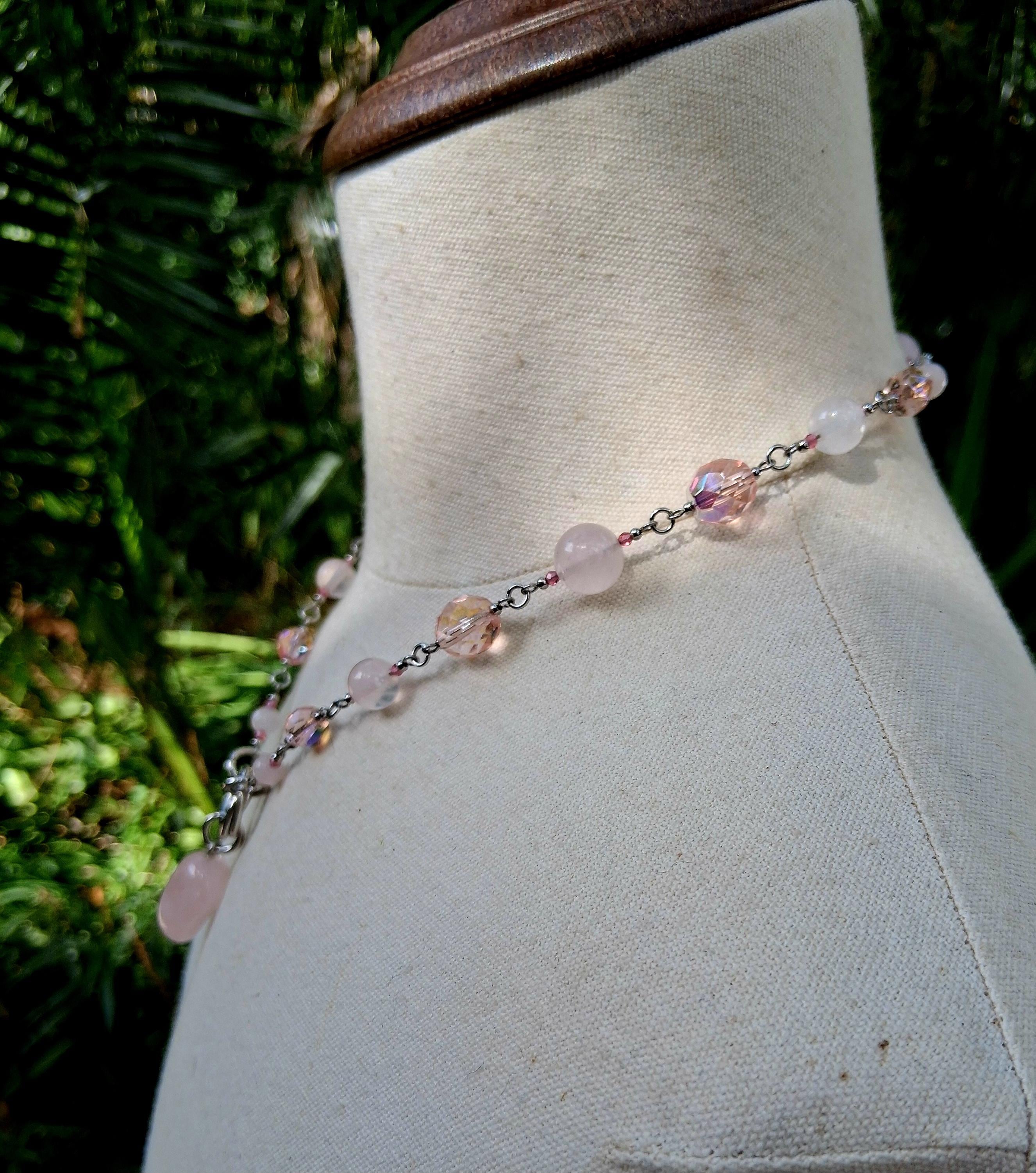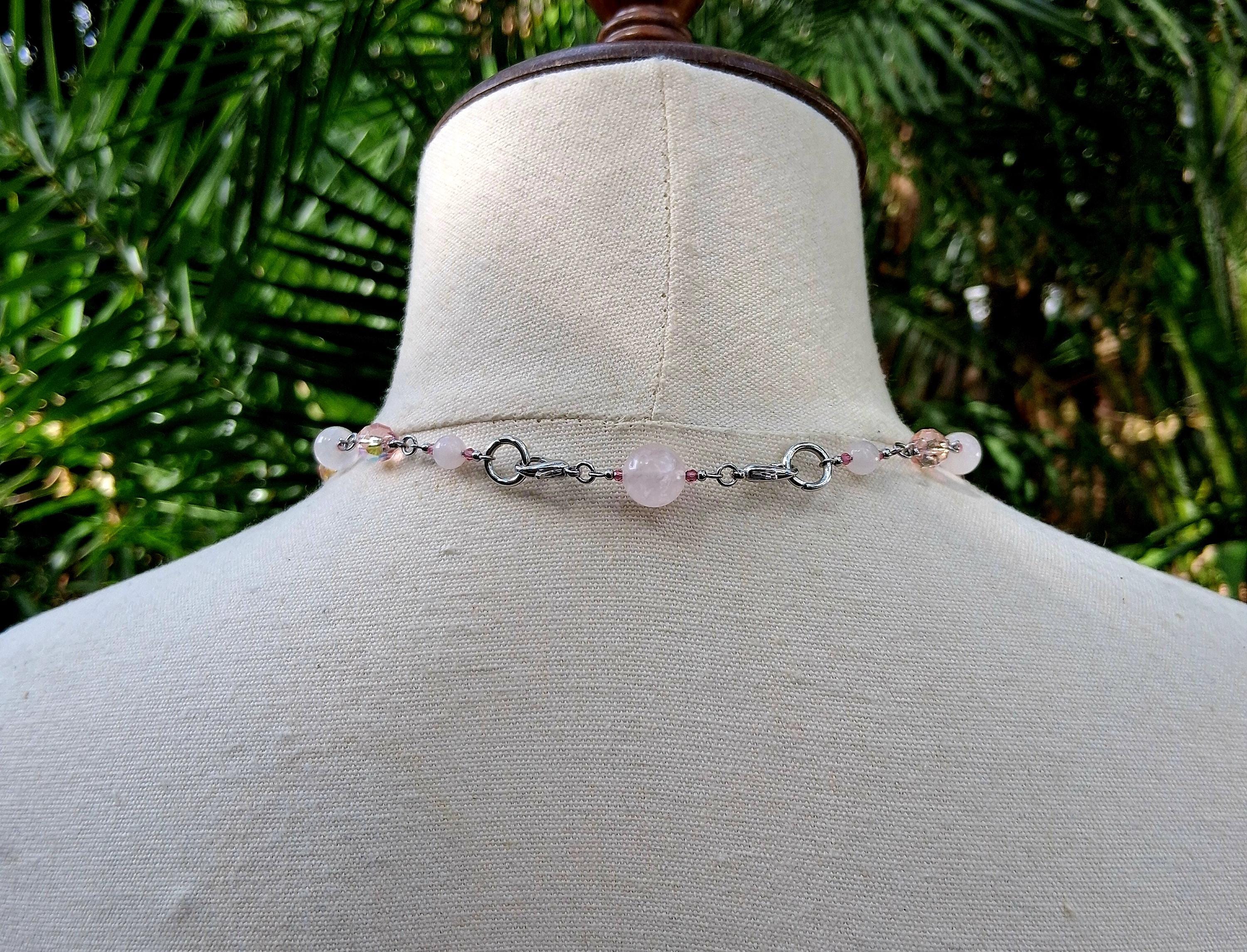 Soft, luminous, and effortlessly romantic—this handcrafted choker features smooth rose quartz beads paired with delicate glass accents that shimmer with a subtle blush hue. A polished stainless-steel chain and double lobster-claw clasp lend a modern edge while ensuring lasting durability.