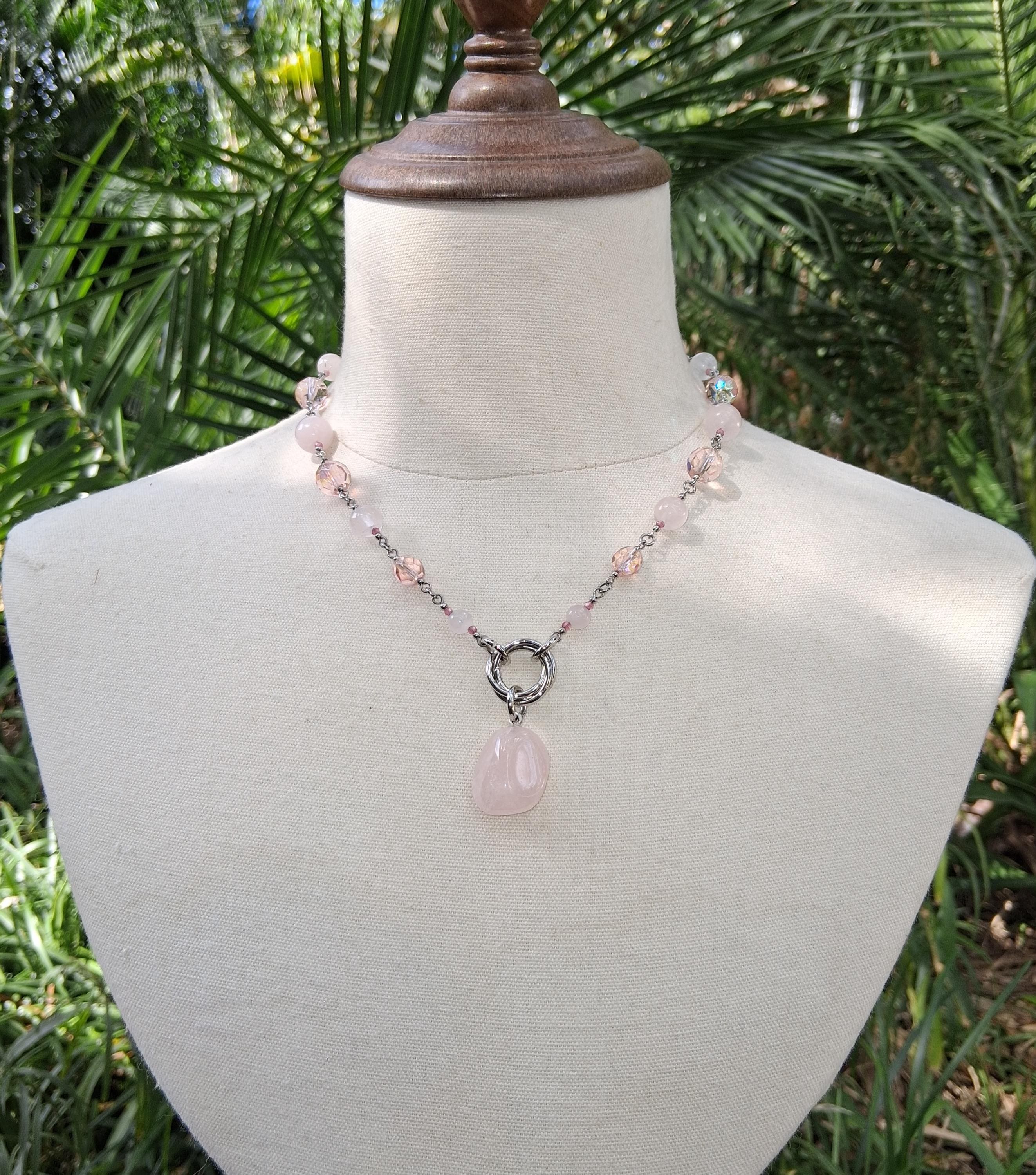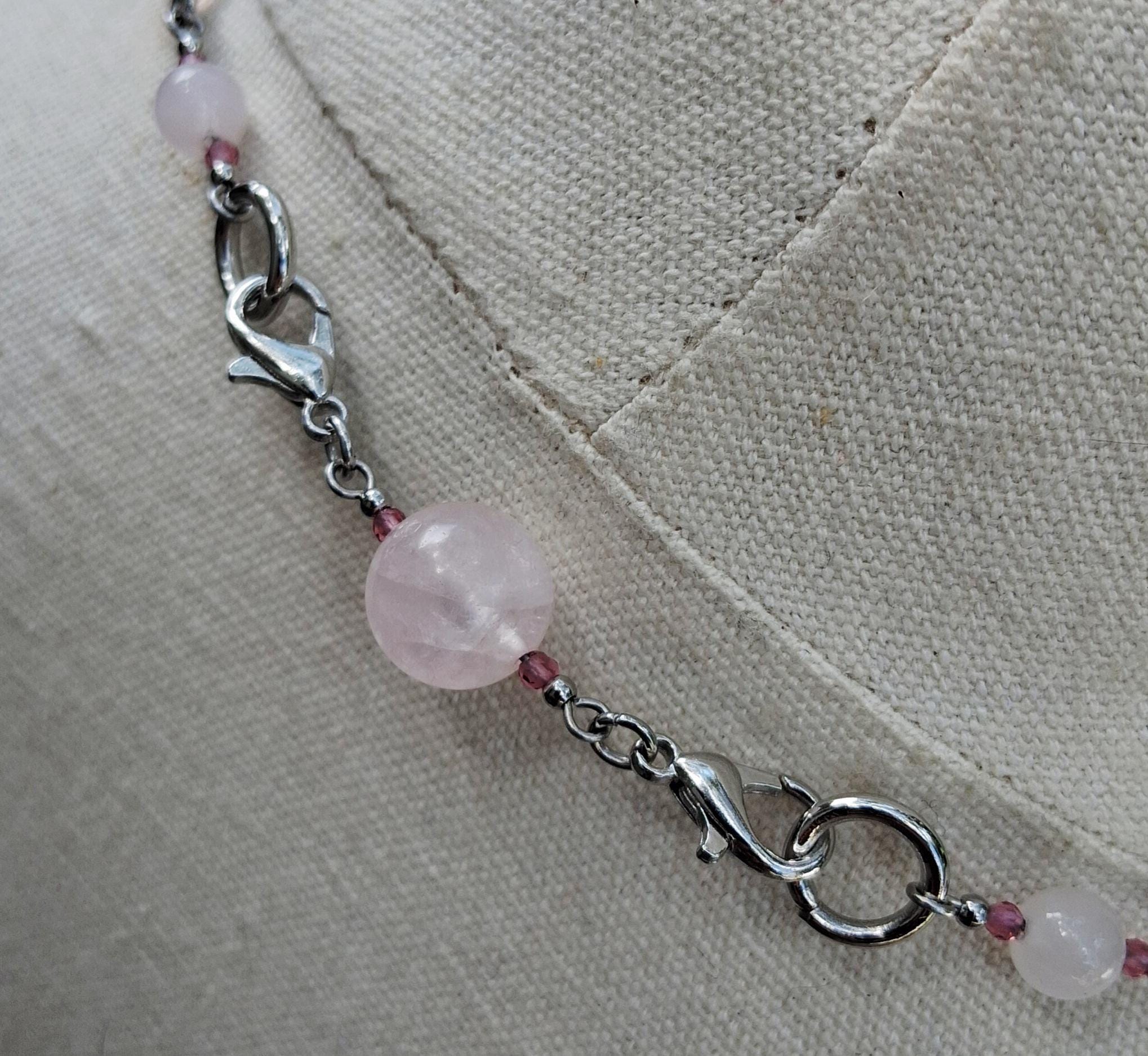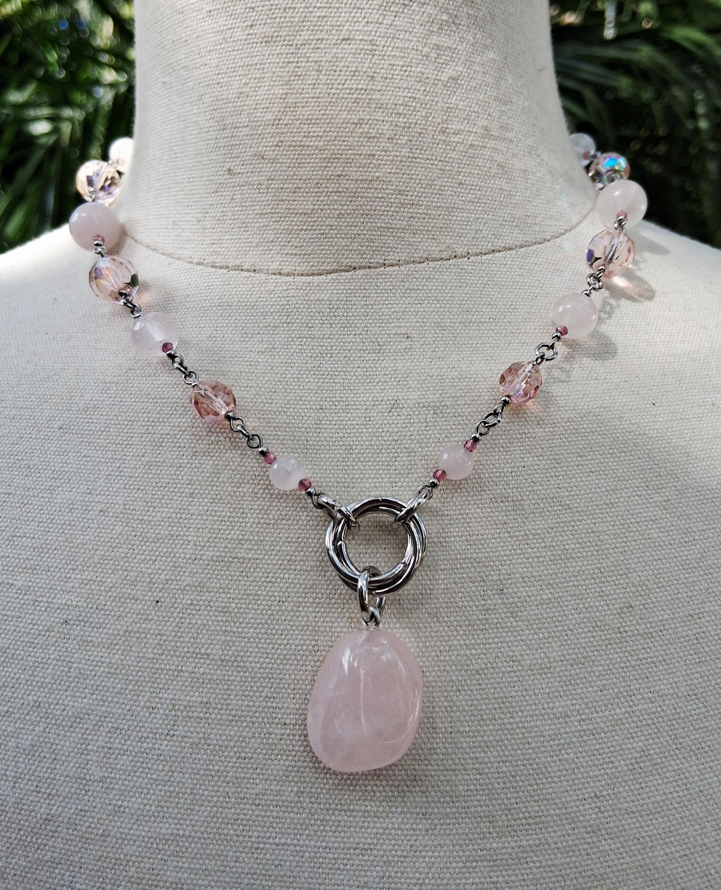 At the center hangs a tumbled rose quartz pendant, known as the Stone of Love—a crystal said to open the heart, invite emotional healing, and radiate calming, compassionate energy.