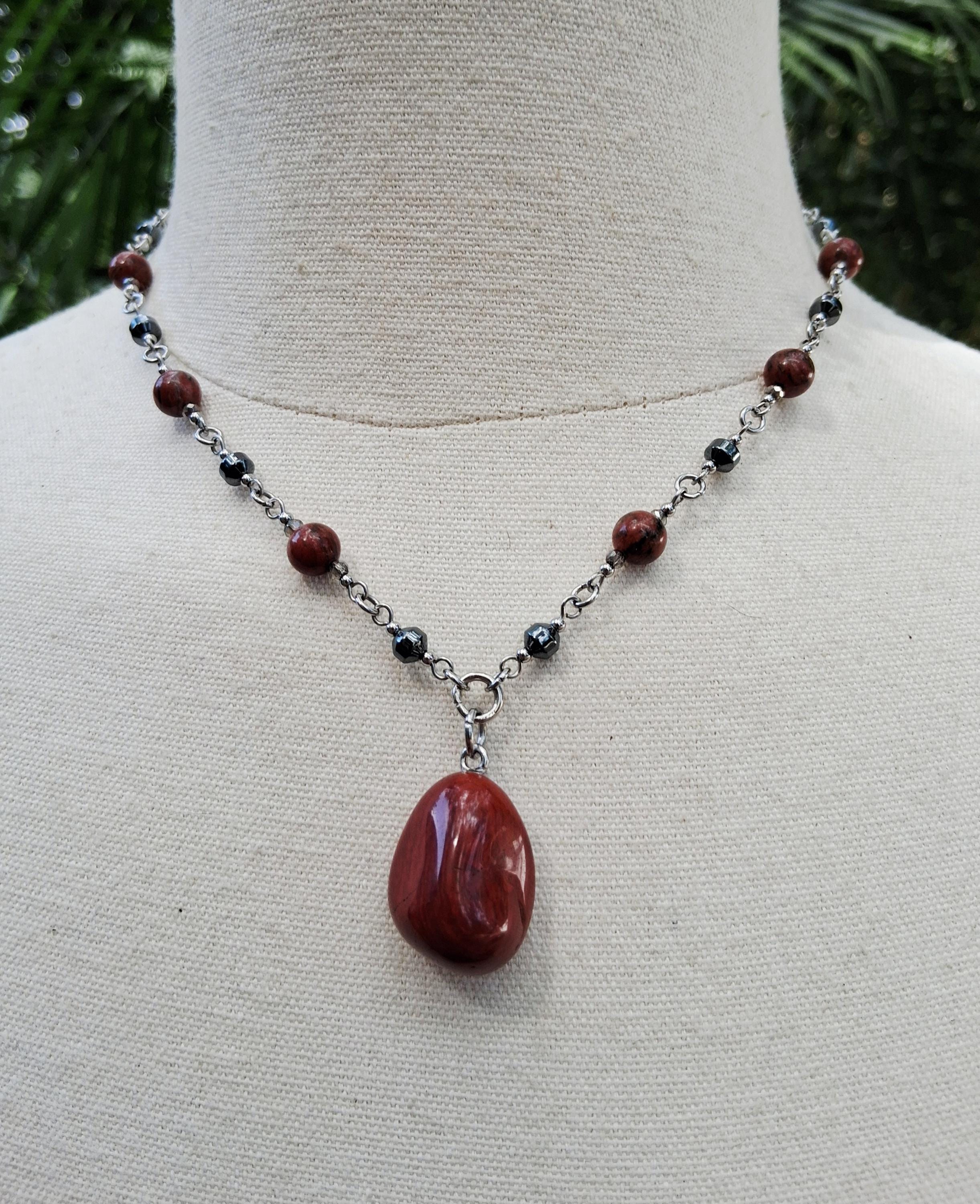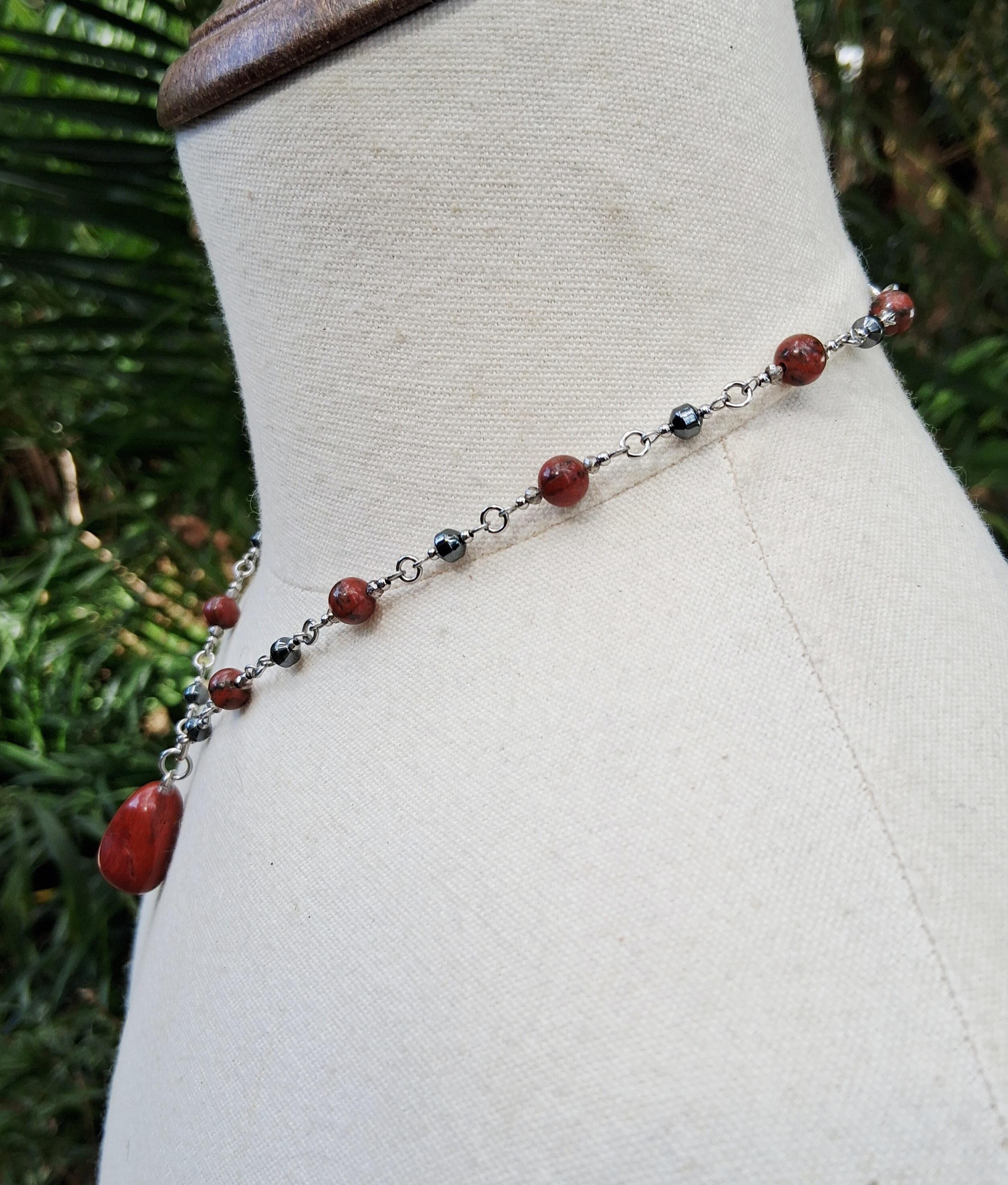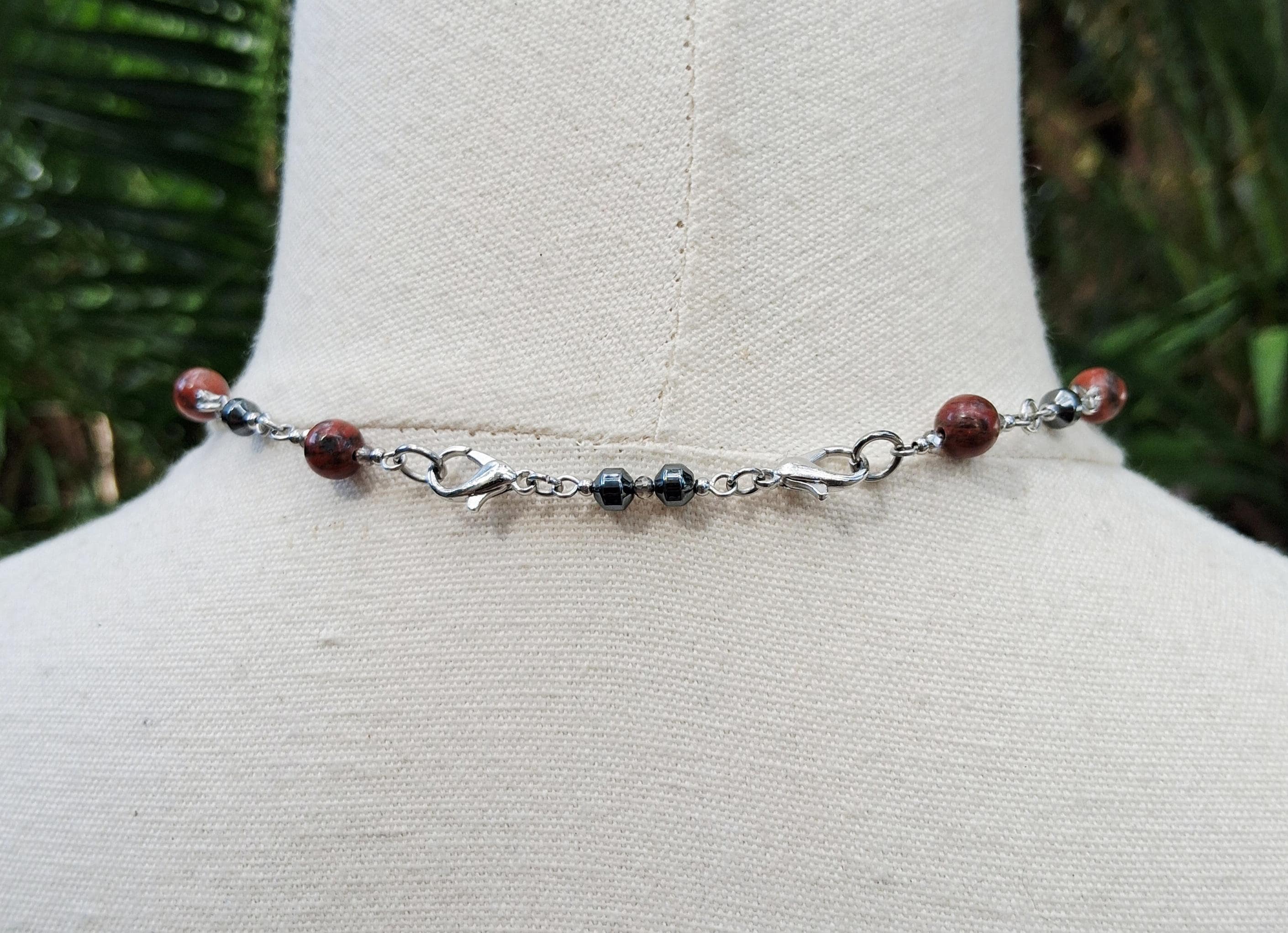 Grounded elegance meets earthy energy in this handcrafted choker featuring a polished Red Sesame Jasper pendant accented by matching jasper beads, glossy hematite, and glass accents. Each bead is linked with durable stainless-steel wire for lasting strength and shine. Finished with BaublesByBelladanka’s signature double lobster-claw clasp for symmetry and security.