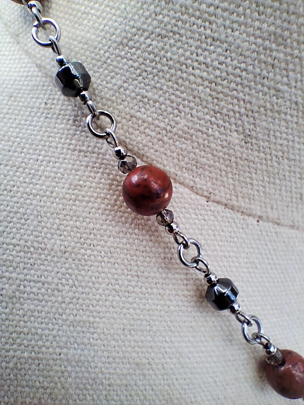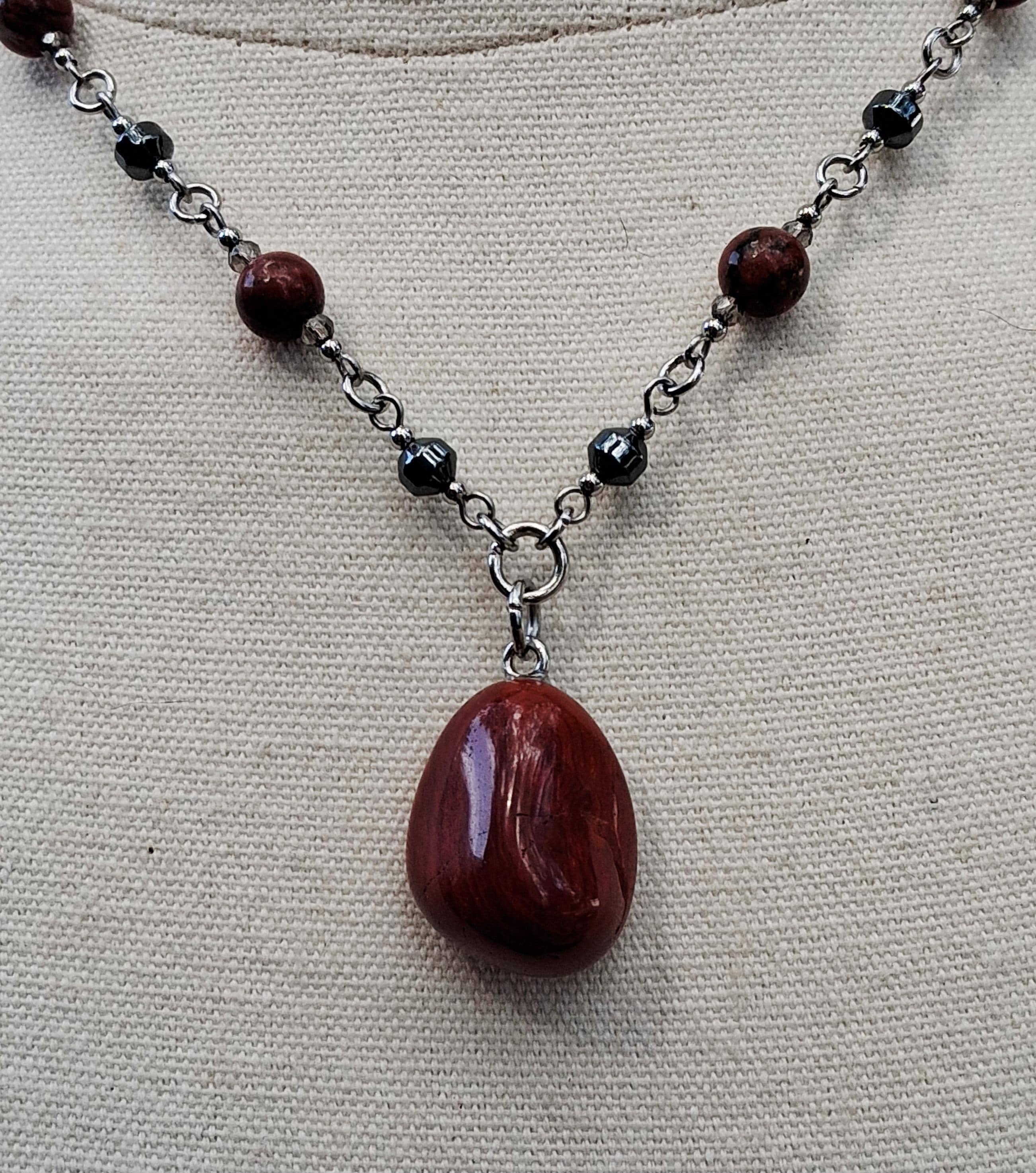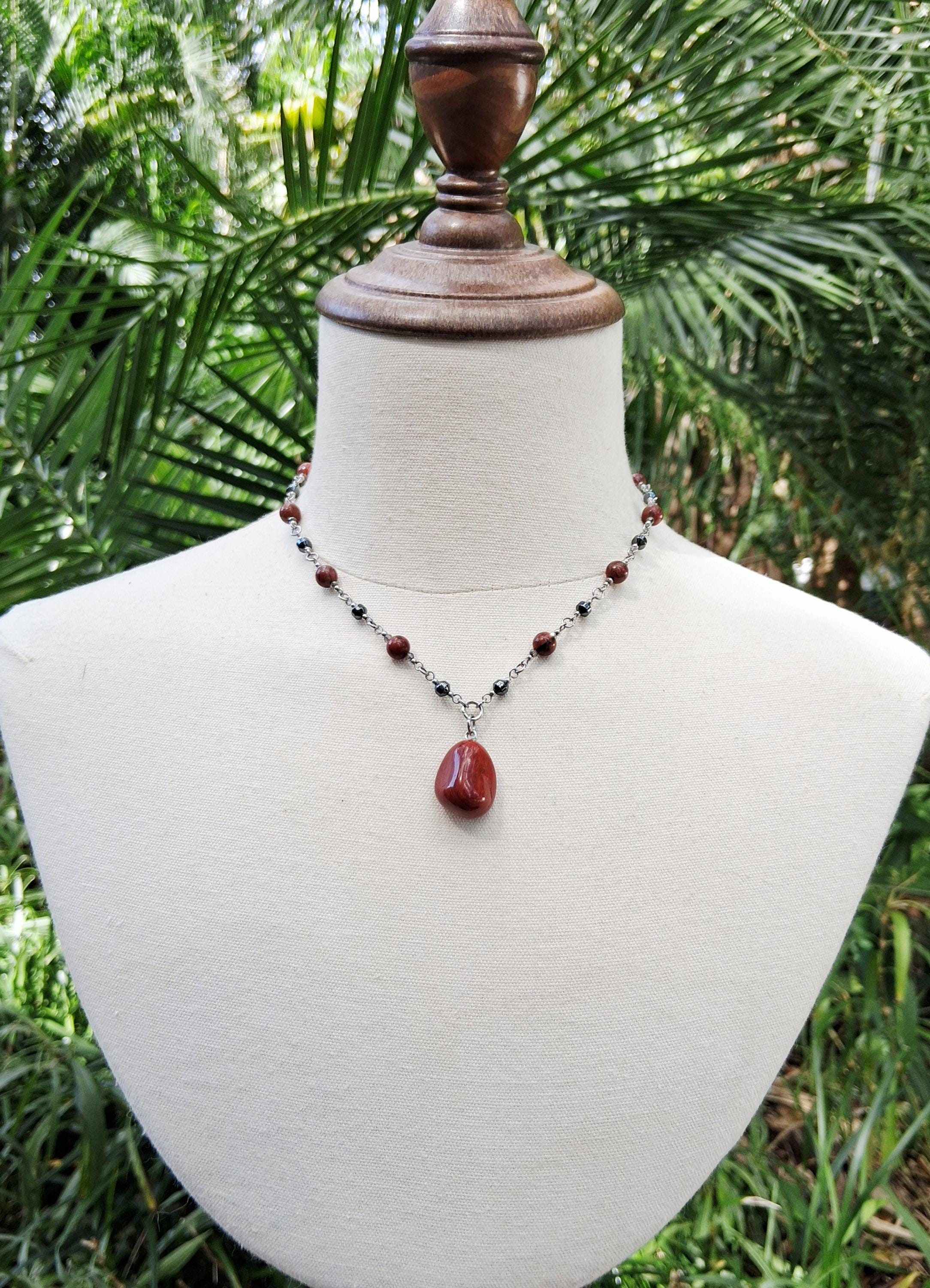 Grounded elegance meets earthy energy in this handcrafted choker featuring a polished Red Sesame Jasper pendant accented by matching jasper beads, glossy hematite, and glass accents. Each bead is linked with durable stainless-steel wire for lasting strength and shine. Finished with BaublesByBelladanka’s signature double lobster-claw clasp for symmetry and security.
