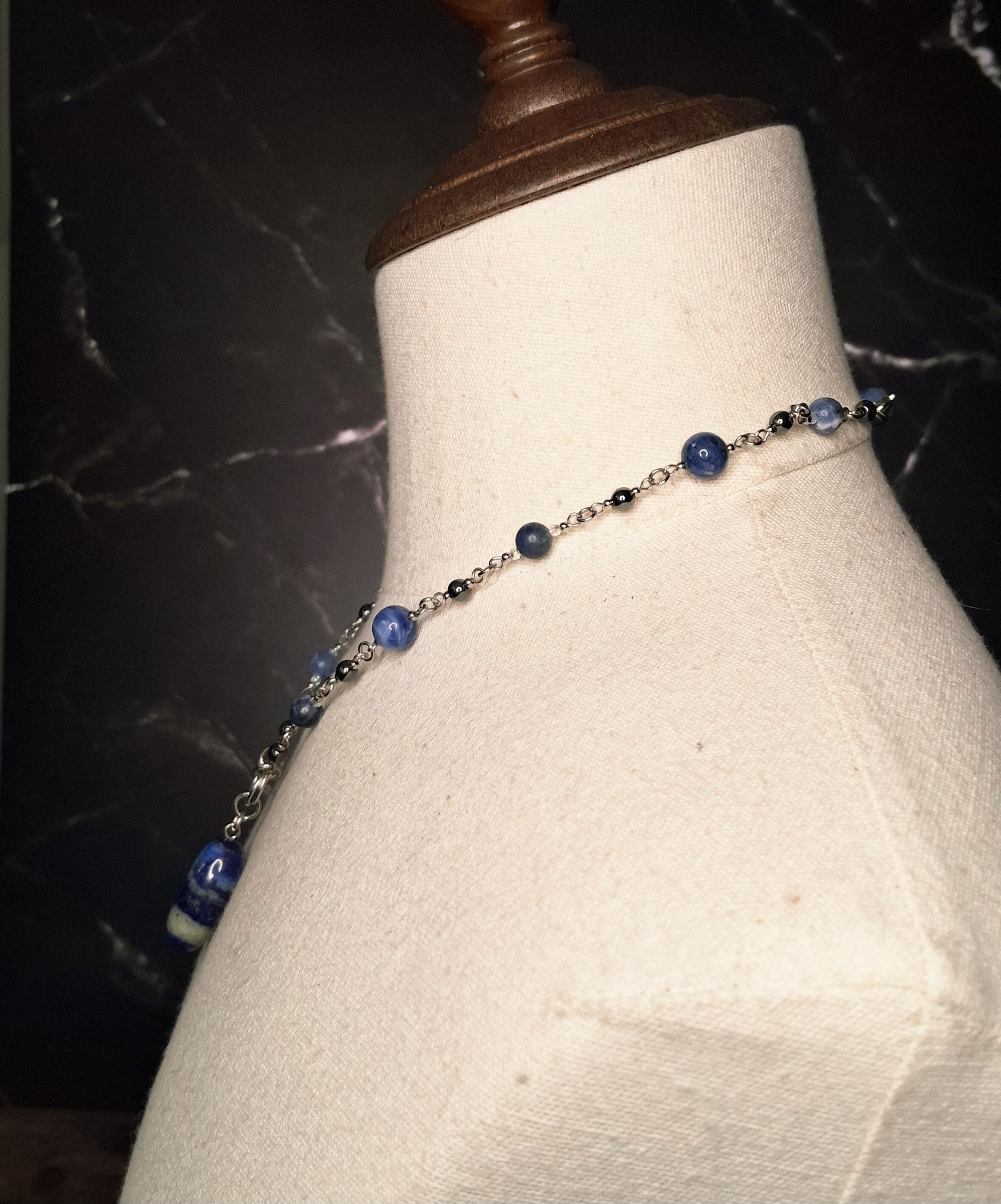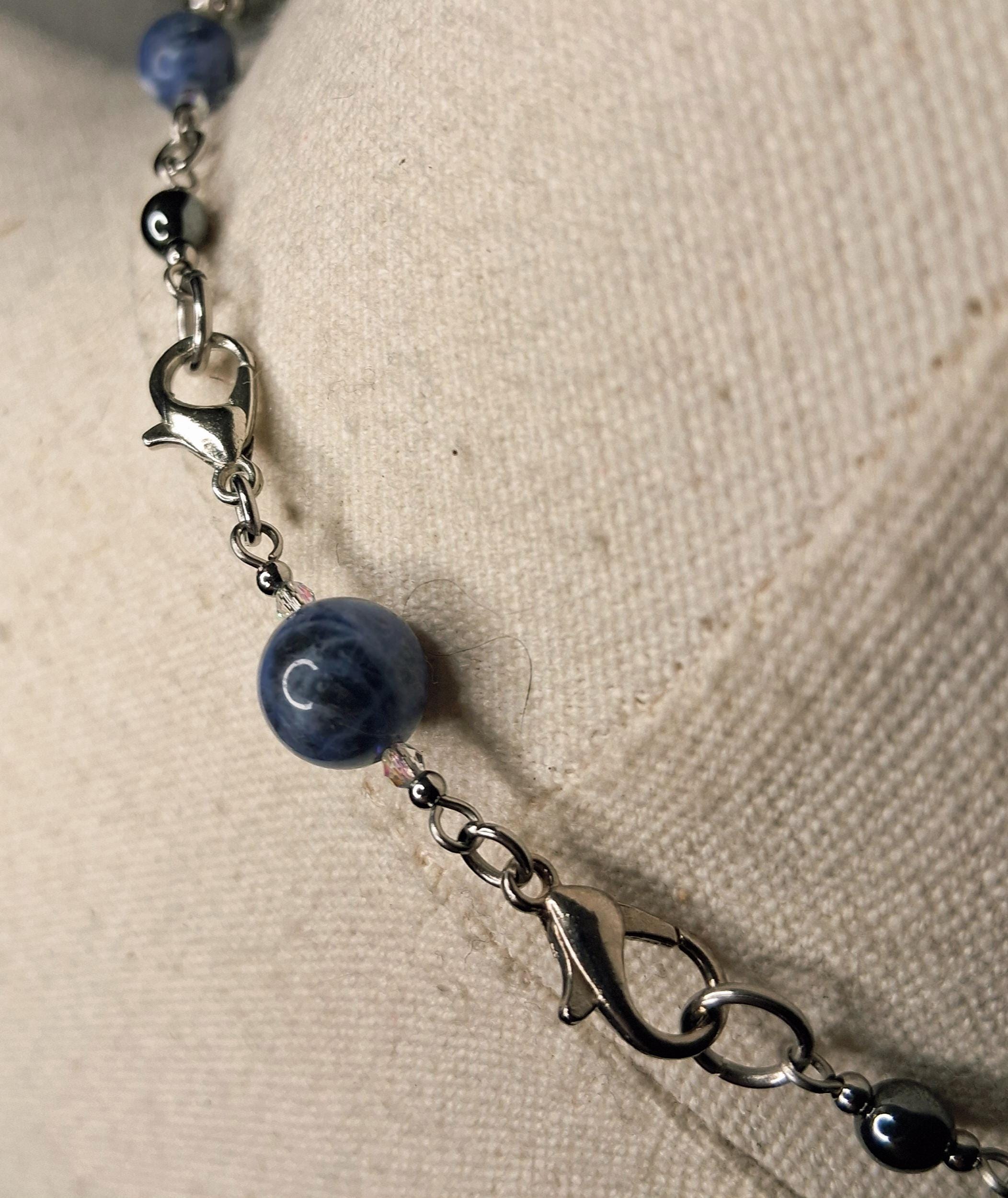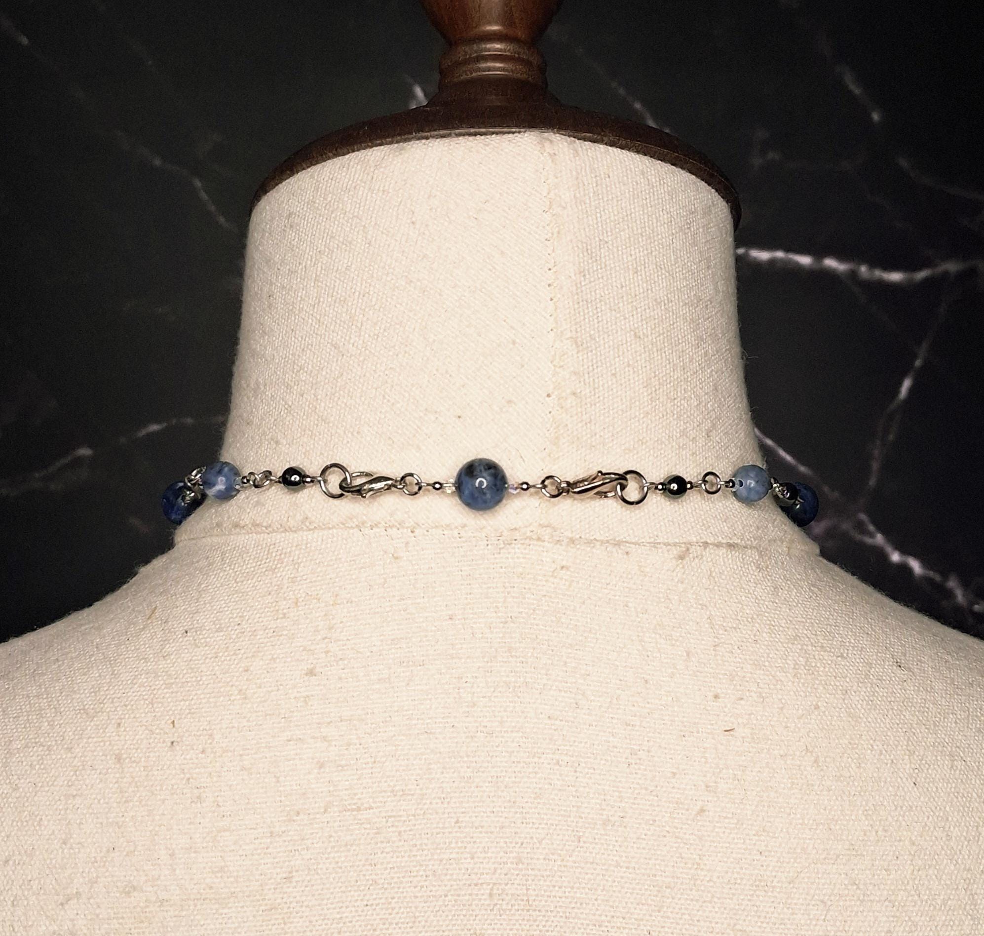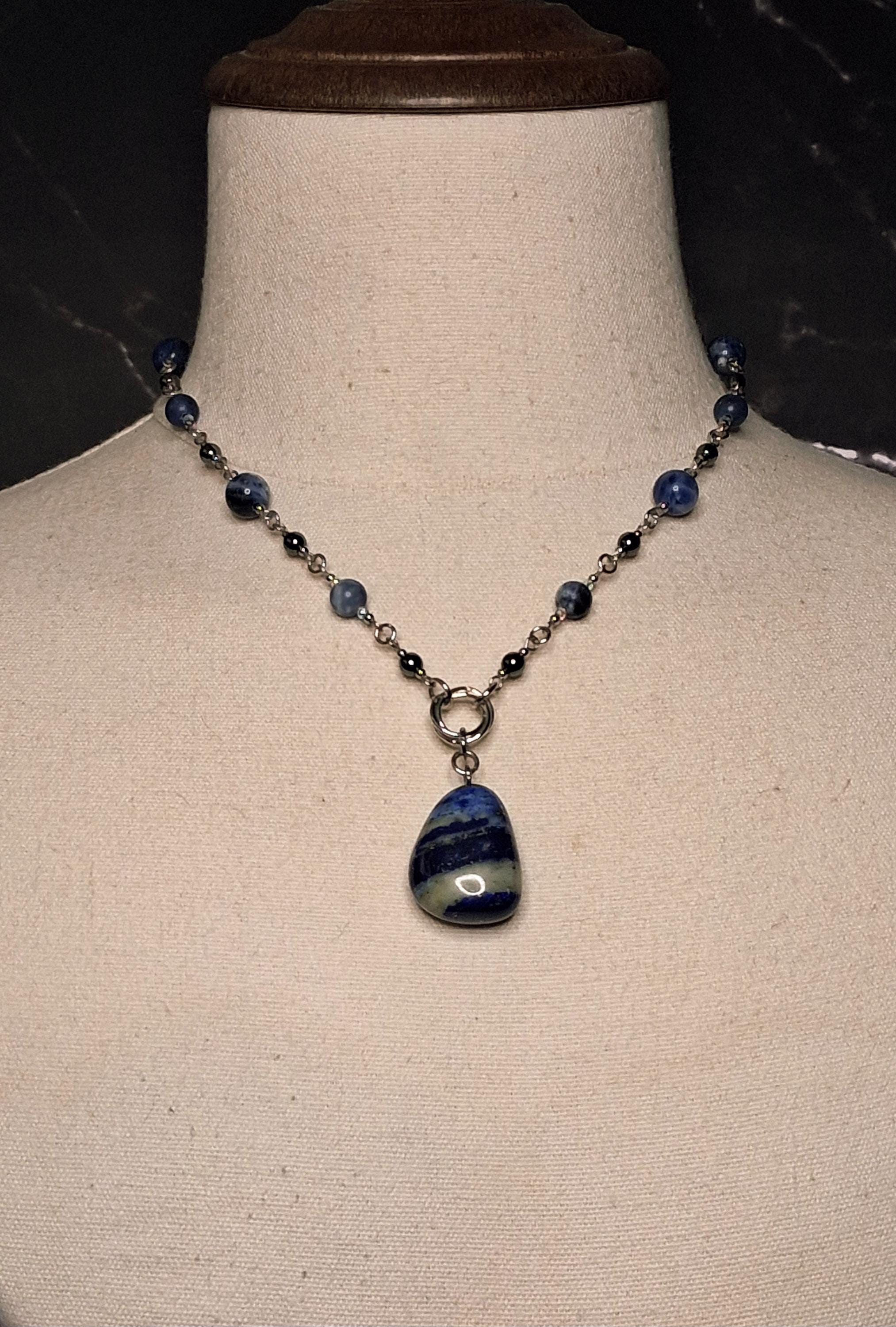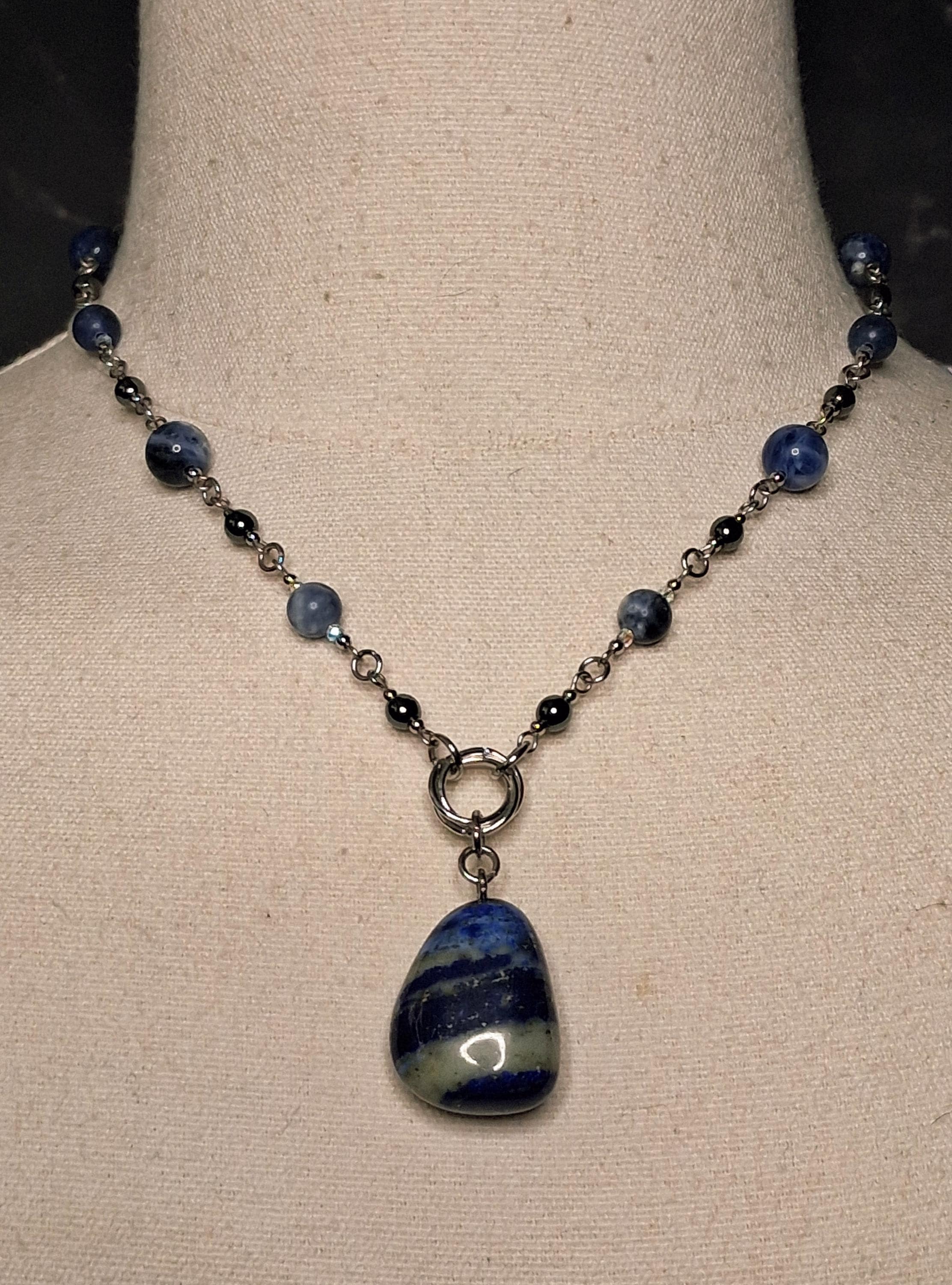 This handmade necklace features a polished Sodalite pendant paired with coordinating Sodalite beads and grounding Hematite accents, all set in durable stainless steel. The design is finished with my signature double lobster claw clasp, adding both visual balance and a distinctive industrial detail.