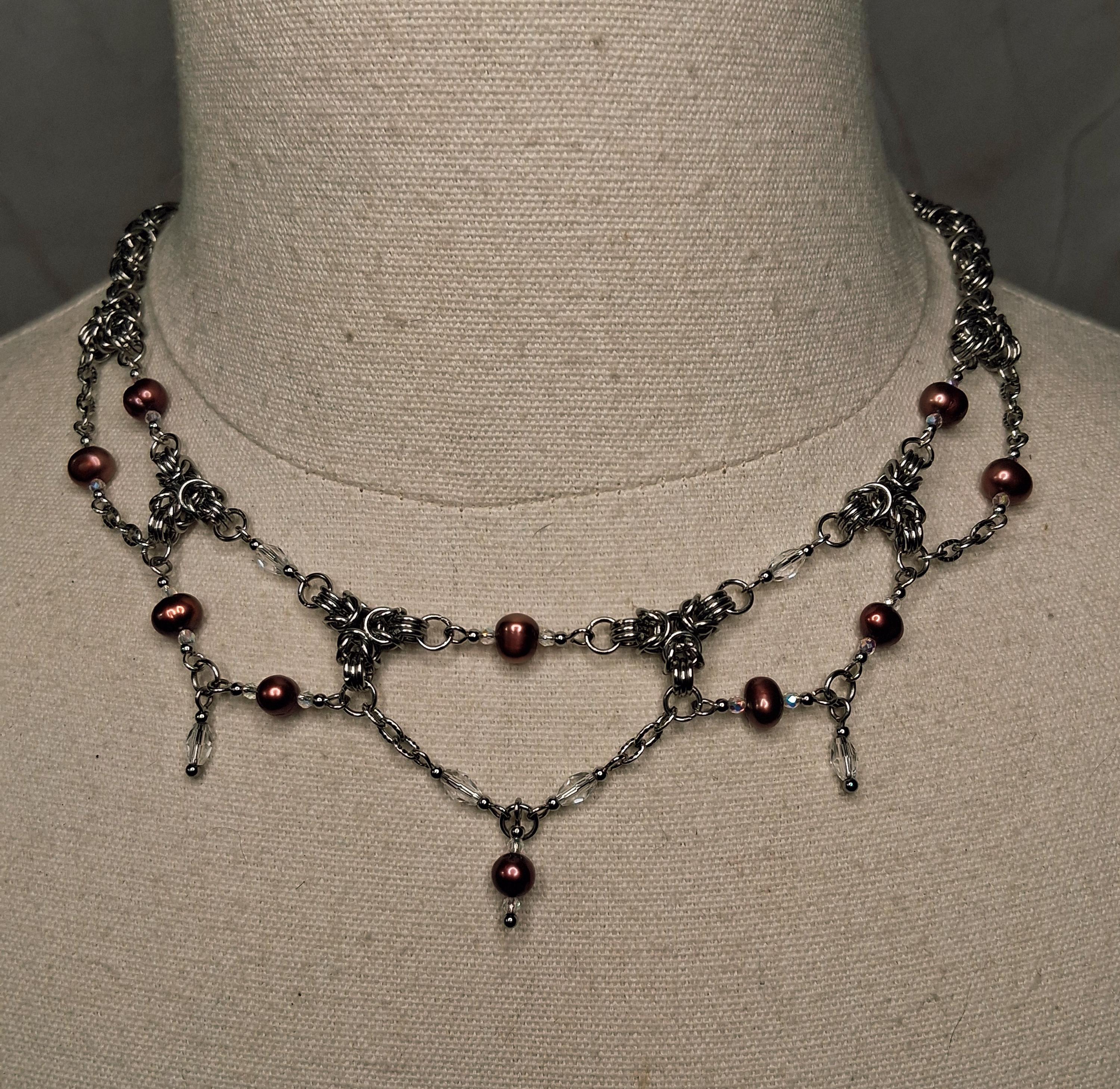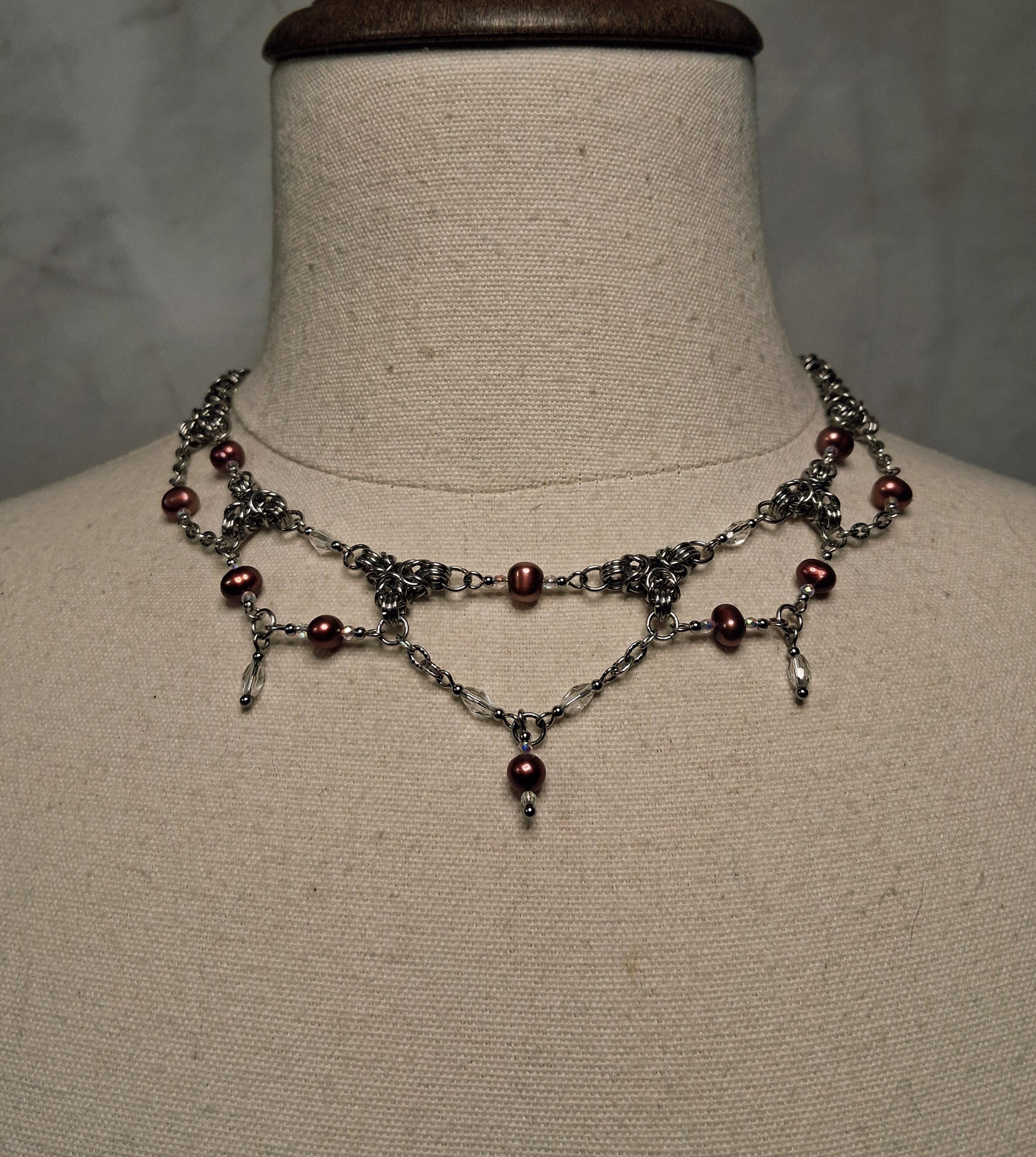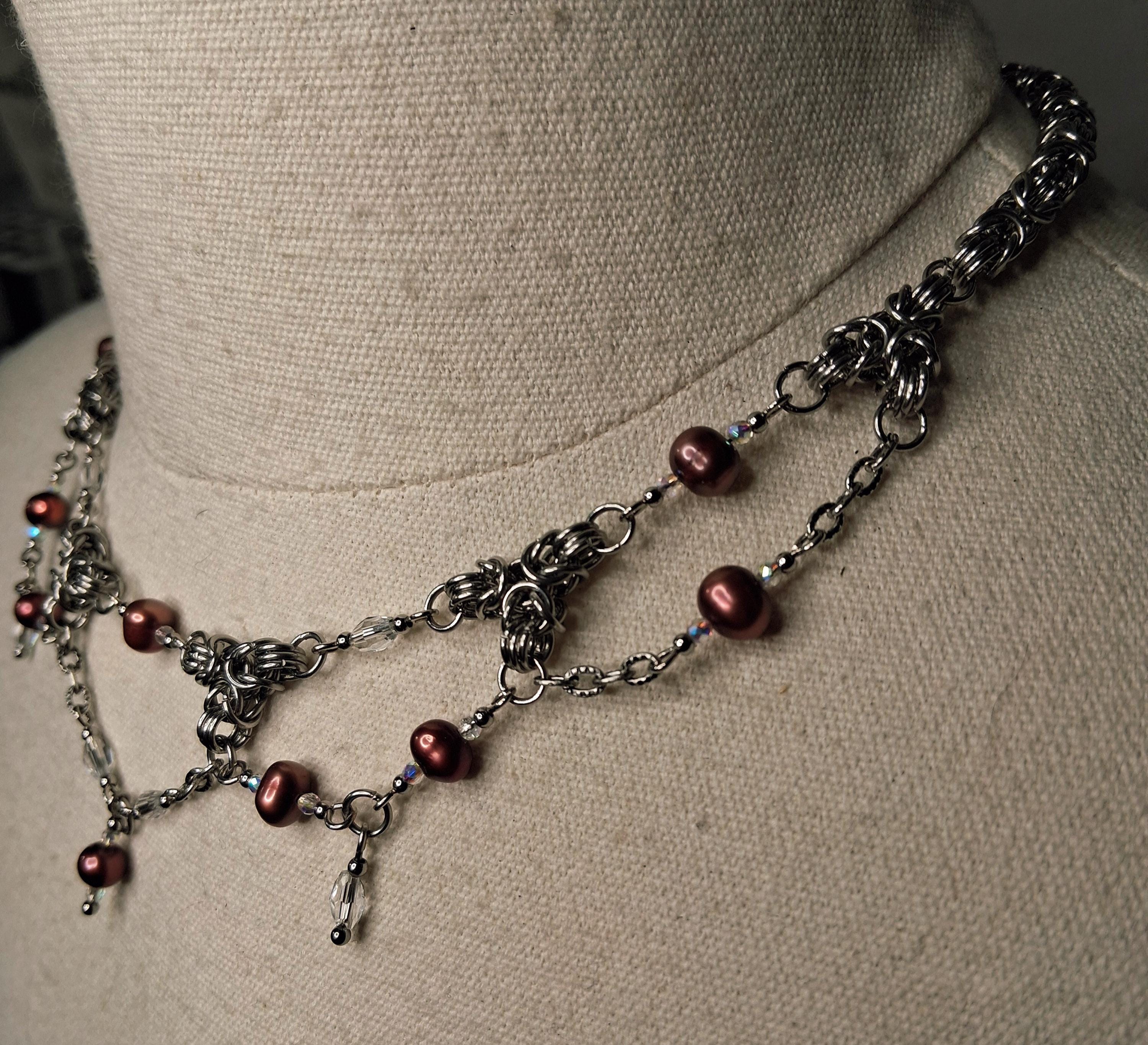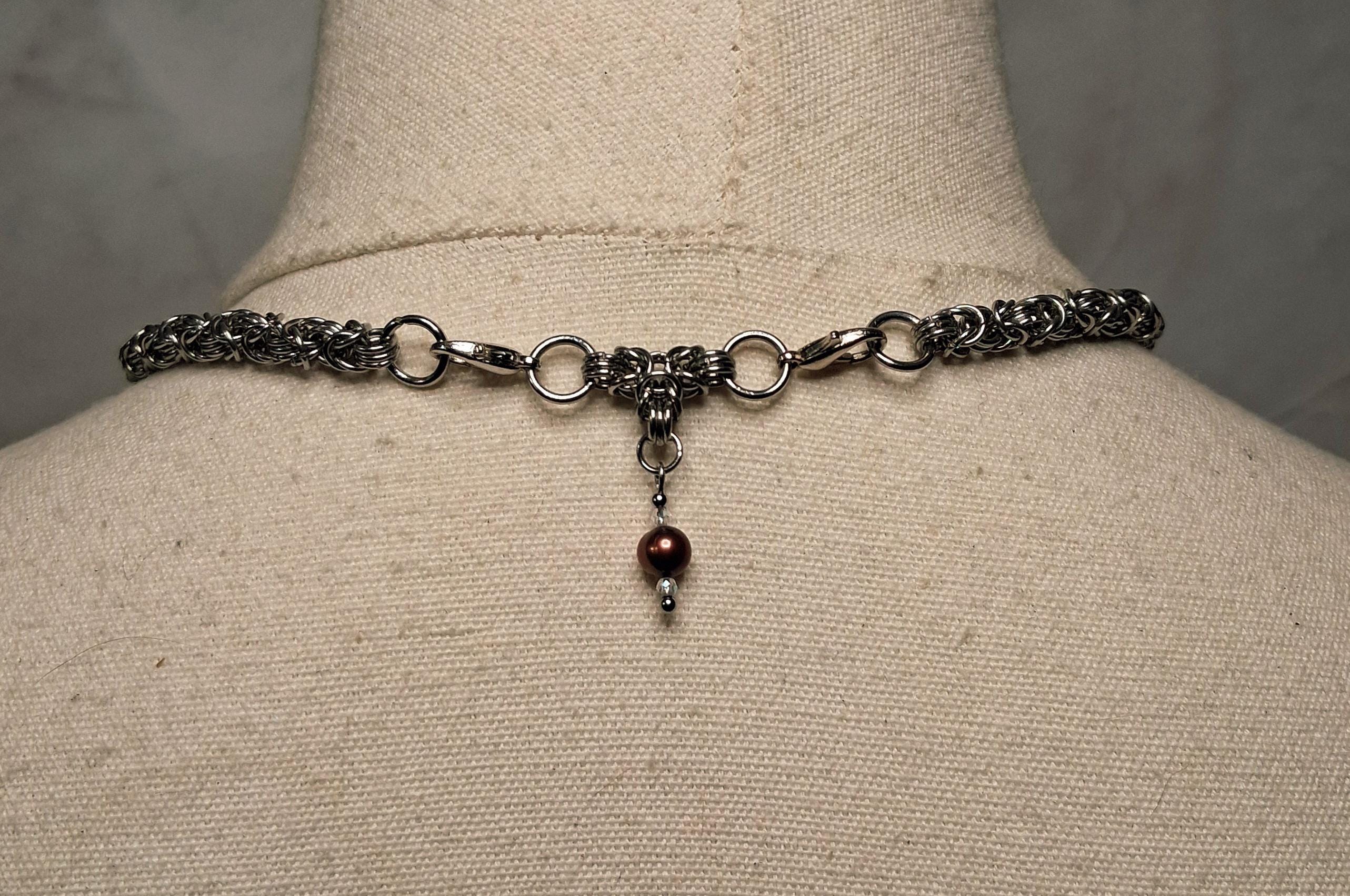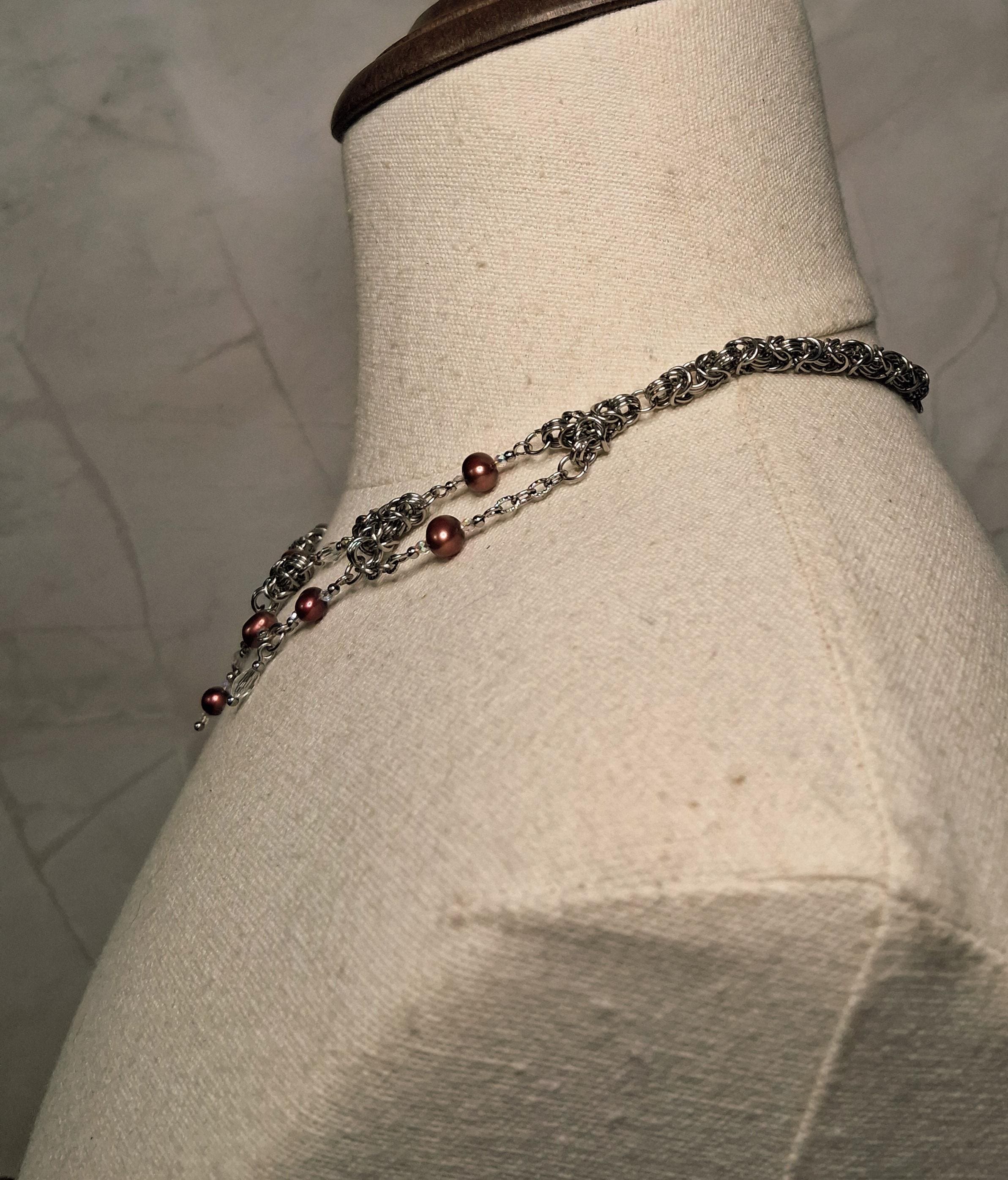 The stainless steel Byzantine weave adds weight, texture, and durability, while delicate glass bead accents and freshwater pearls introduce movement and subtle shimmer. Designed to sit high and close to the neck, this necklace makes a powerful statement on its own or layered with longer chains.