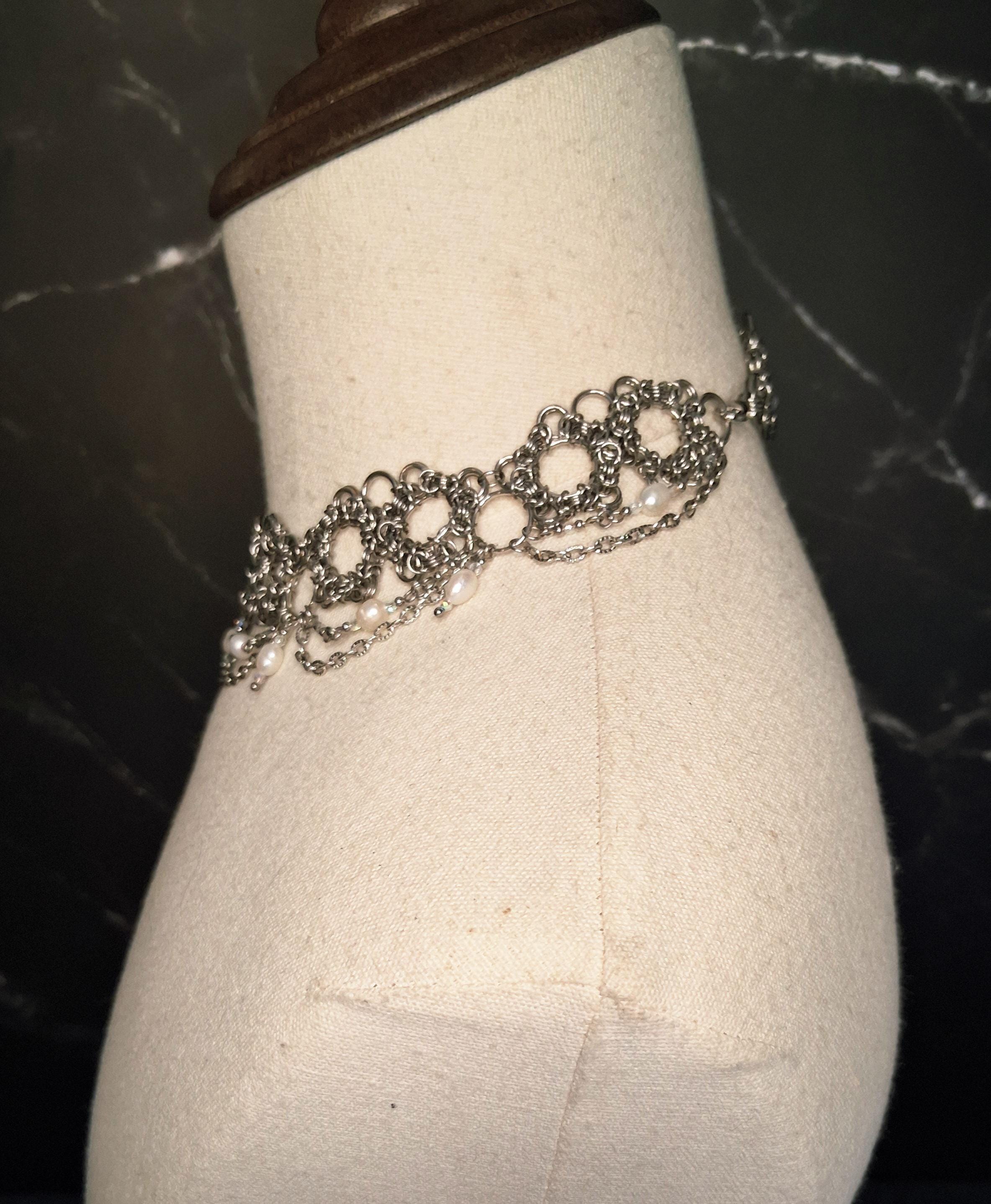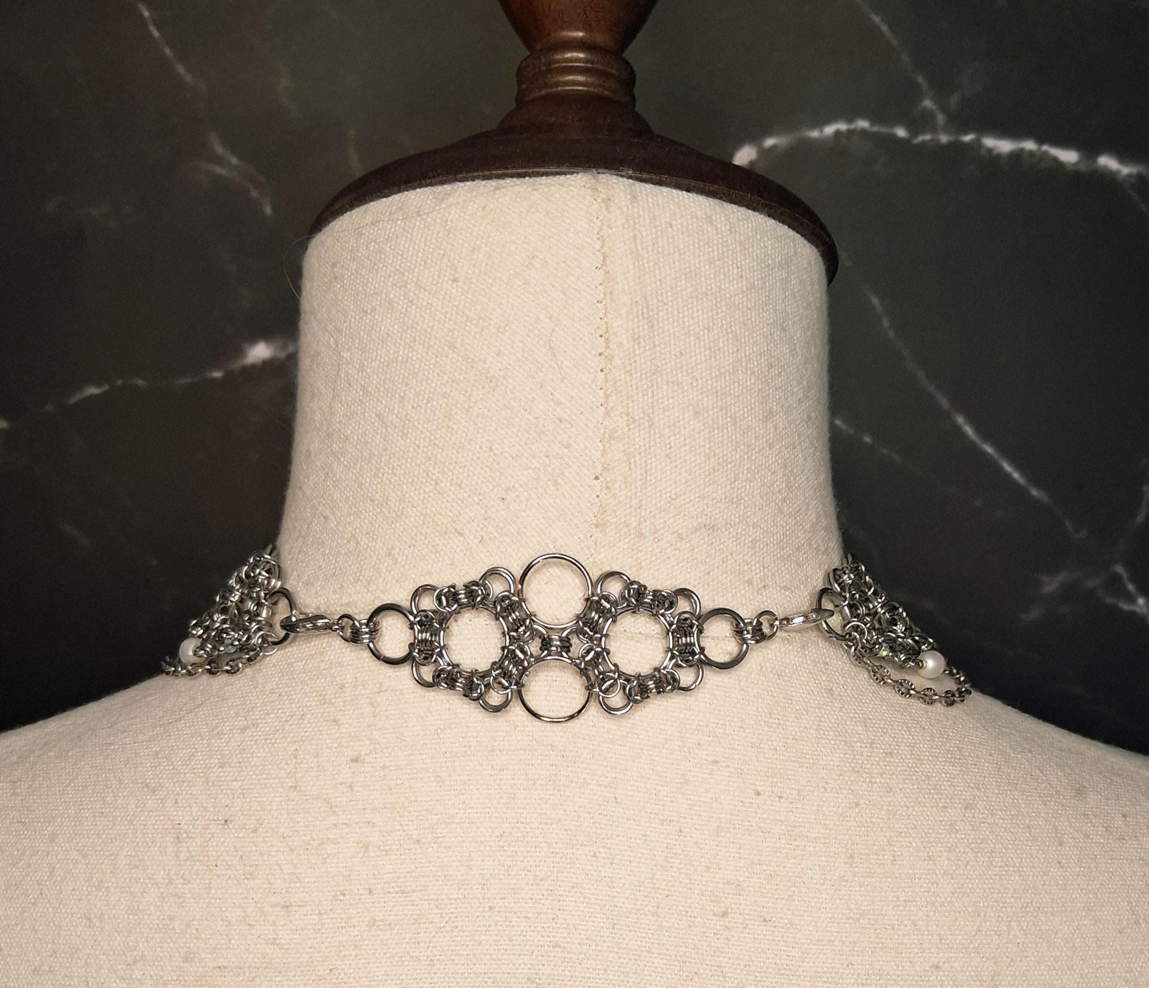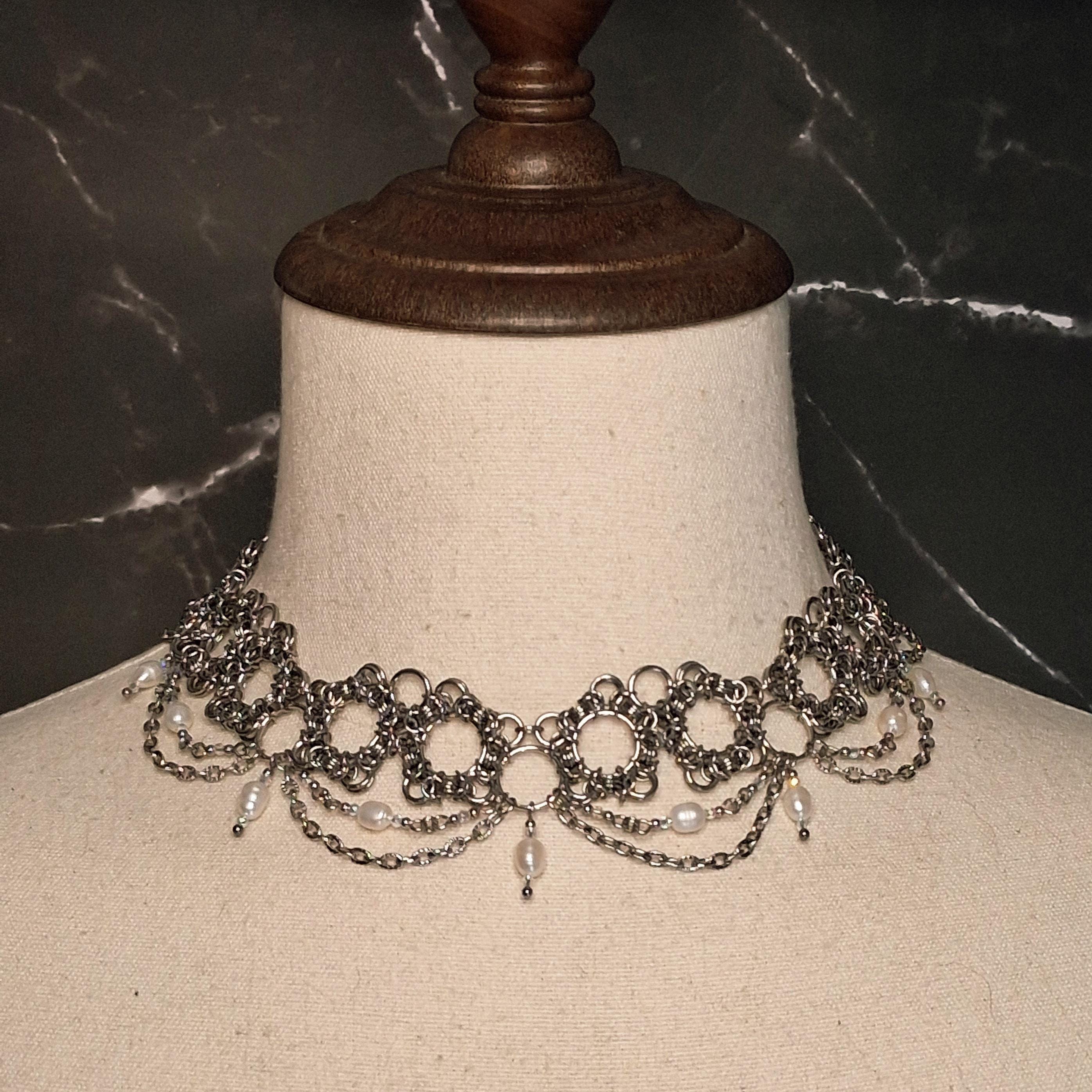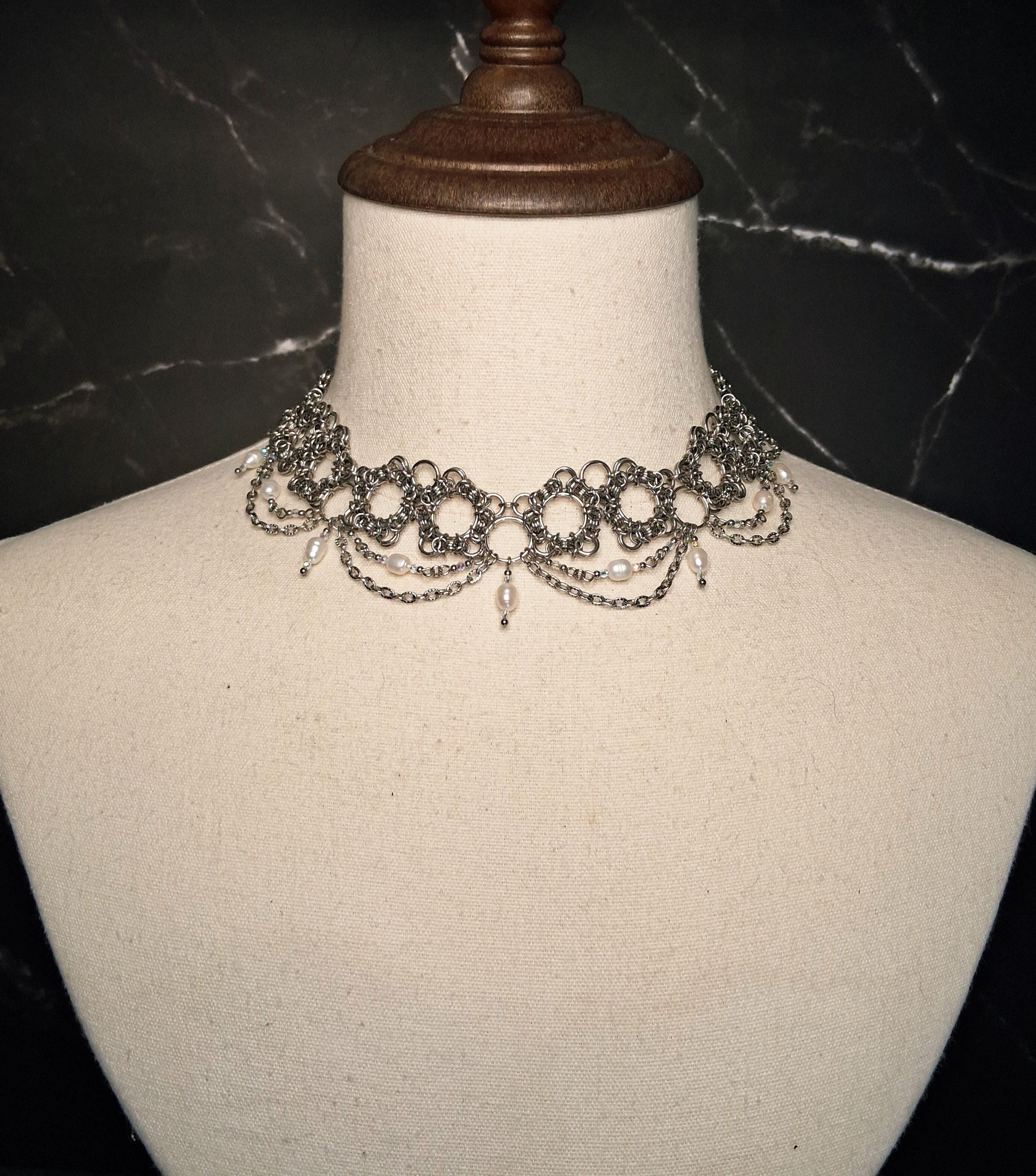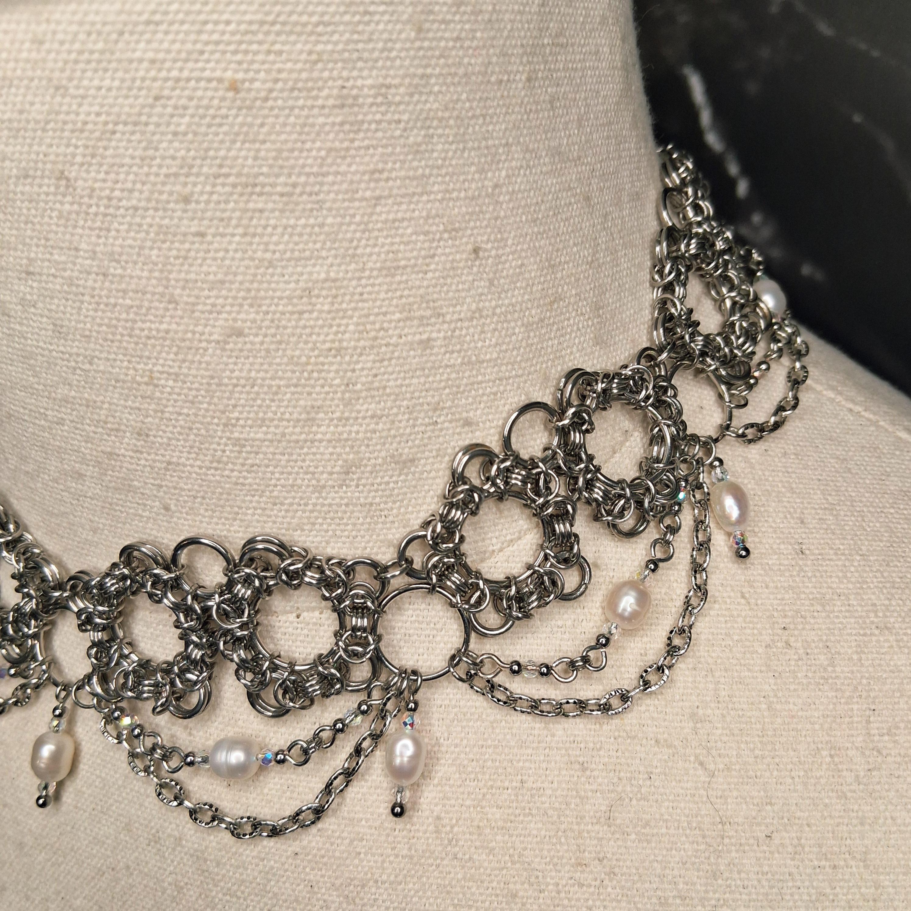 This handcrafted Byzantine chainmaille choker is built from durable stainless steel and detailed with genuine freshwater pearls and glass bead accents. Intricate ringwork creates bold circular motifs across the neckline, while layered chain draping and pearl drops add movement and softness.