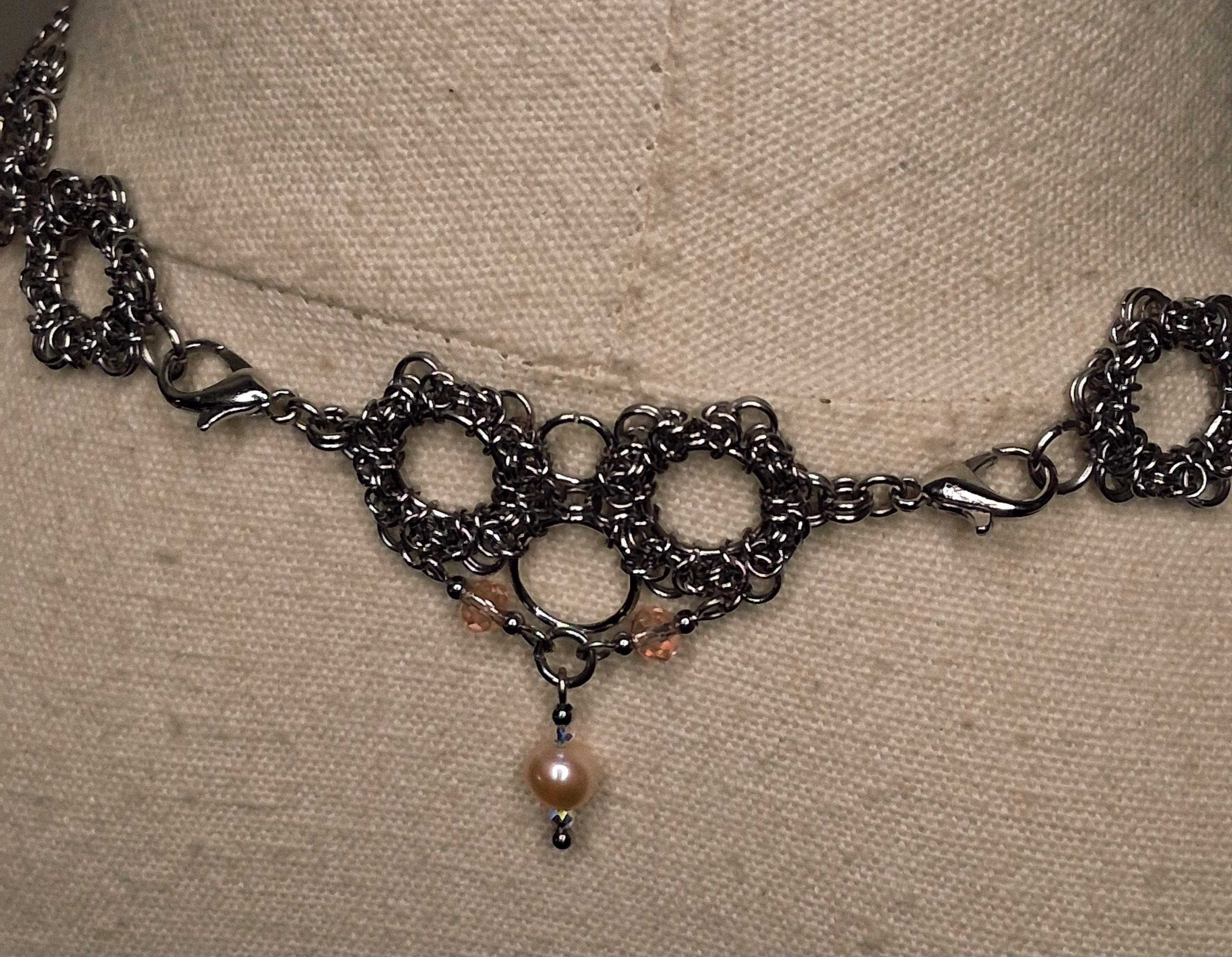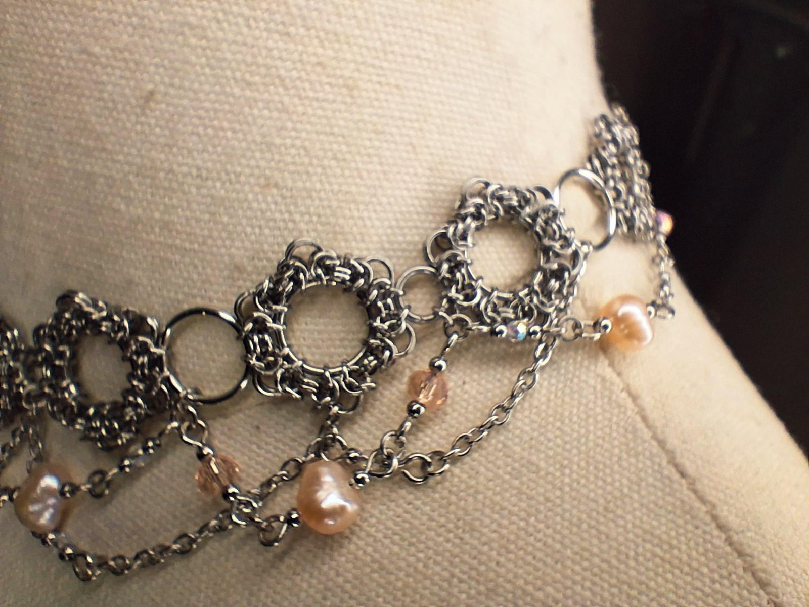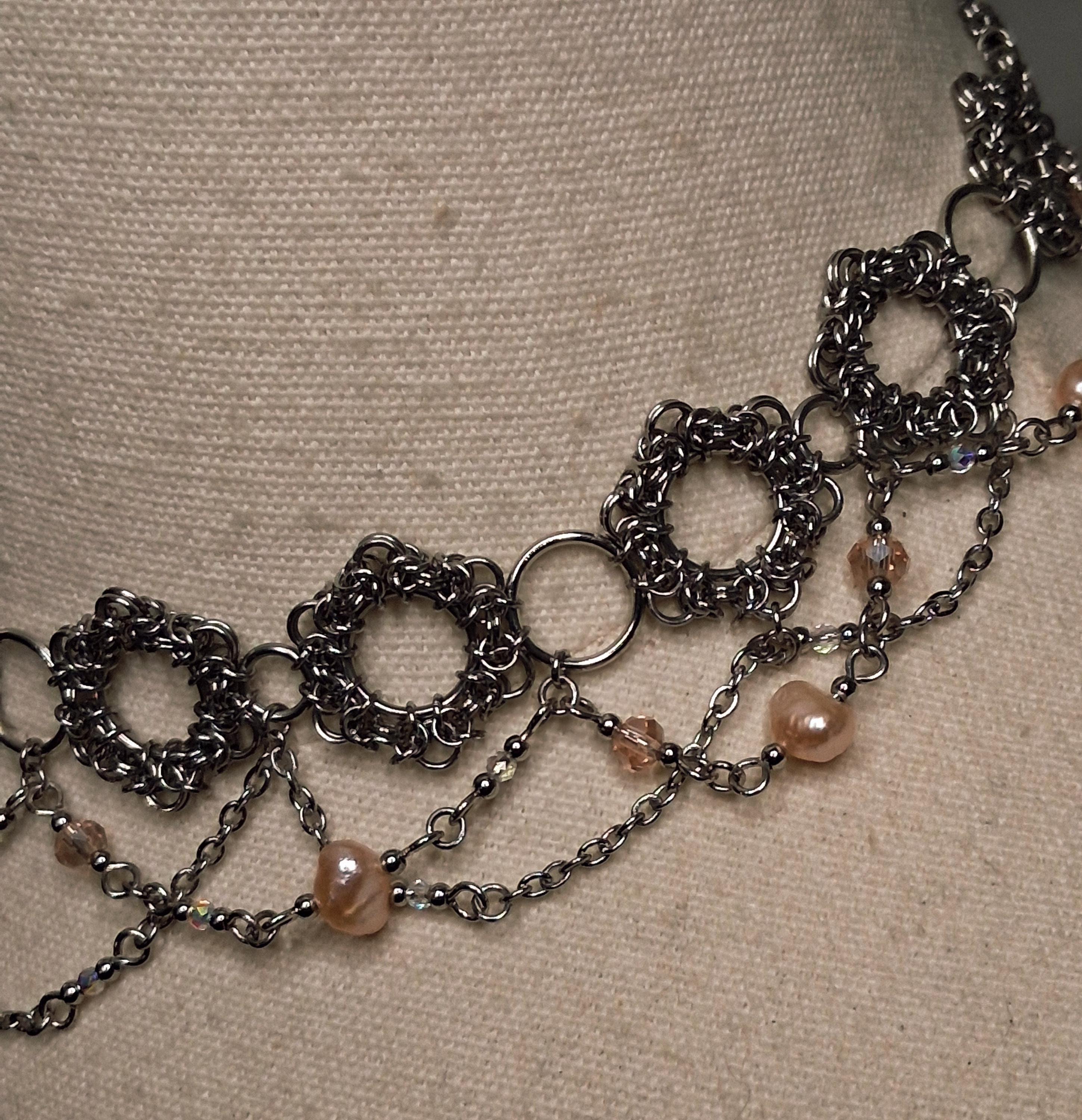 This 14-inch choker is a lightweight “armor” design — intricate stainless steel chainmaille circles softened by blush freshwater pearls and fine draped chains.