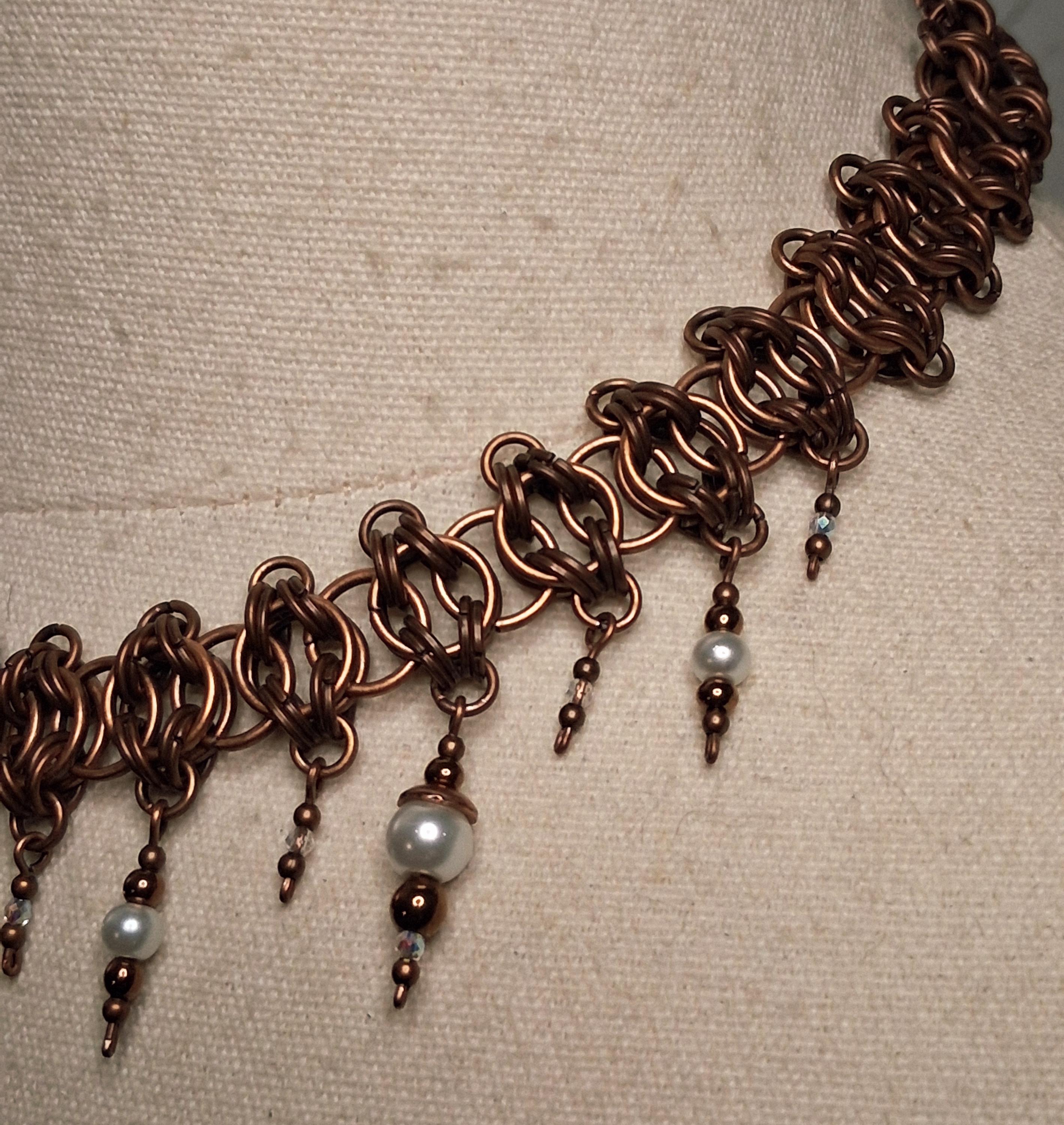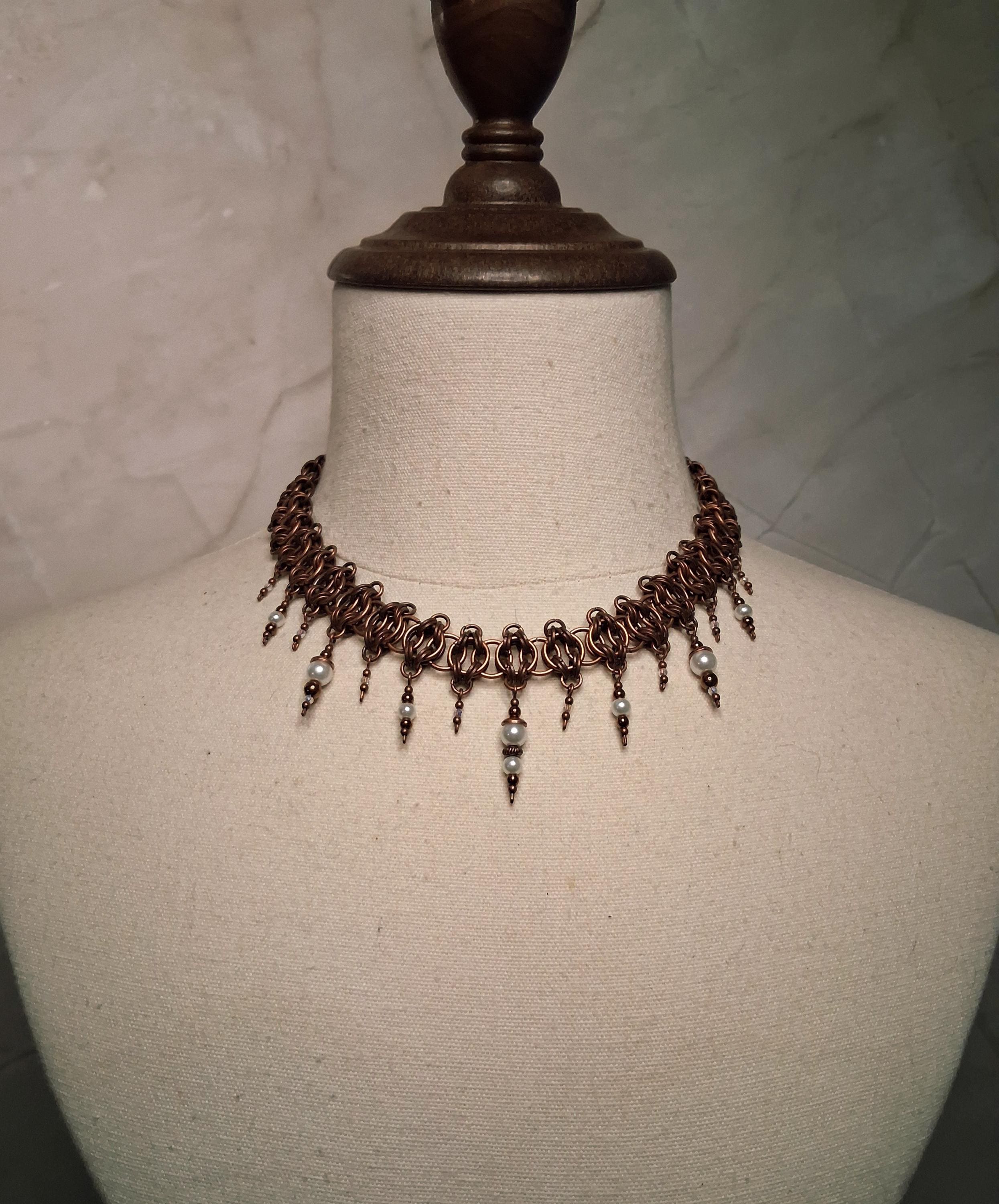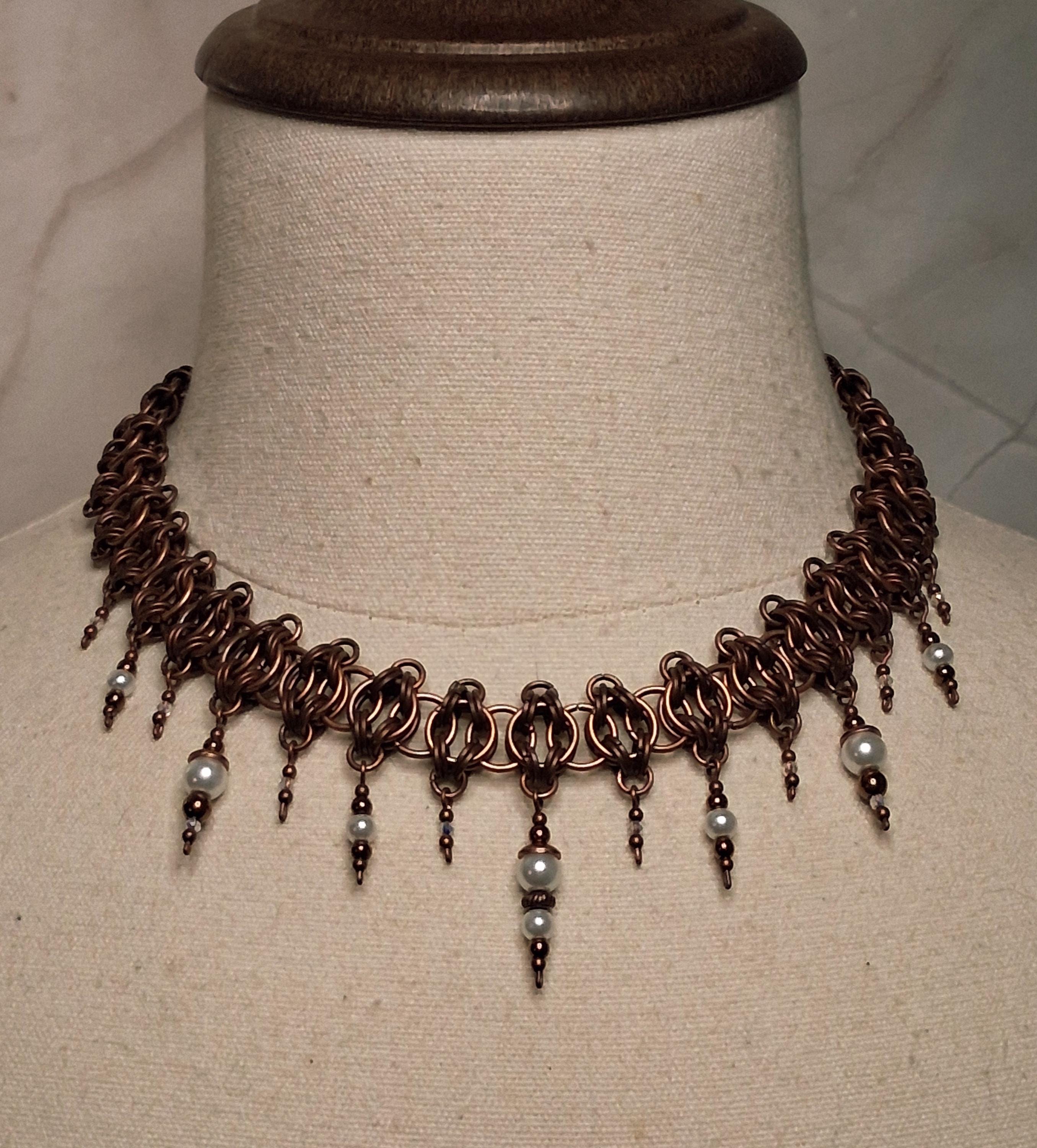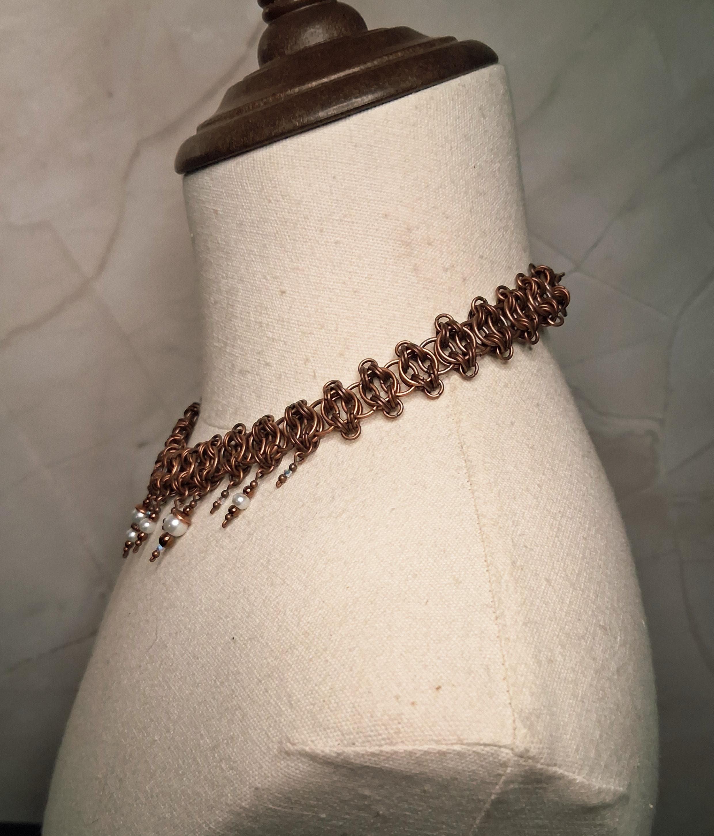 Handwoven in a structured Byzantine-inspired weave, this piece sits firmly at the collarbone with intention. The antique copper tones give it an old-world presence, while the copper hematite and glass pearl fringe adds movement and depth.