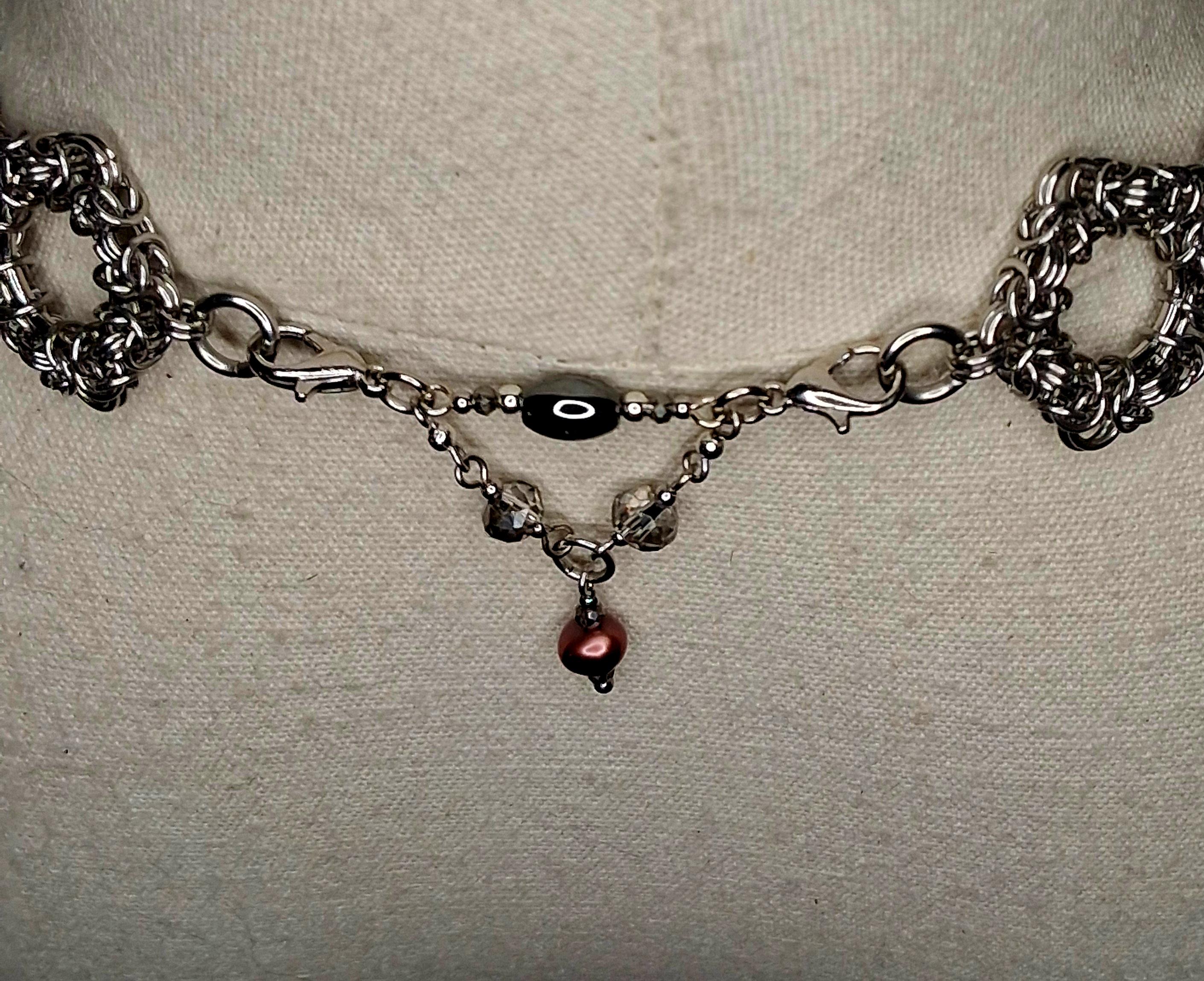 This handcrafted 15-inch choker blends architectural Byzantine chainmaille with the soft, organic beauty of natural Flower Agate. Stainless steel provides durability and strength, while hematite and freshwater pearls create a balance of protection and grace.