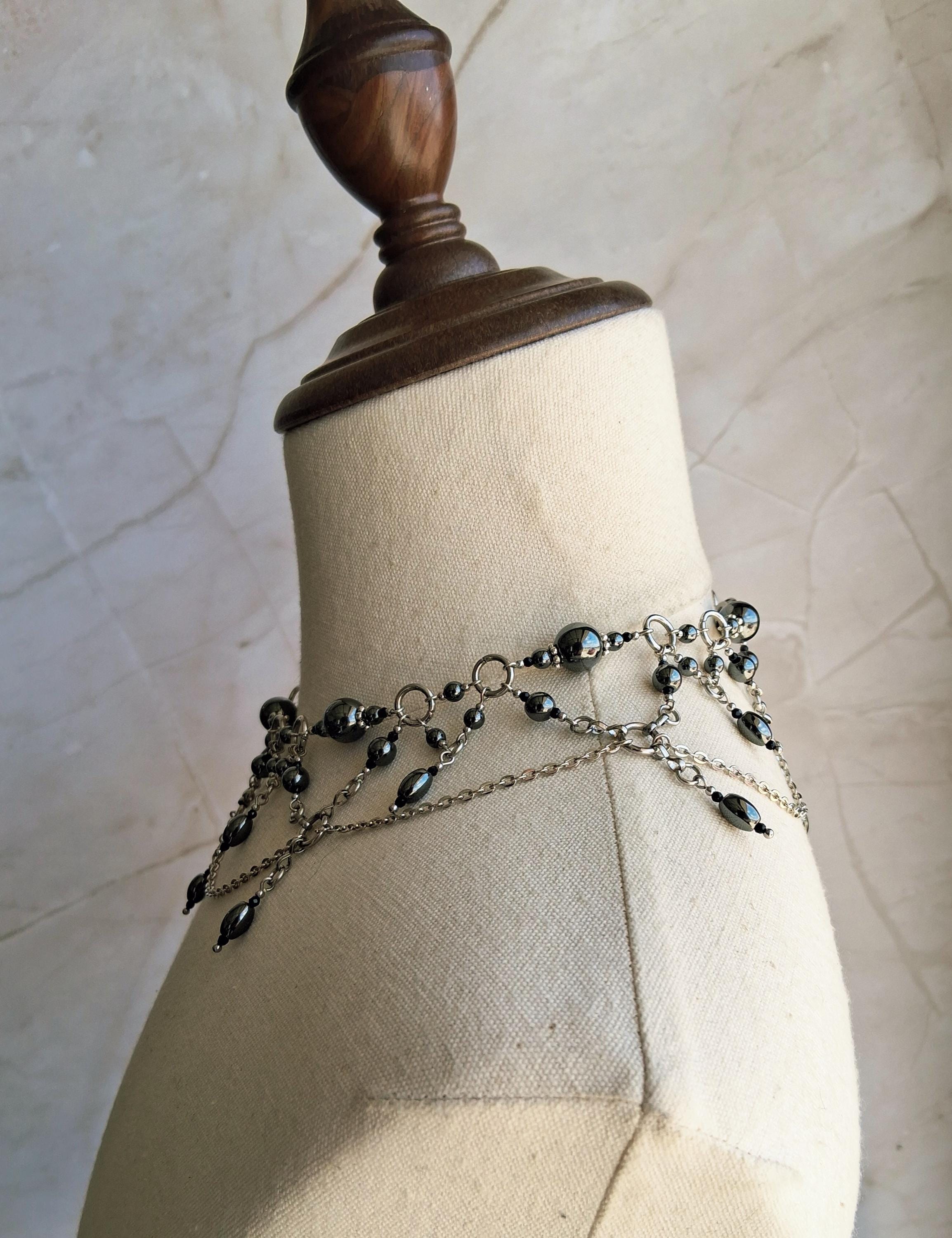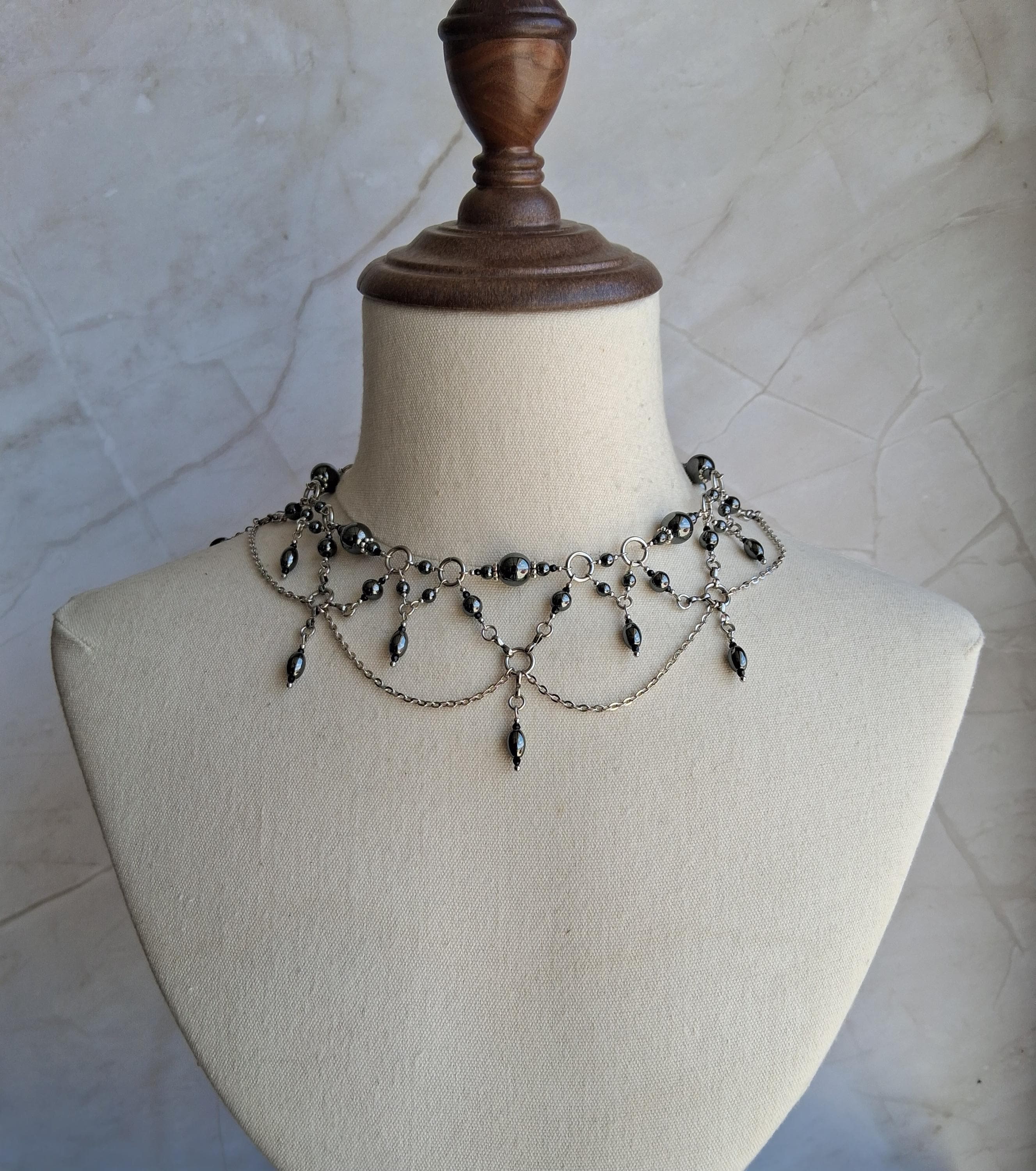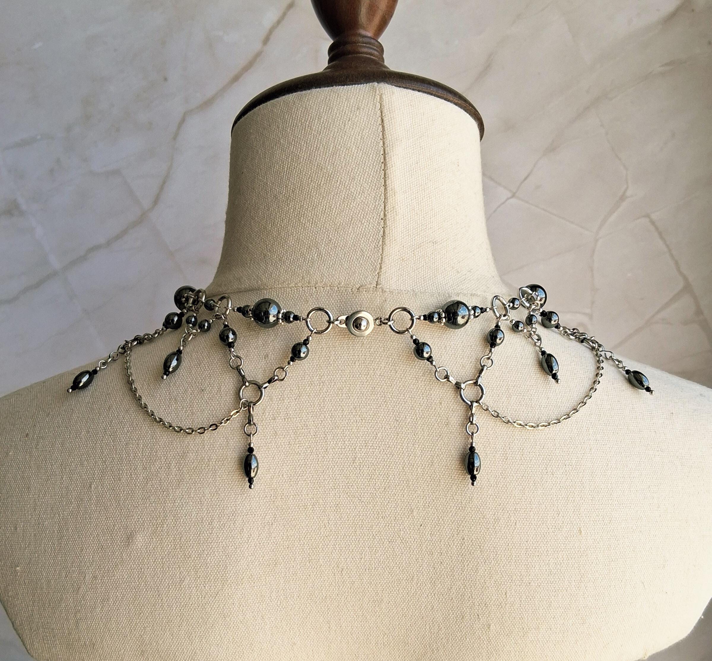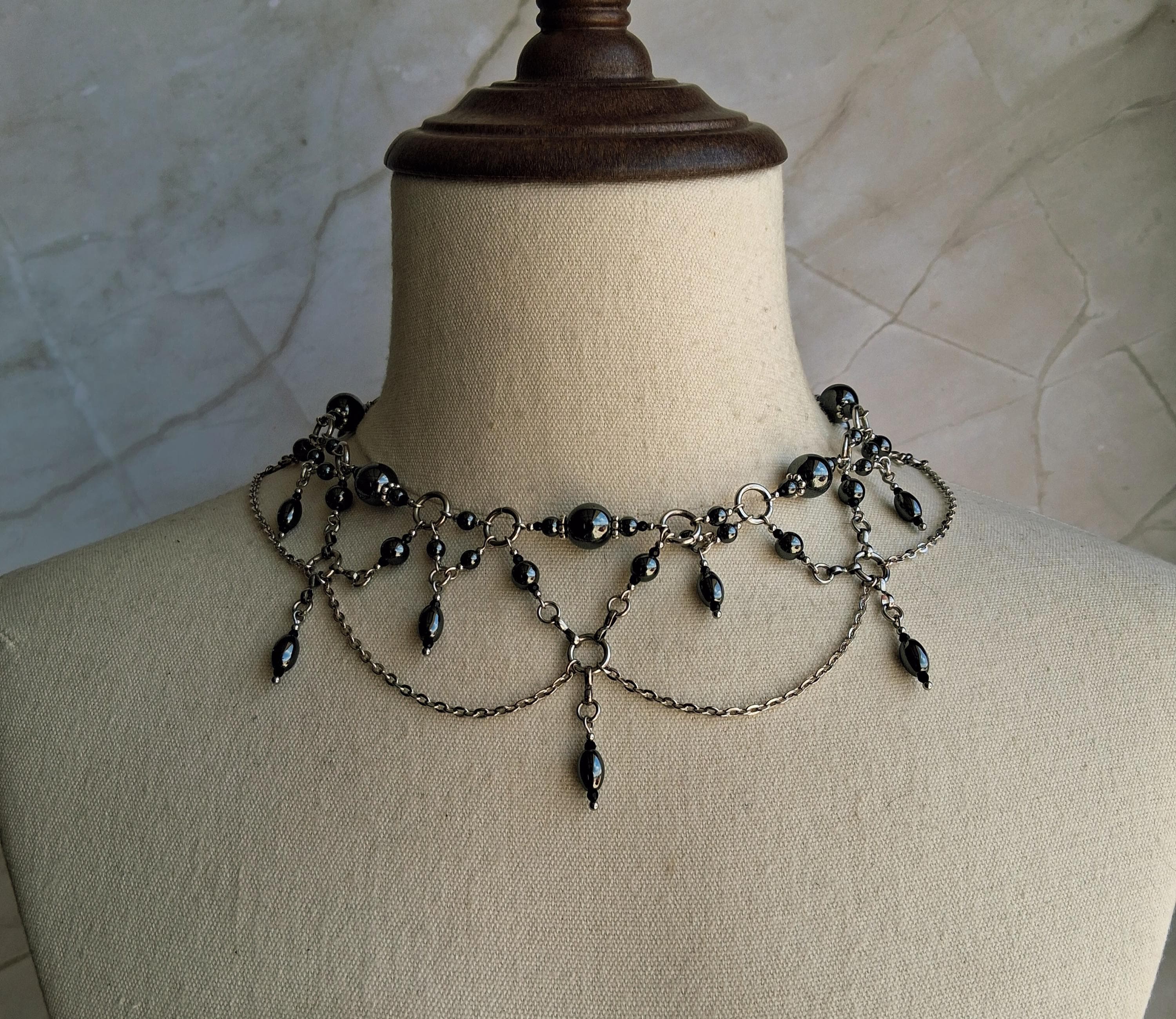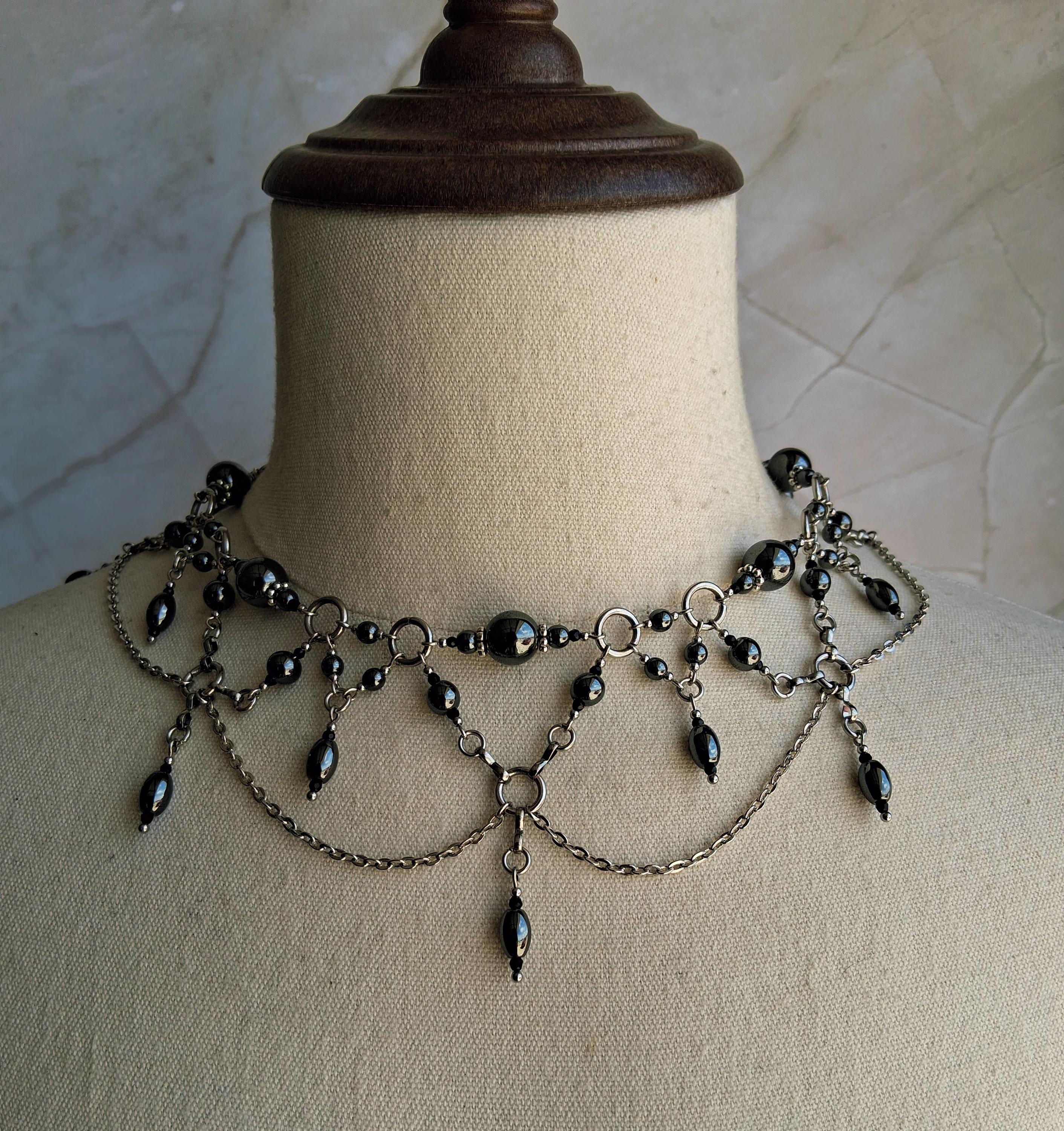 This Victorian-inspired choker features polished hematite beads and glass accents suspended from stainless steel chainwork in a dramatic draped silhouette. The layered chain swags and dangling hematite drops create movement with every turn of the head — subtle, but powerful.