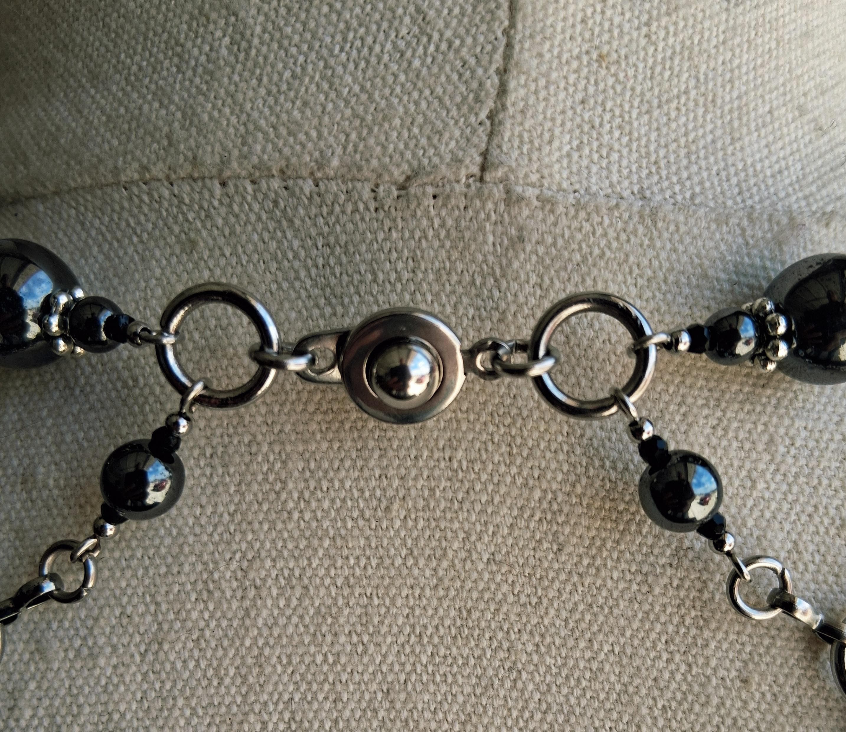 The cool steel paired with the deep metallic sheen of hematite gives this piece a gothic elegance that feels both antique and modern. Perfect for layering with lace, velvet, structured blazers, or bare collarbones.