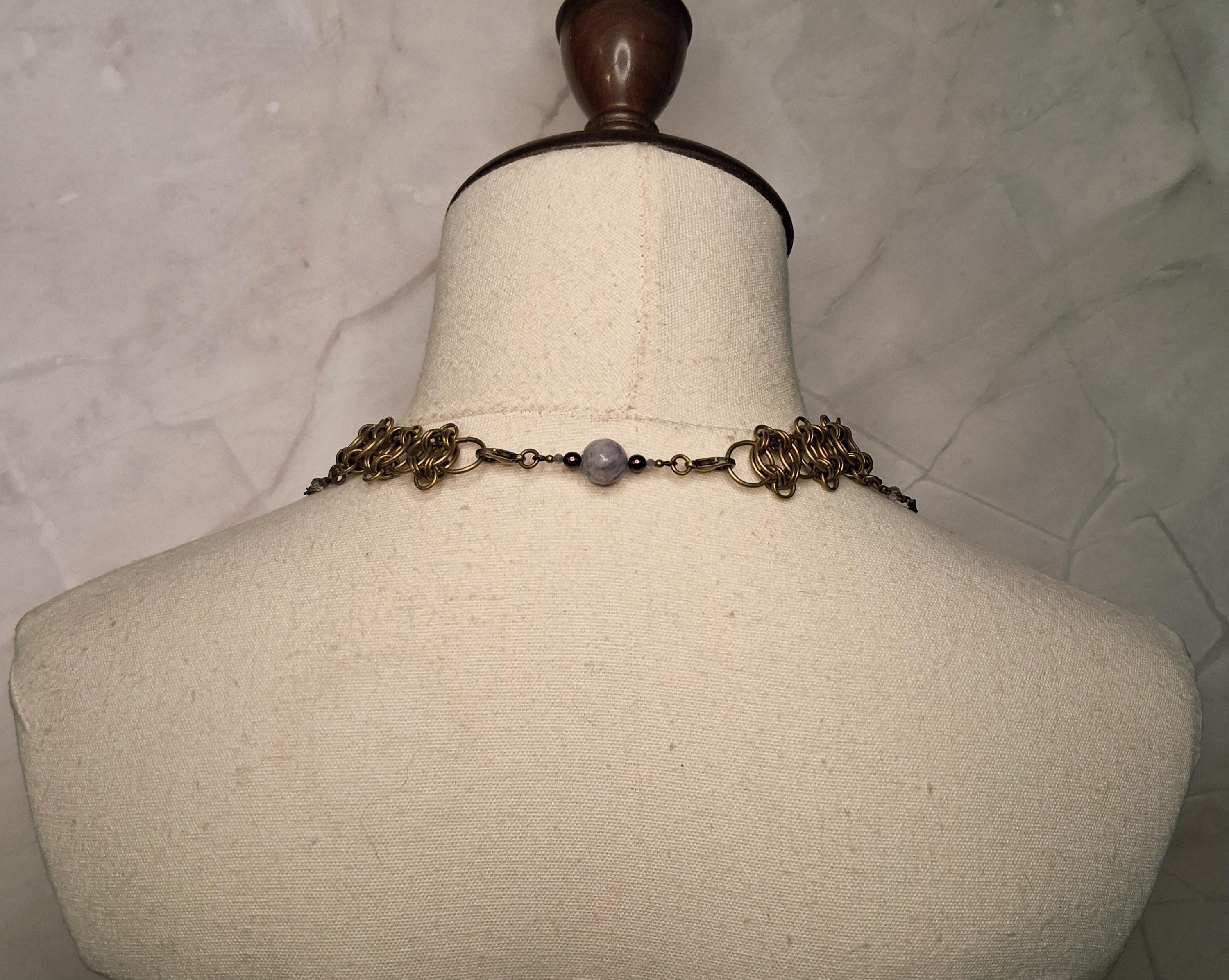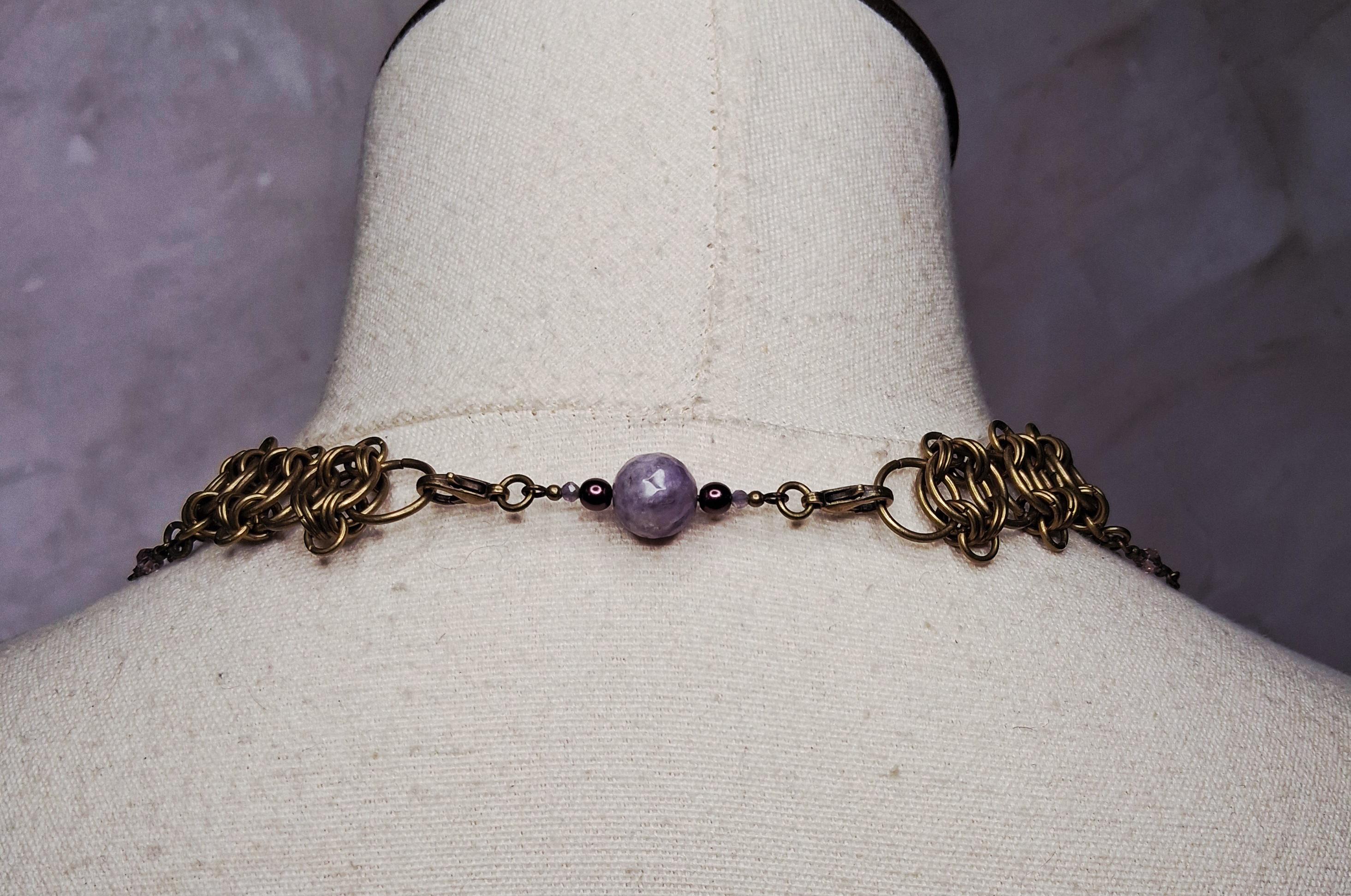 Details: *15 inch choker length (designed to sit close around the base of the neck, not adjustable) *Bronze tone findings and chainmail links for a warm, antique finish *Faceted amethyst beads as the main focal stones, accented with coordinating glass beads *Layered draped chains and center drop that create a lavish, Victorian‑inspired silhouette *Double lobster claw clasp at the back for extra security and an elegant finishing detail *Lightweight enough for extended wear while still feeling substantial and luxurious