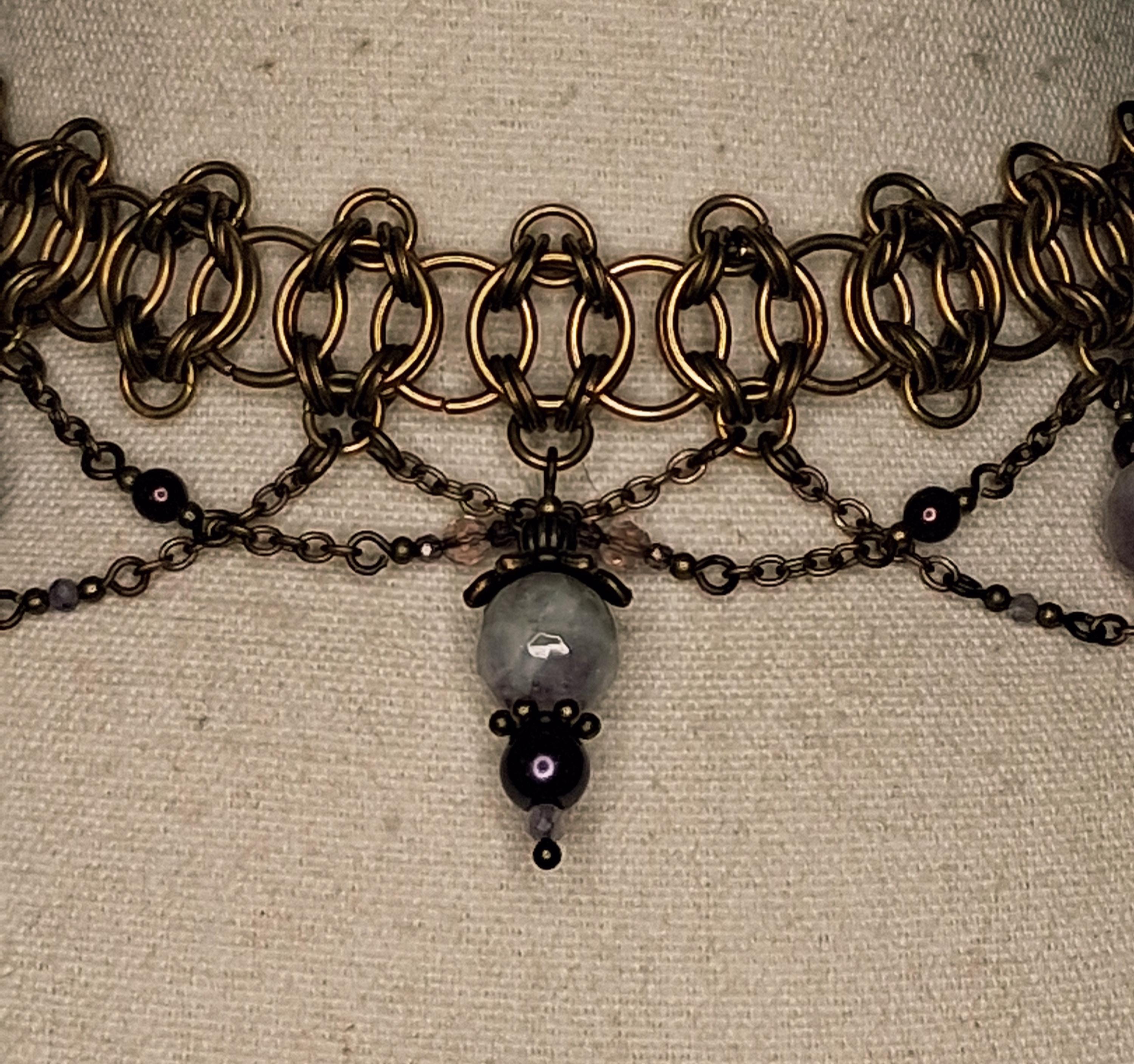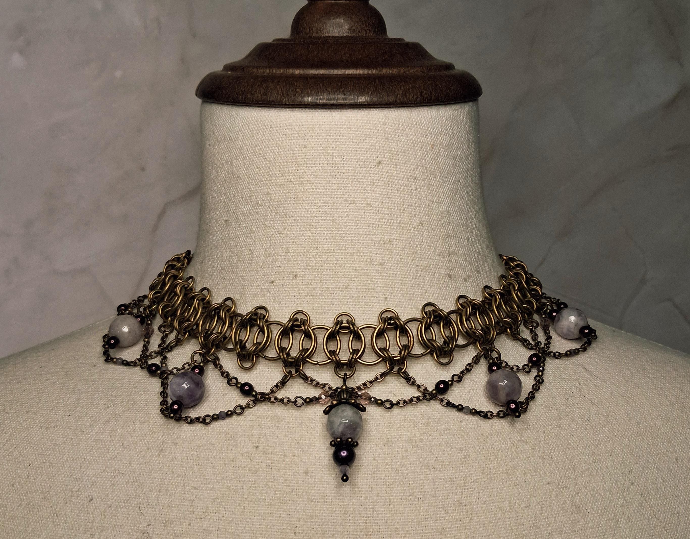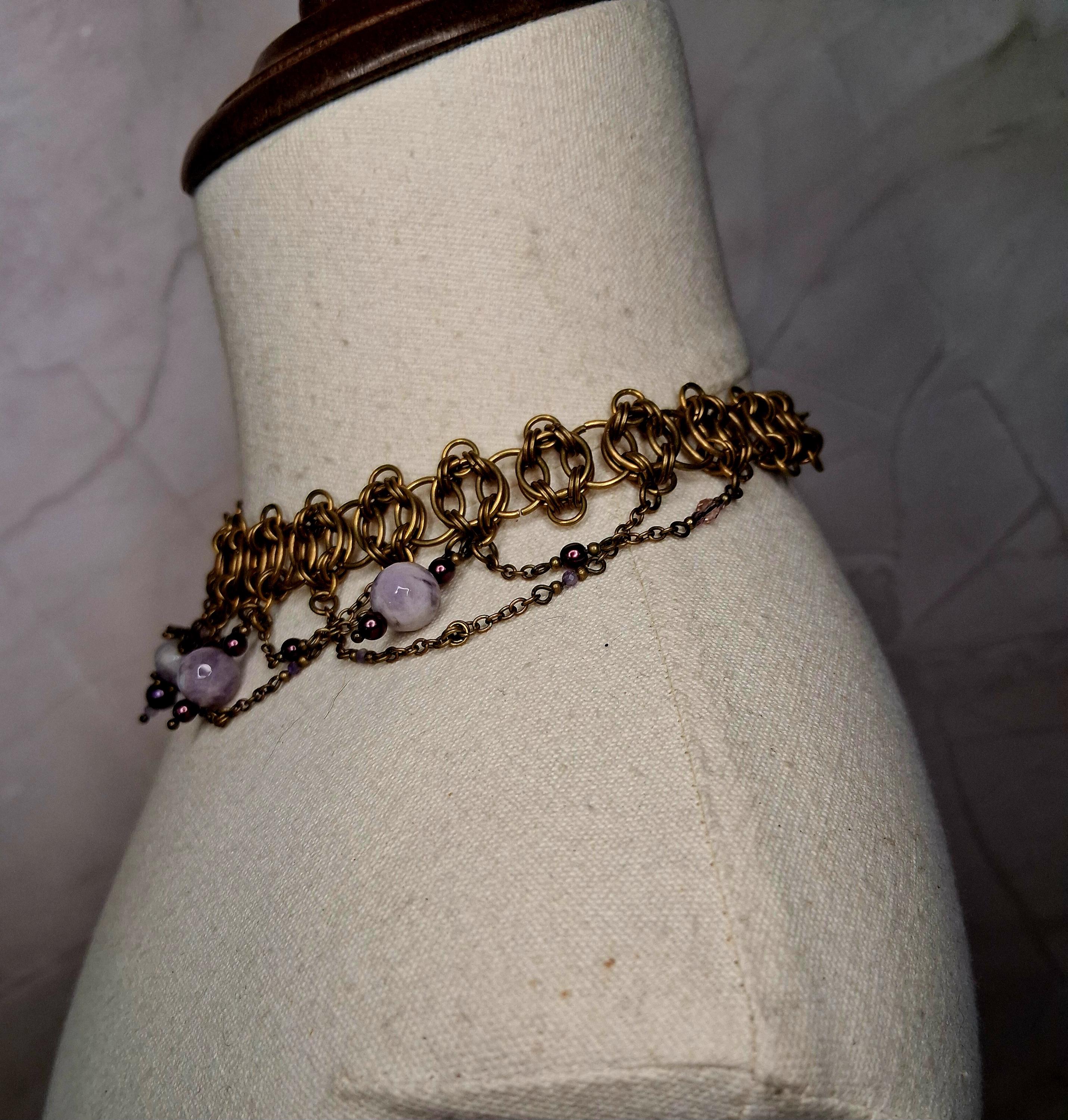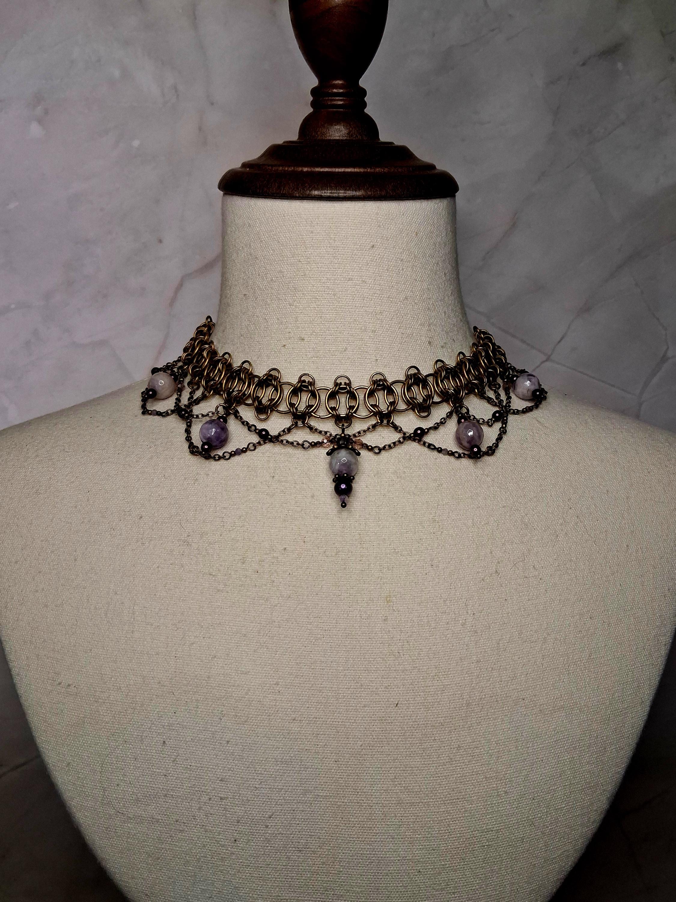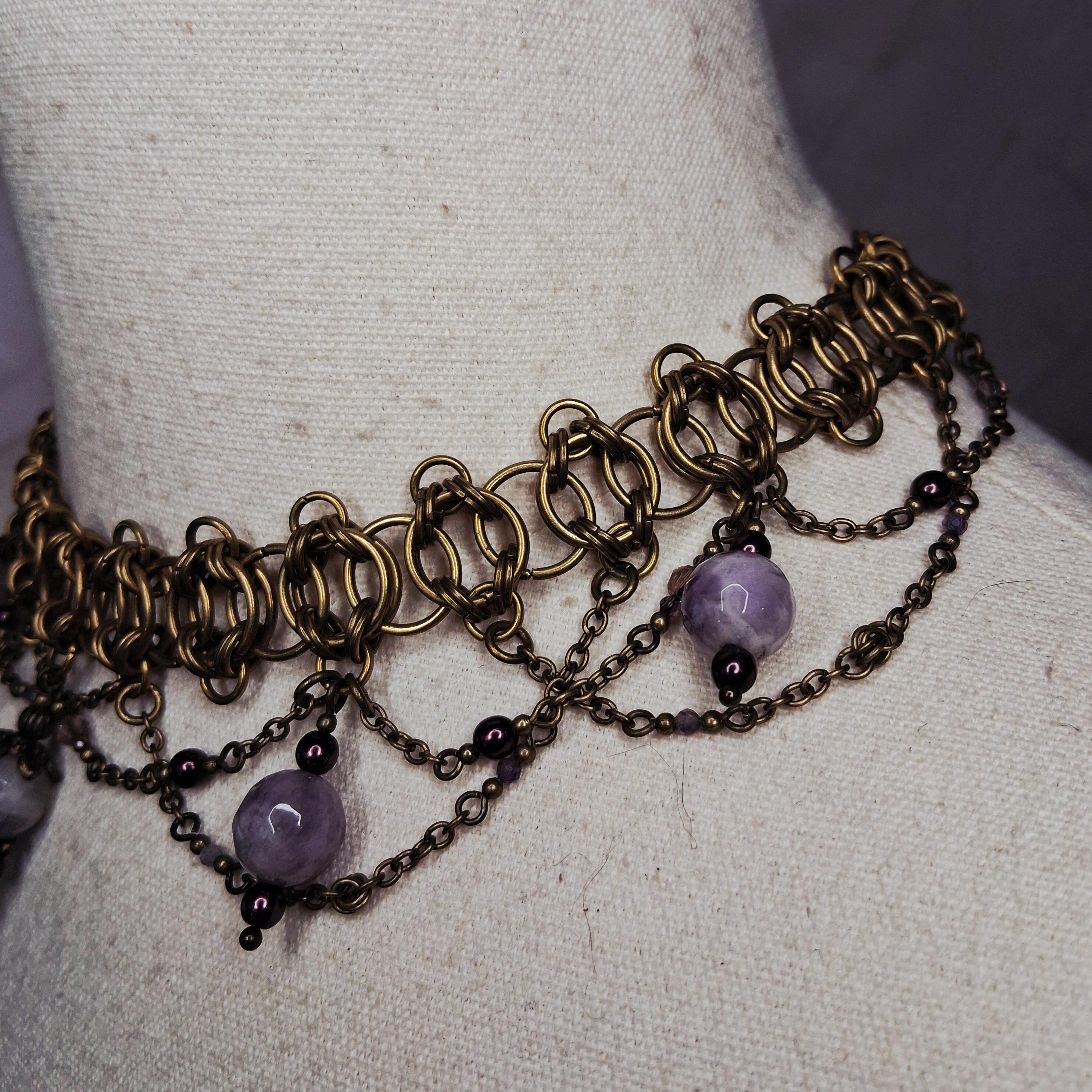 This dramatic bronze chainmail choker is handwoven and draped with amethyst and glass beads for a rich, antique gothic look.