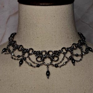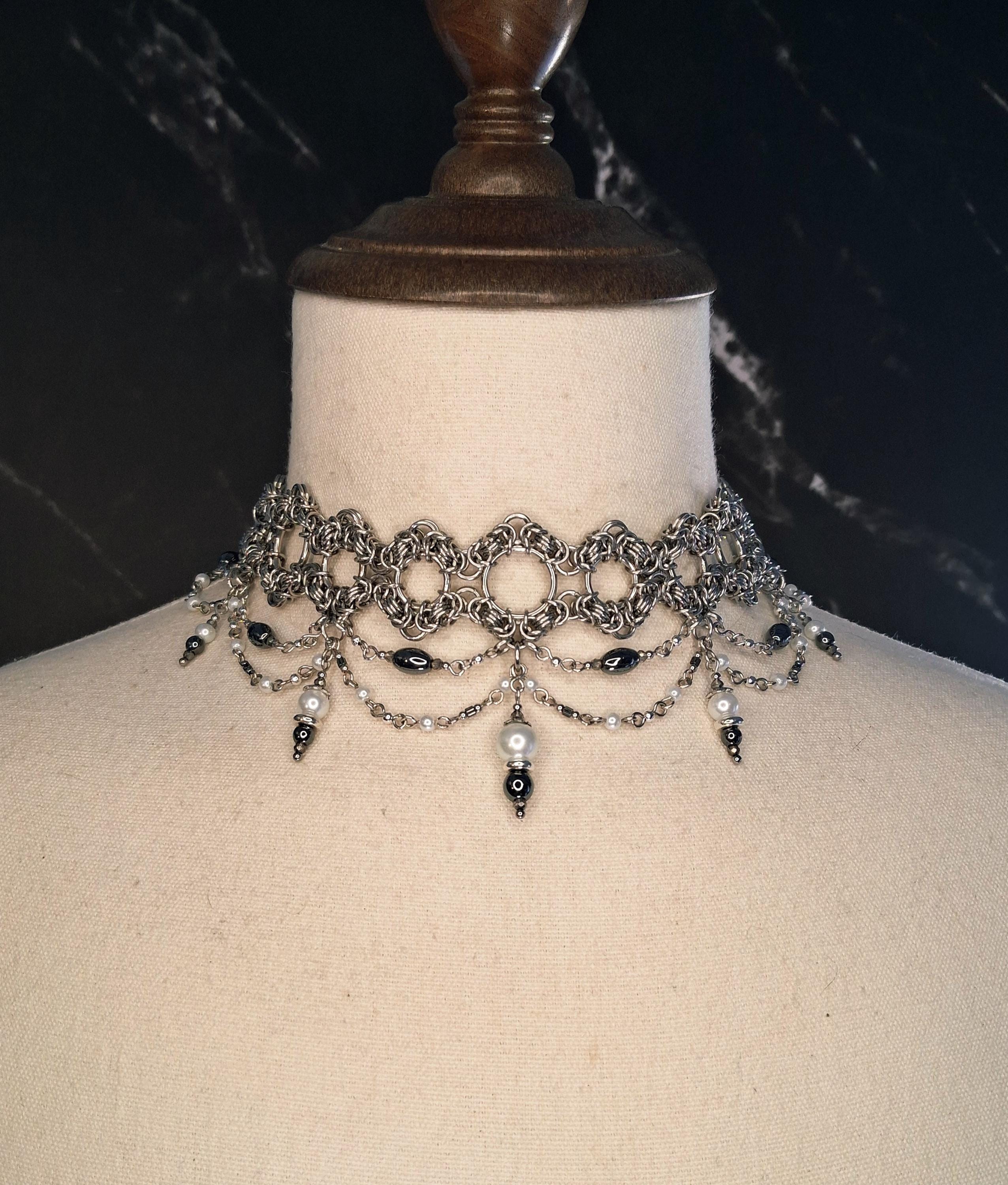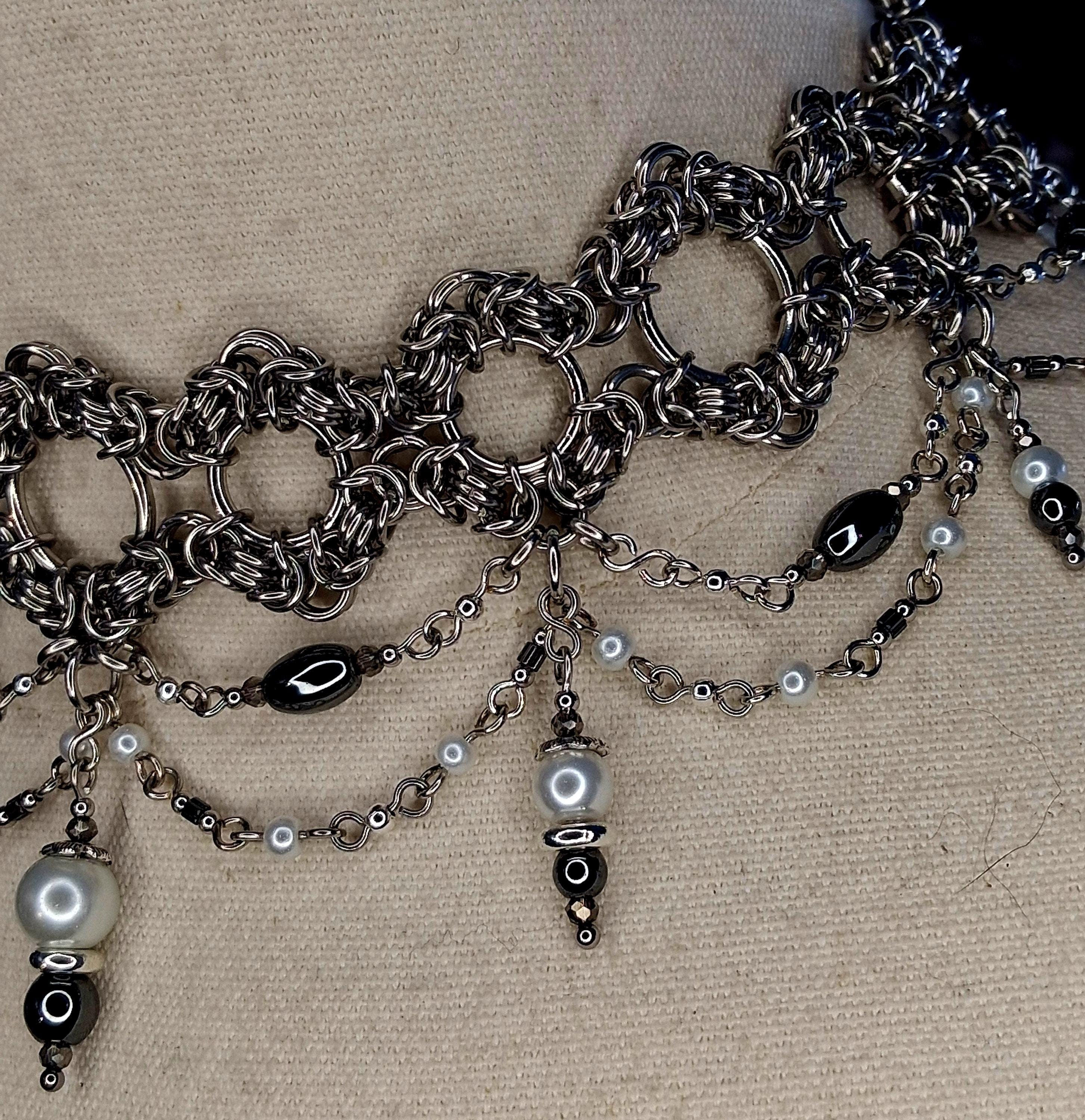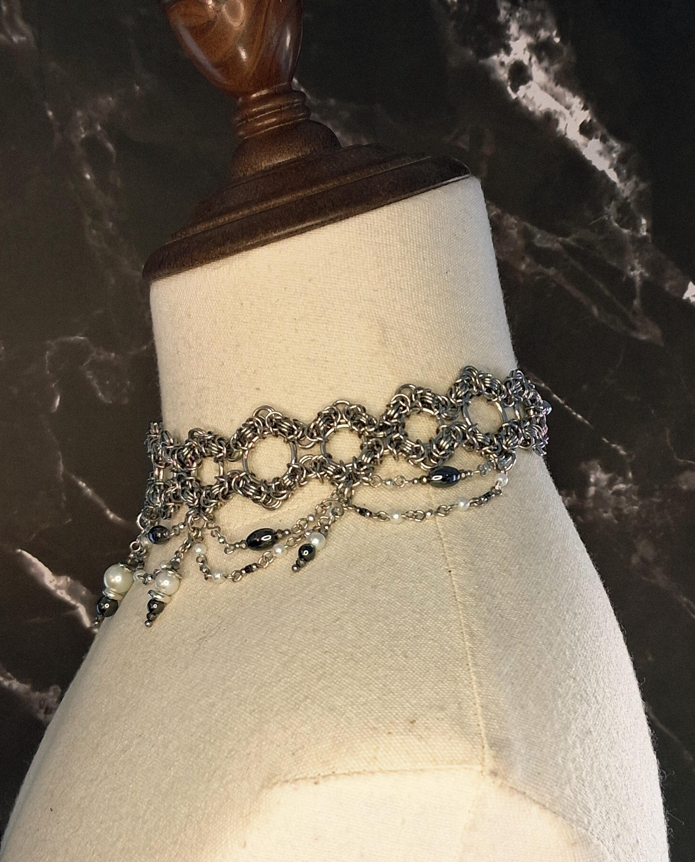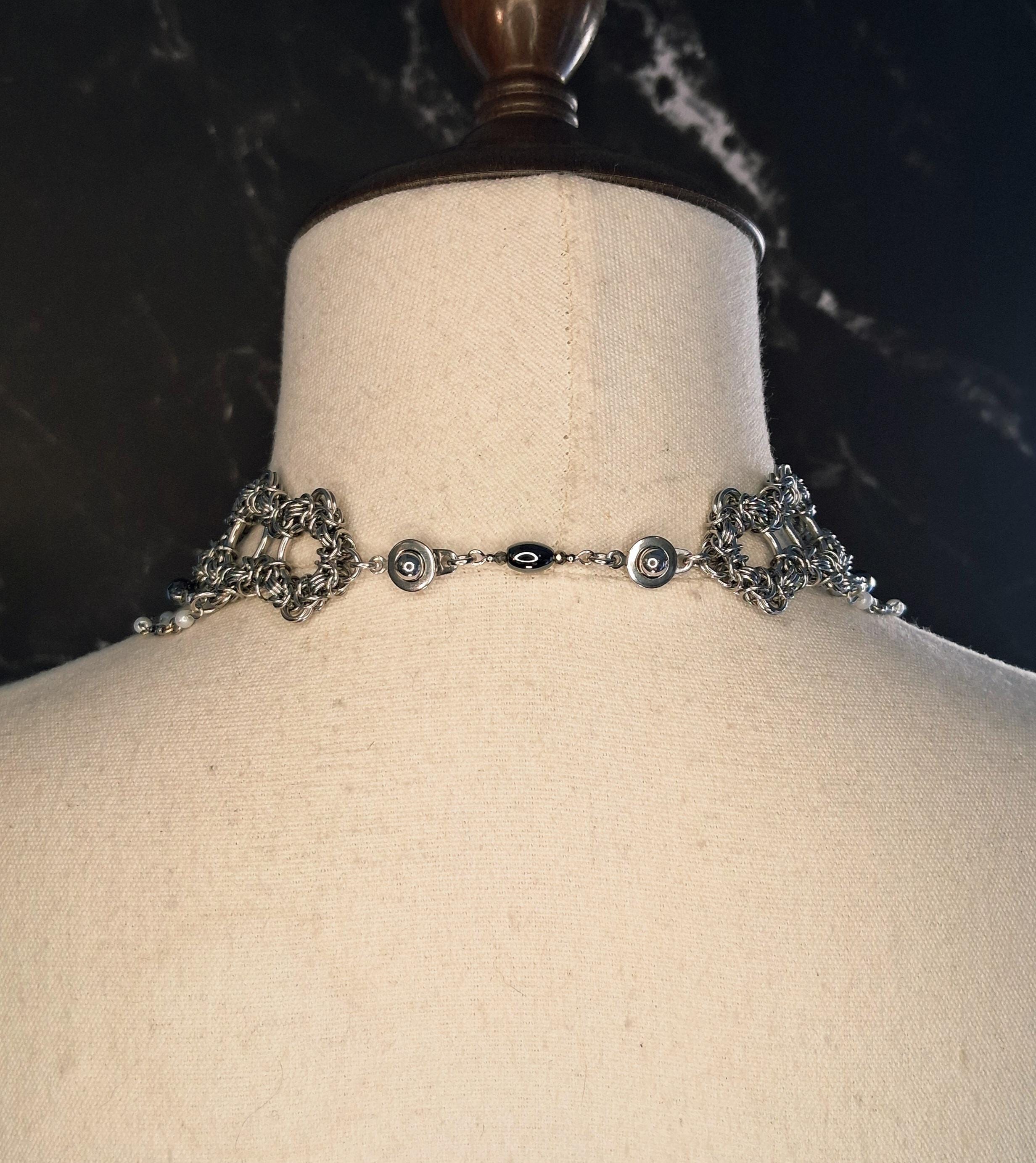 This handwoven Byzantine chainmail choker is crafted in stainless steel and accented with hematite and glass beads for a dark, elegant drape.