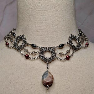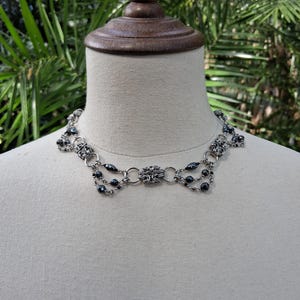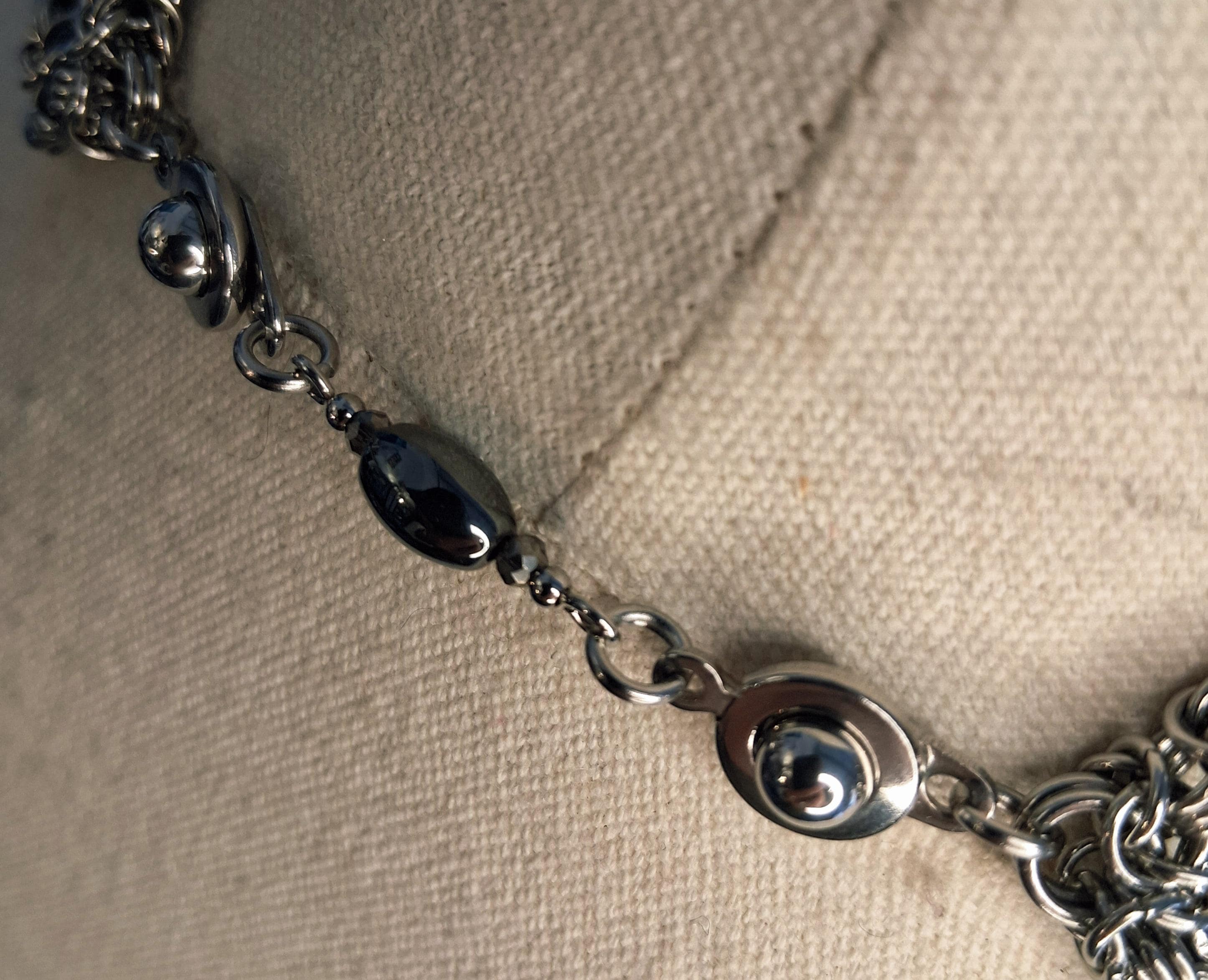 Details: *Stainless steel findings and chainmail components. � *Hematite beads with coordinating glass bead accents. � *Byzantine detail with draped chain embellishment. � *14 inches long. � *Not adjustable. � *Decorative double button clasp detail at the back. �