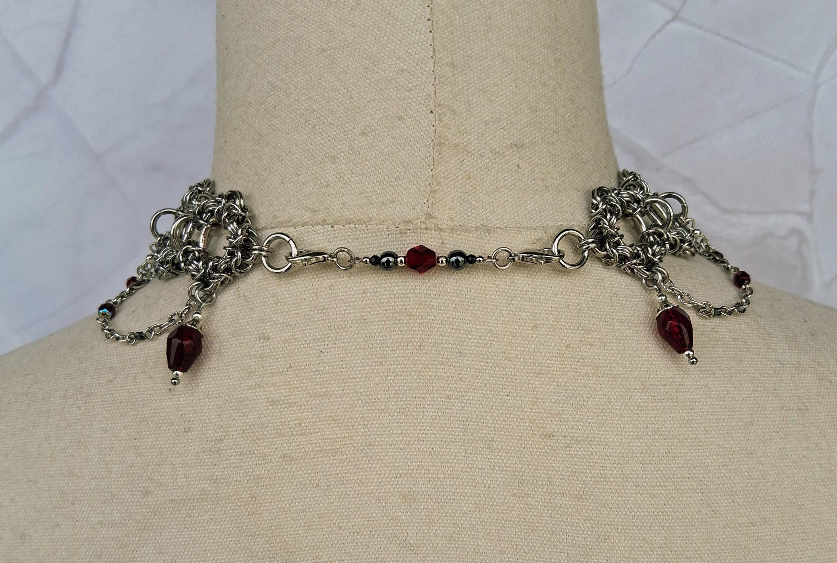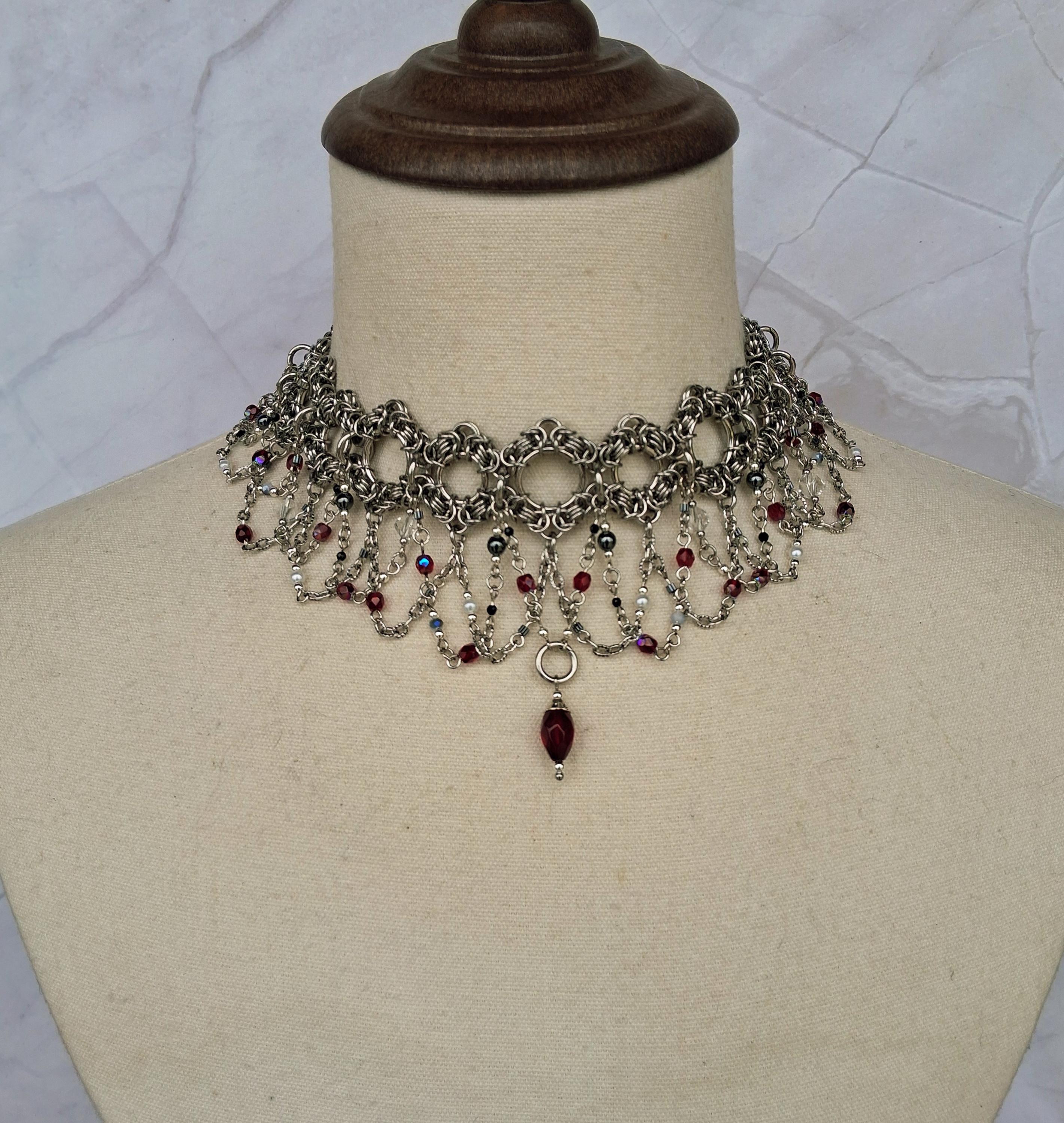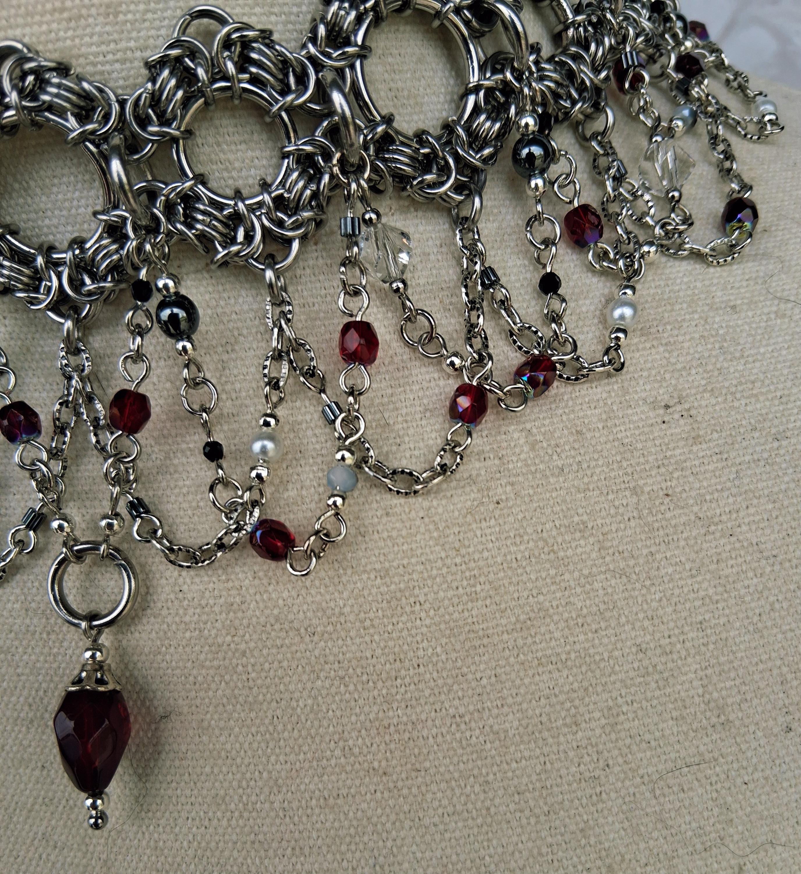 This Byzantine chainmaille collar arrives in deep crimson and shadow — a hand-woven stainless steel band cascading into swag chains rich with faceted red glass beads, metallic hematite, and a signature center drop that lands like a period at the end of a very compelling sentence. The crimson palette against cool silver steel is pure Victorian drama, distilled into wearable form.