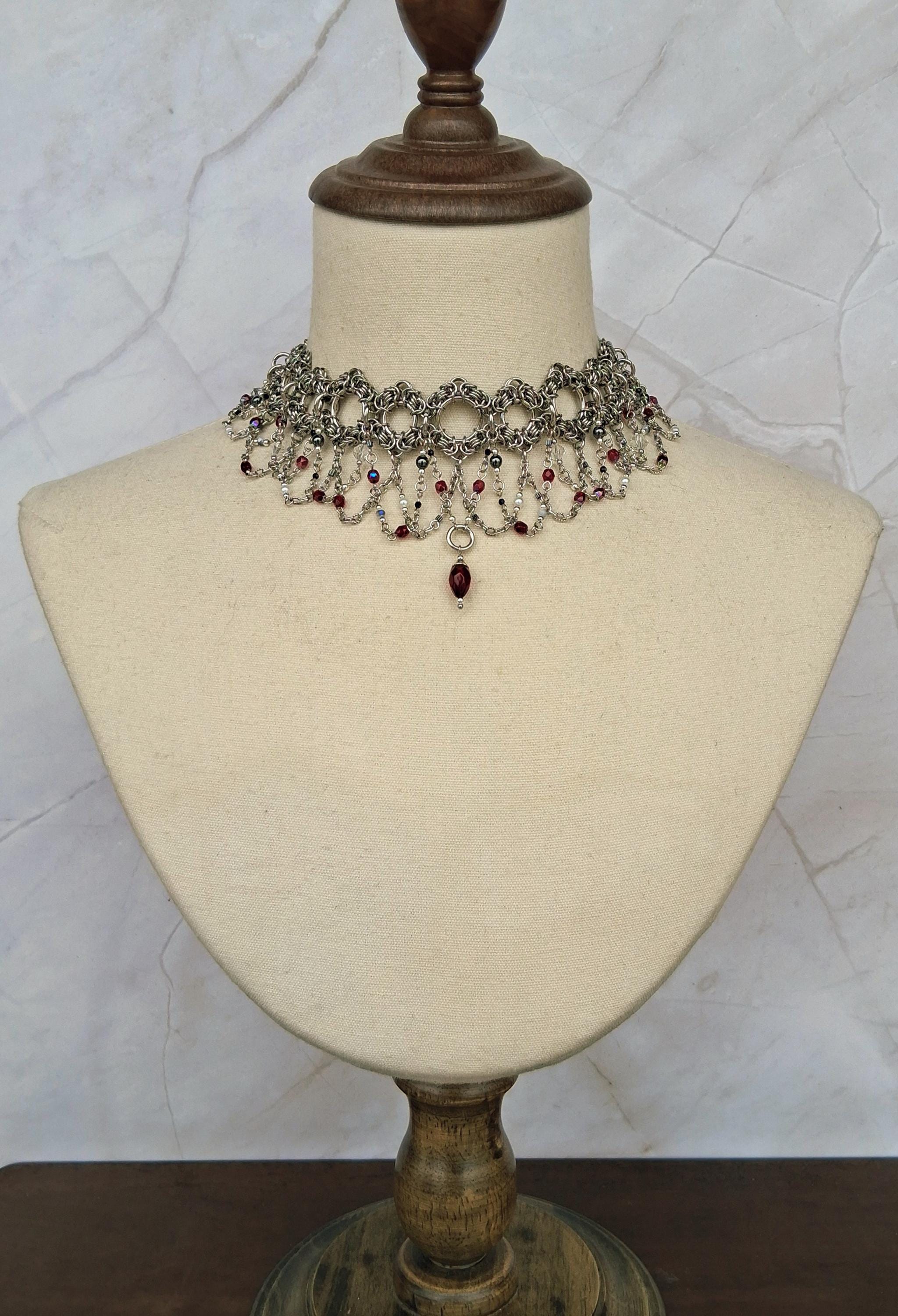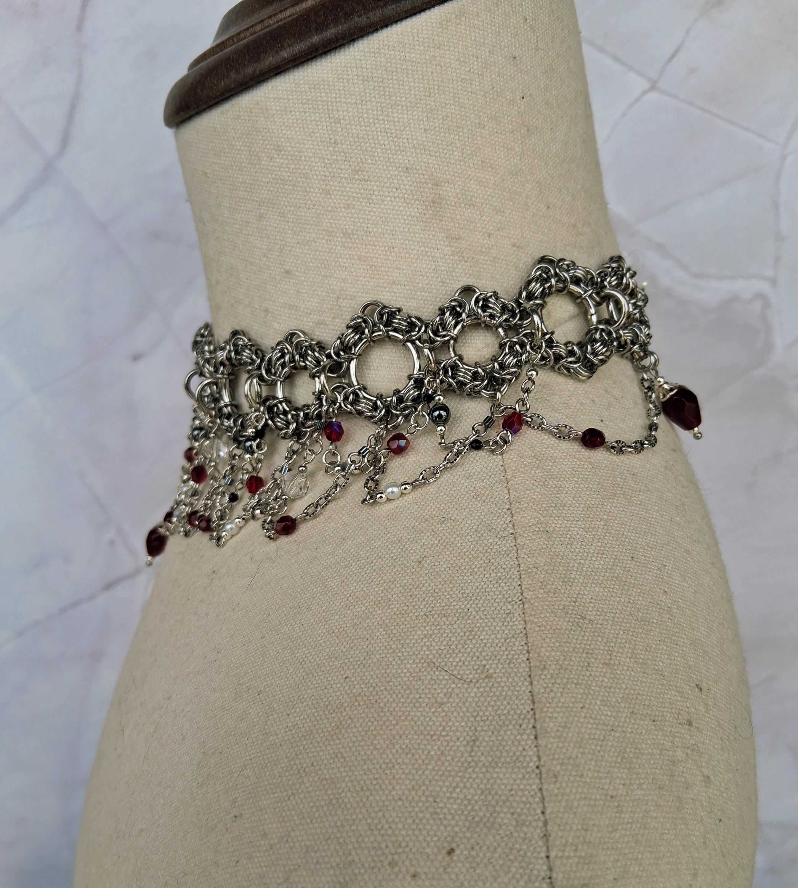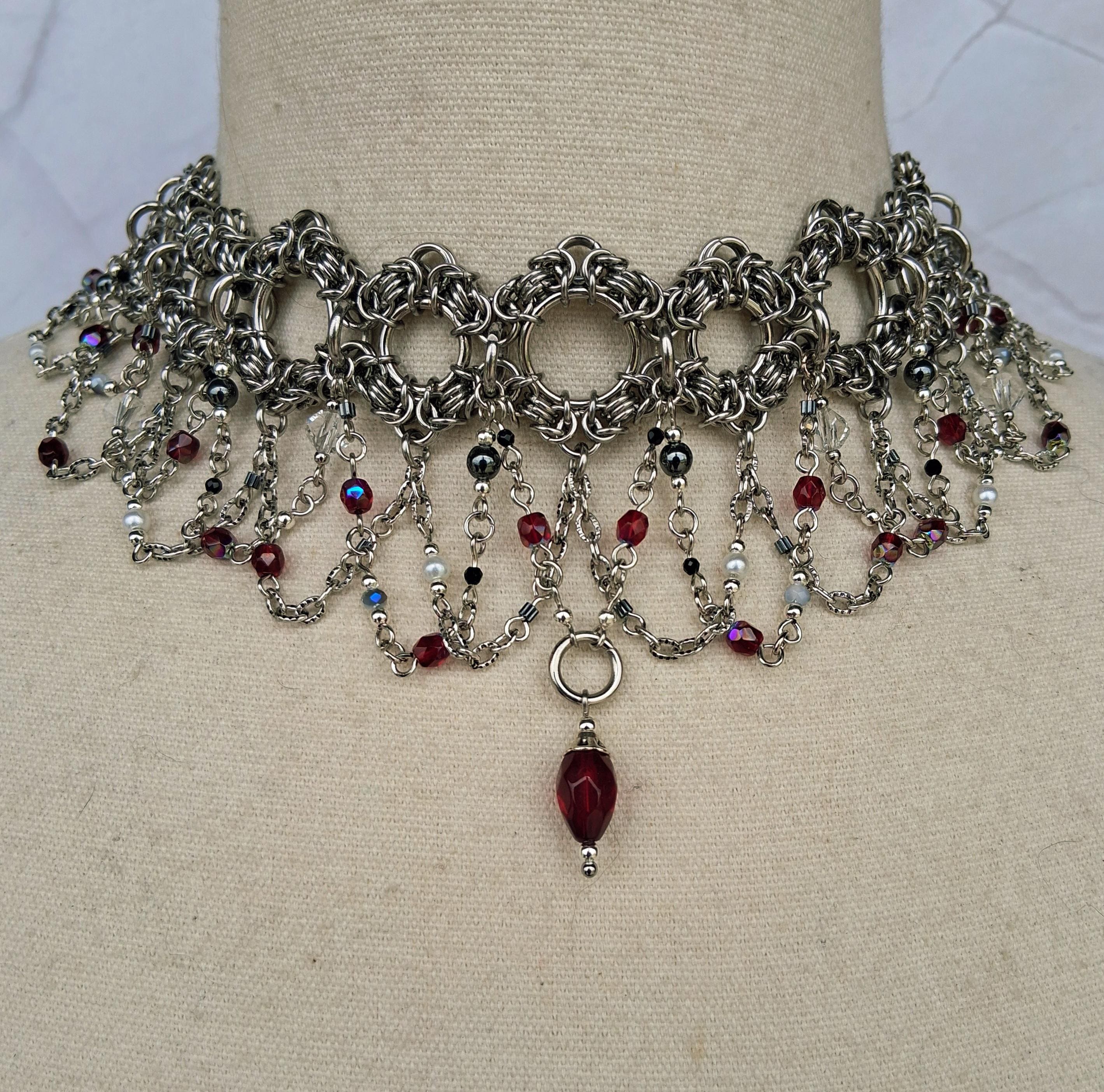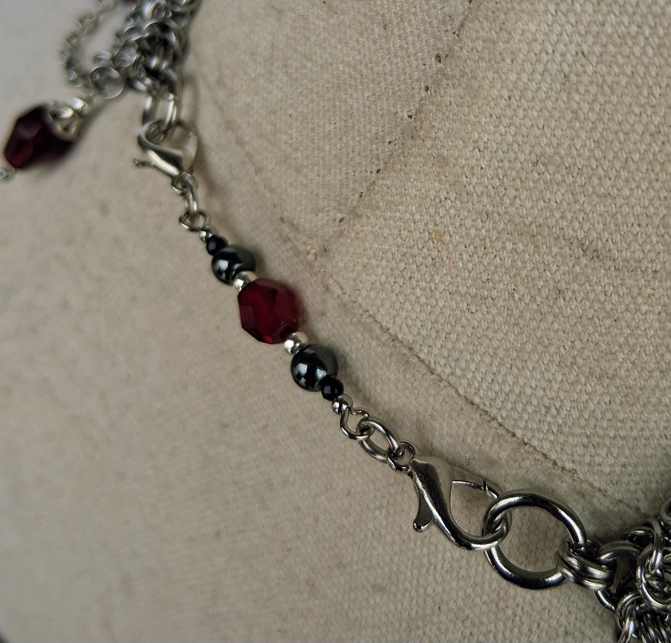 This Byzantine chainmaille collar arrives in deep crimson and shadow — a hand-woven stainless steel band cascading into swag chains rich with faceted red glass beads, metallic hematite, and a signature center drop that lands like a period at the end of a very compelling sentence. The crimson palette against cool silver steel is pure Victorian drama, distilled into wearable form.